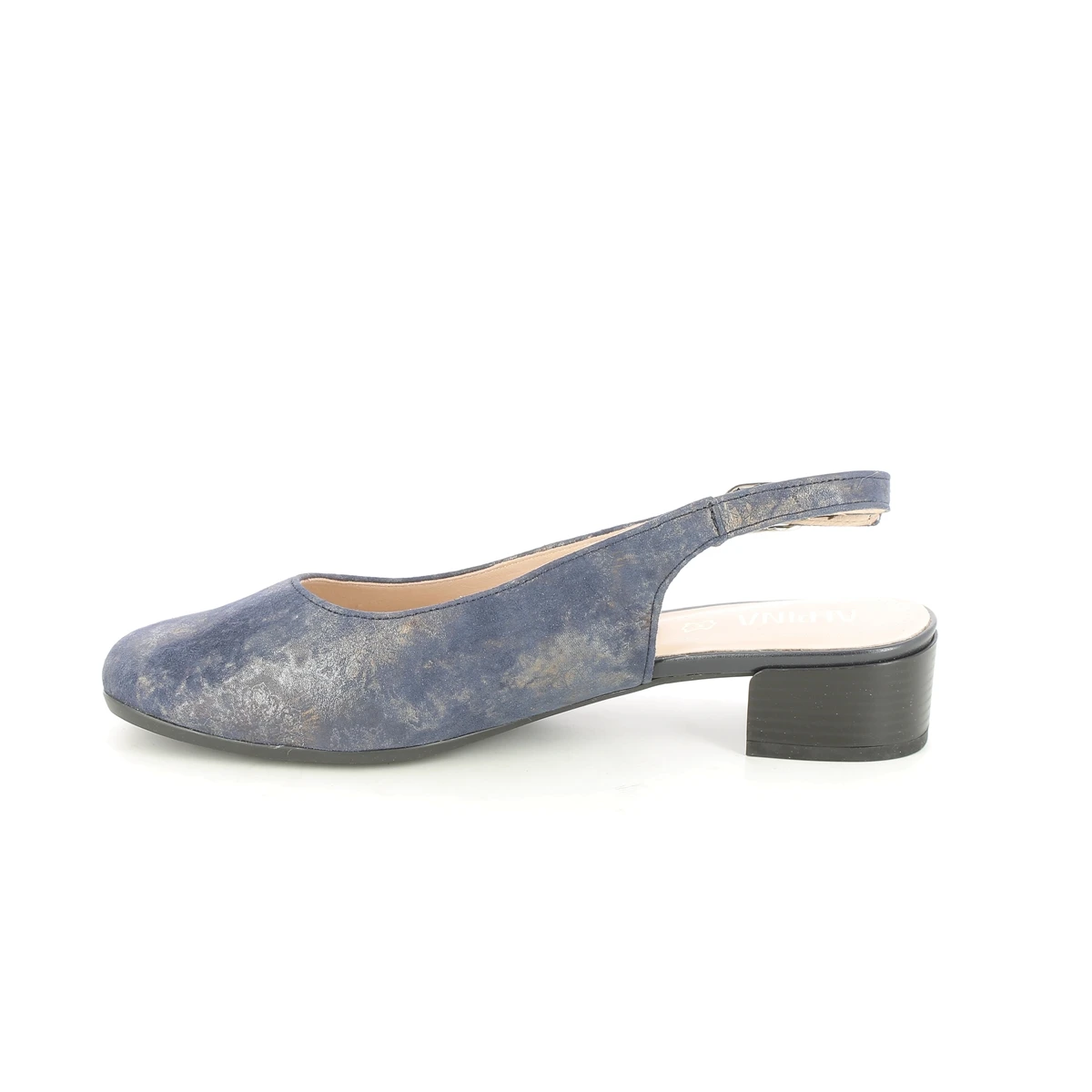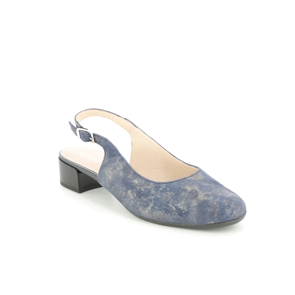 Emily is a womens navy nubuck slingback heeled pump. This shoe has a unique marbled effect to the nubuck which will look great with skirts dresses and trousers for work. The slingback strap with buckle provides an adjustable and secure fit to the foot while the small heel gives height while not compromising on comfort. Also available in a light grey nubuck.