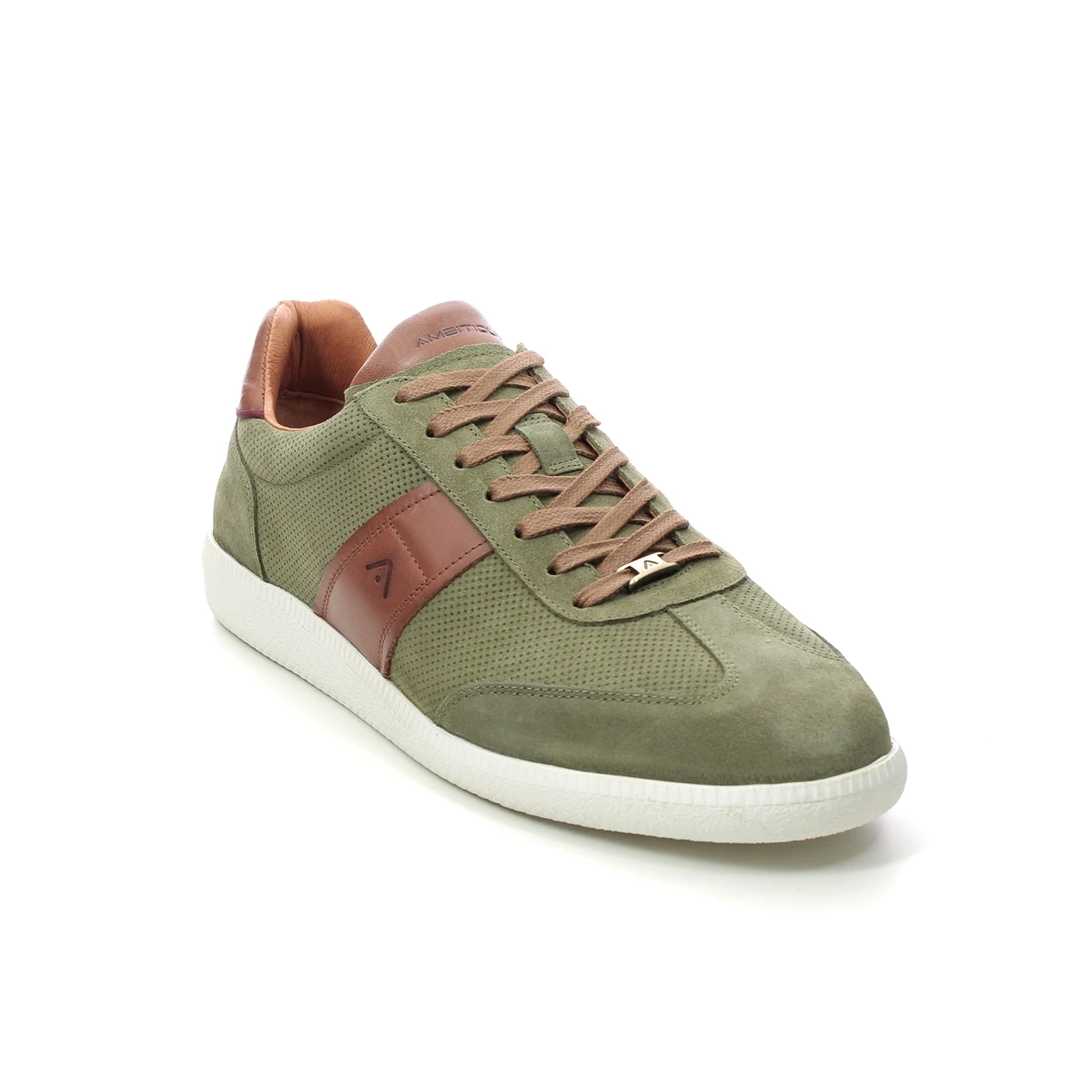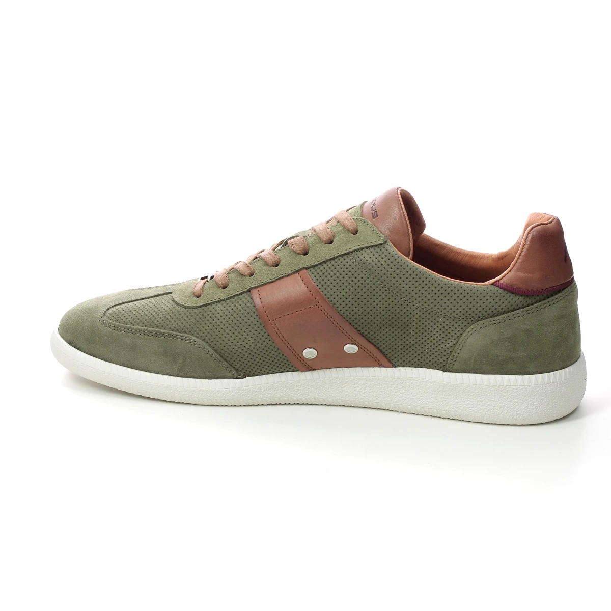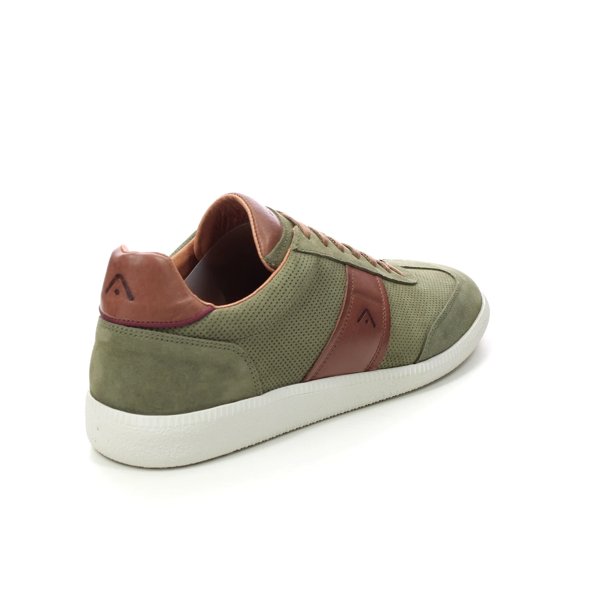 Ambitious Fay mens khaki suede leather trainers have a two tone khaki green and tan upper. The contrasting white outsole is made from rubber which is good for improved traction.