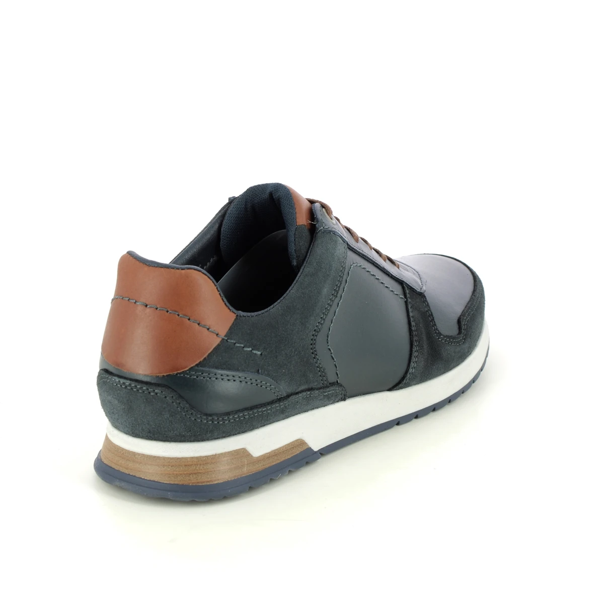 These men’s navy casual shoes have a two tone leather upper of navy, tan and a sporty white sole unit.