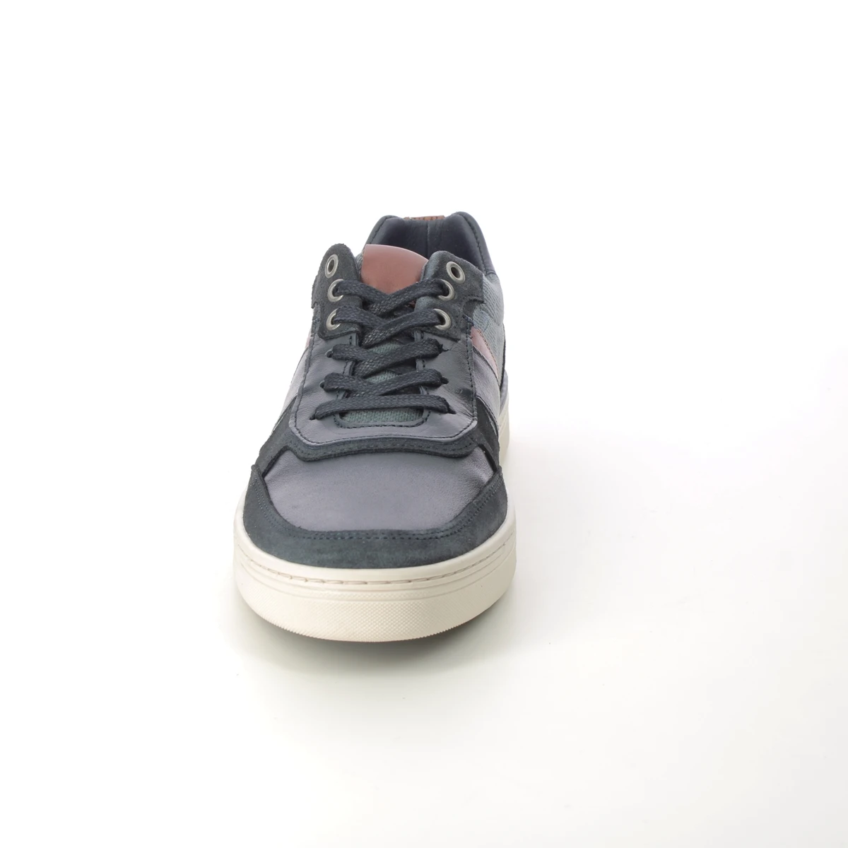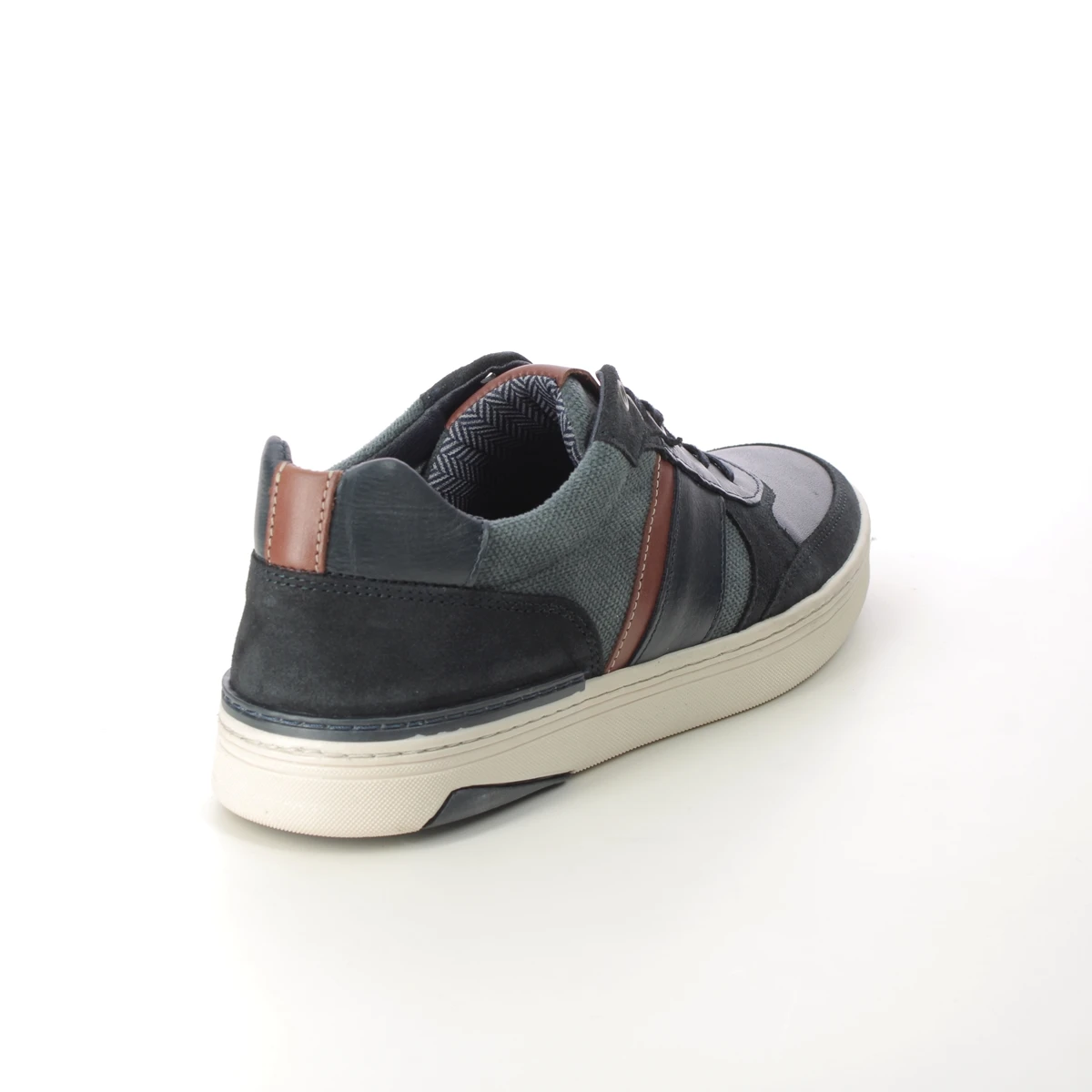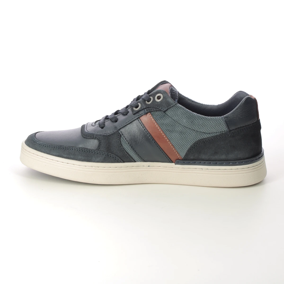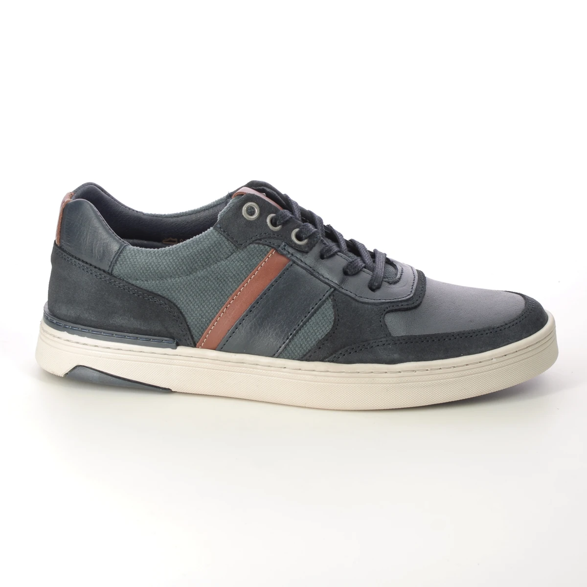 These men’s navy leather trainers have a suede and leather upper with tan leather trims, and a sporty white sole.