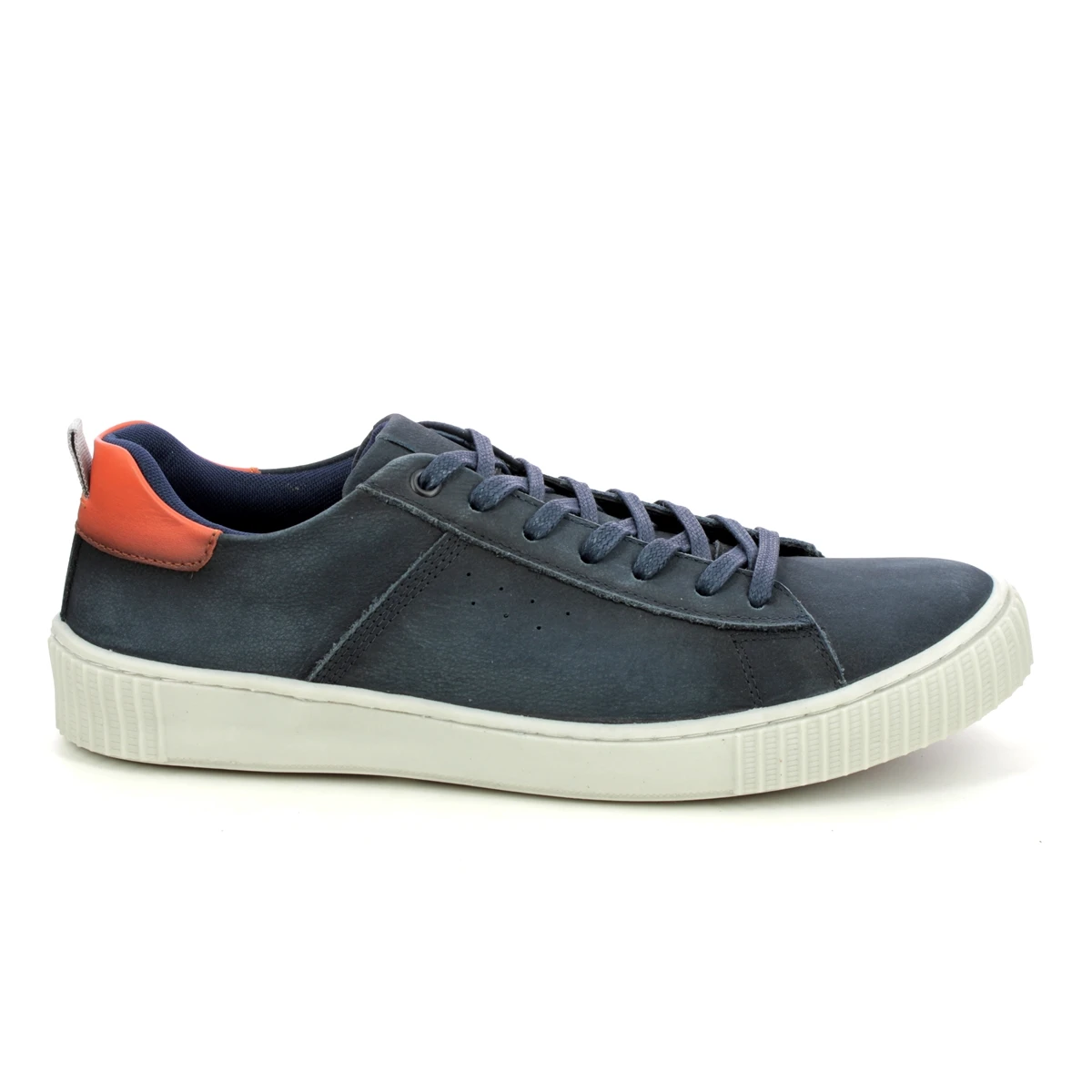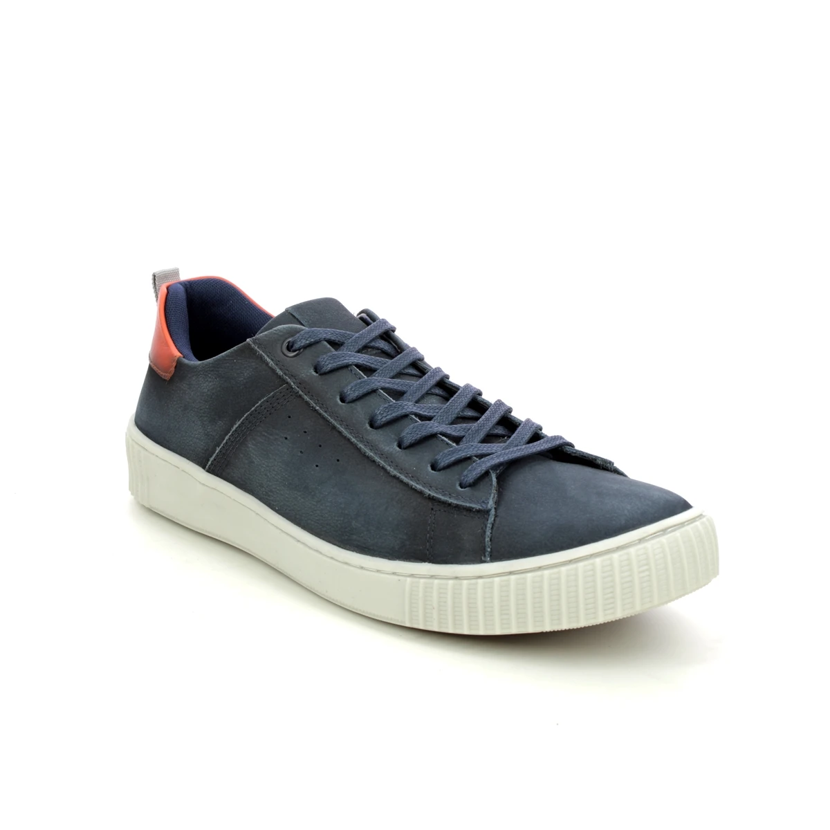 The men’s navy trainers have a textured leather upper, contrasting tan heels, and secure lace fastening. The white grooved rubber outsole maintains the sporty look and the stitch construction sole unit keeps them flexible.