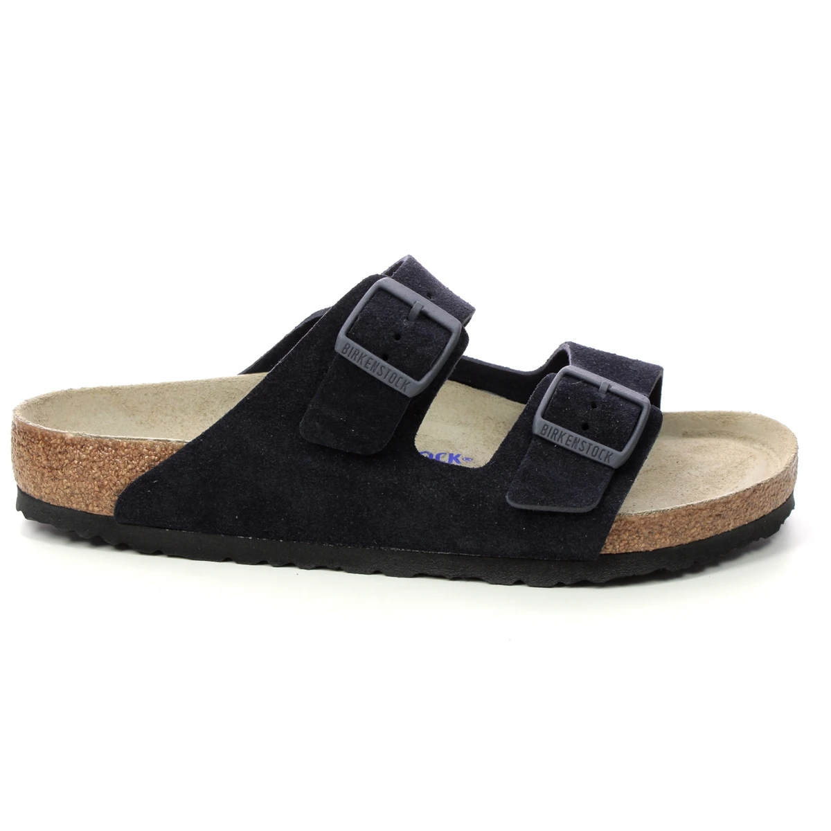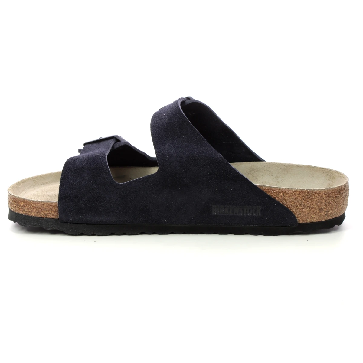 The Birkenstock Arizona mens Soft Footbed sandals in navy offer a roomier fit. These men’s Birkenstock are made on the Regular Fit footbed, which offers a wider and roomier fit. The soft suede upper in navy is adjustable by way of the two buckles whilst the padded footbed is anatomically shaped to support the foot’s natural shape.