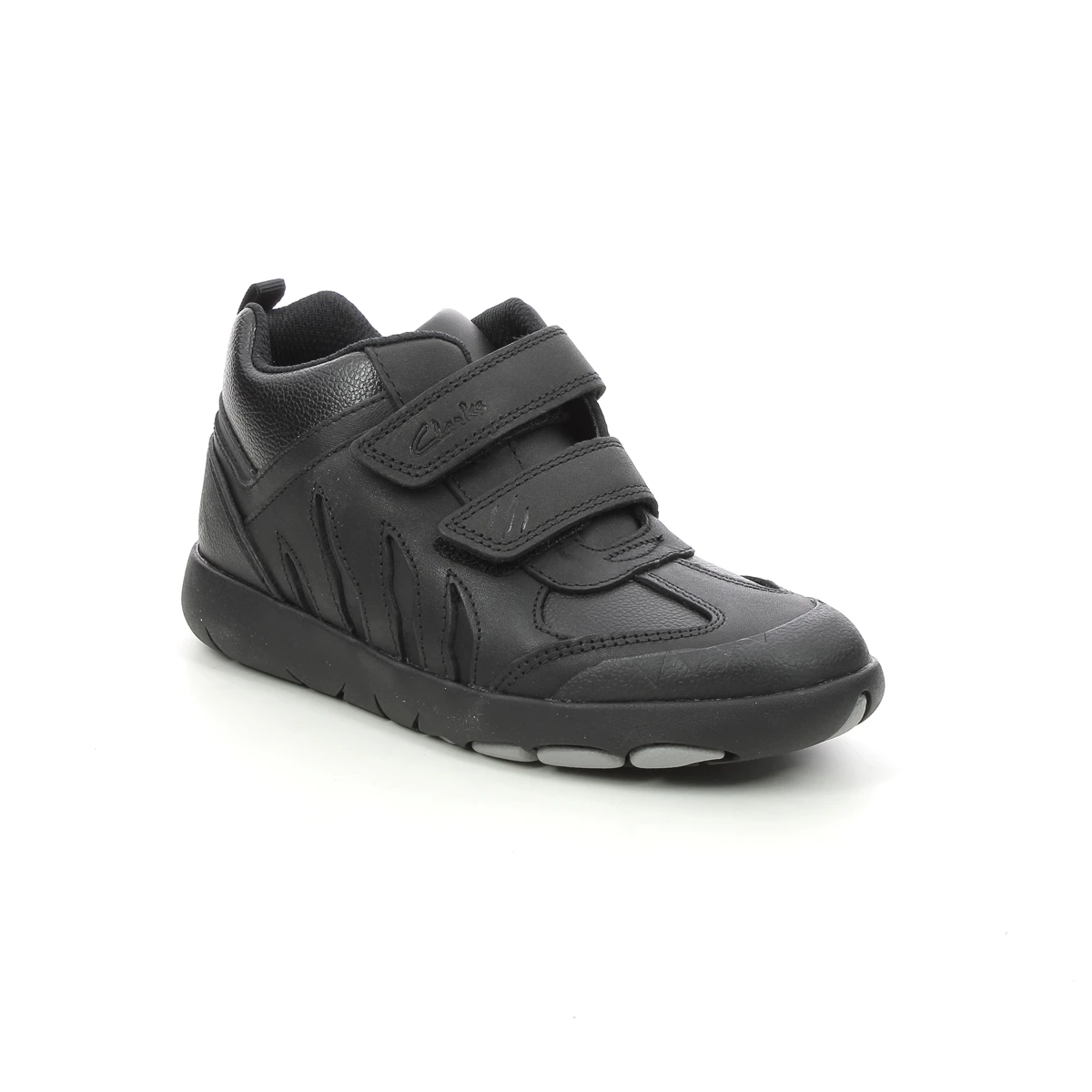 Clarks 628366F REX HOP CRASH K boys school shoes are fun and hard wearing. These Clarks school boots are dinosaur-inspired with the claw marks on the side rubber spikes on the heel back and the cool dino footprint on the flexible sole. The boys Clarks school shoes have a black leather upper which is breathable and flexible whilst the rubber overlay on the toe keeps them hard wearing and tough. There are two hook and loop straps for a quick and easy fastening whilst the antimicrobial Agion lining helps to keep feet fresher for longer.
