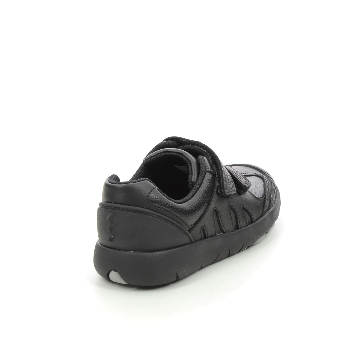 The Clarks 626985E REX STRIDE K boys school shoes are fun and hard wearing. These Clarks school shoes are dinosaur-inspired with the claw marks on the side rubber spikes on the heel back and the cool dino footprint on the flexible sole. The boys Clarks school shoes have a black leather upper which is breathable and flexible whilst the rubber overlay on the toe keeps them hard wearing and tough. There are two hook and loop straps for a quick and easy fastening whilst the antimicrobial Agion lining helps to keep feet fresher for longer.