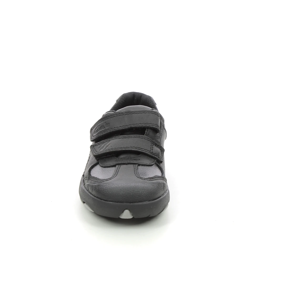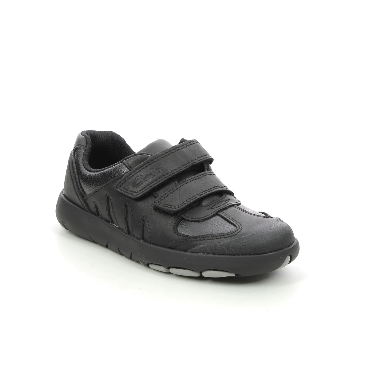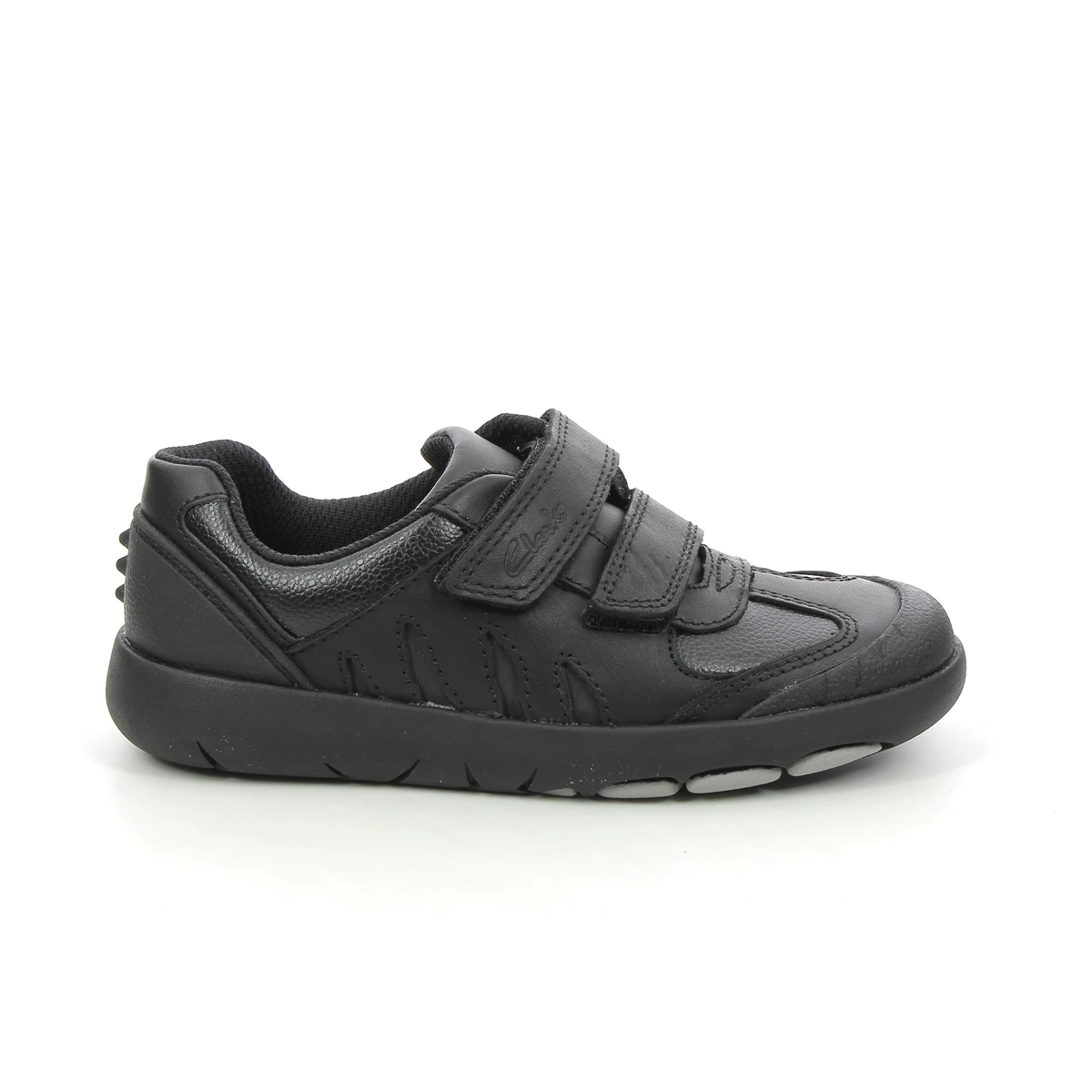 The Clarks 626987G REX STRIDE K boys school shoes are fun and hard wearing. These Clarks school shoes are dinosaur-inspired with the claw marks on the side rubber spikes on the heel back and the cool dino footprint on the flexible sole. The boys Clarks school shoes have a black leather upper which is breathable and flexible whilst the rubber overlay on the toe keeps them hard wearing and tough. There are two hook and loop straps for a quick and easy fastening whilst the antimicrobial Agion lining helps to keep feet fresher for longer.
