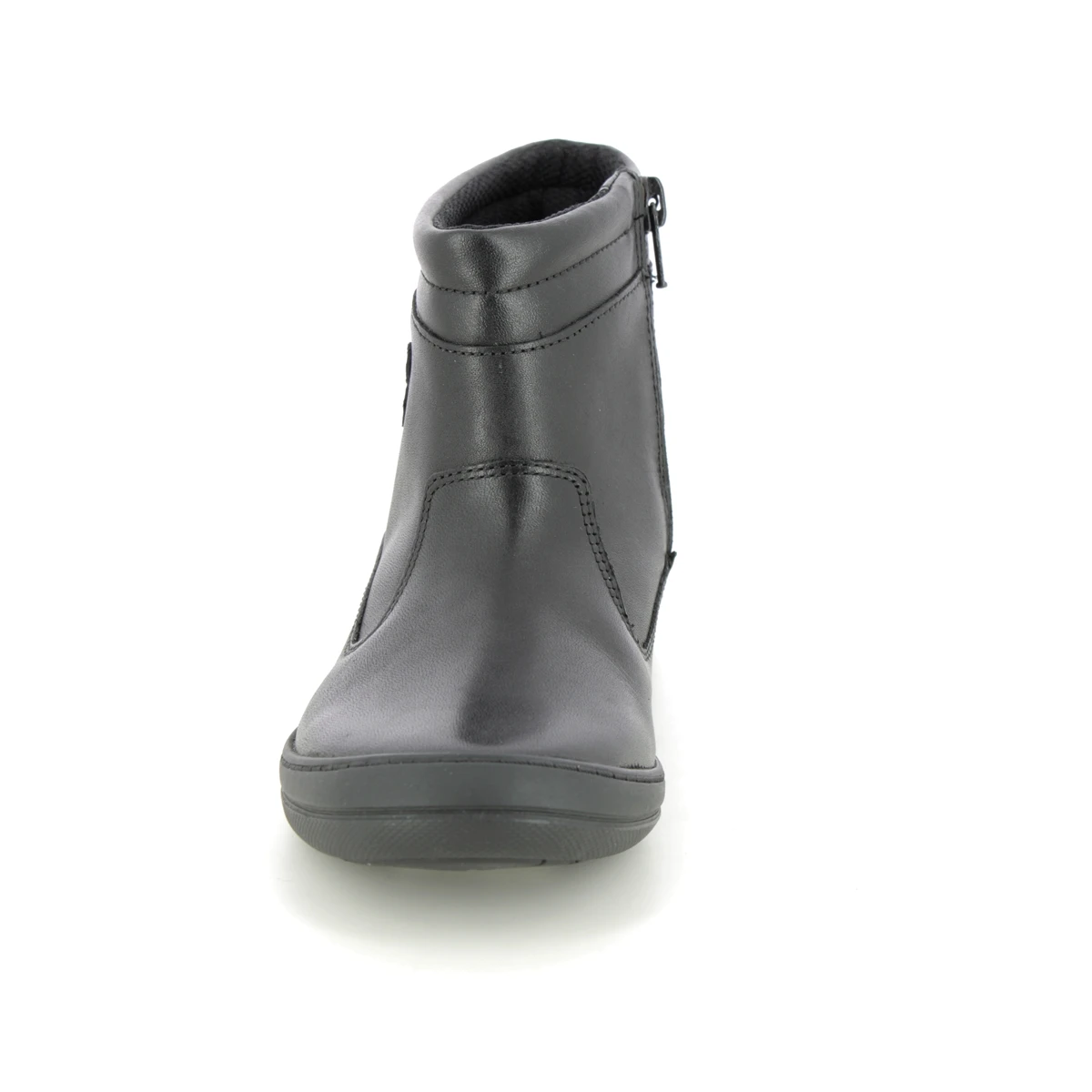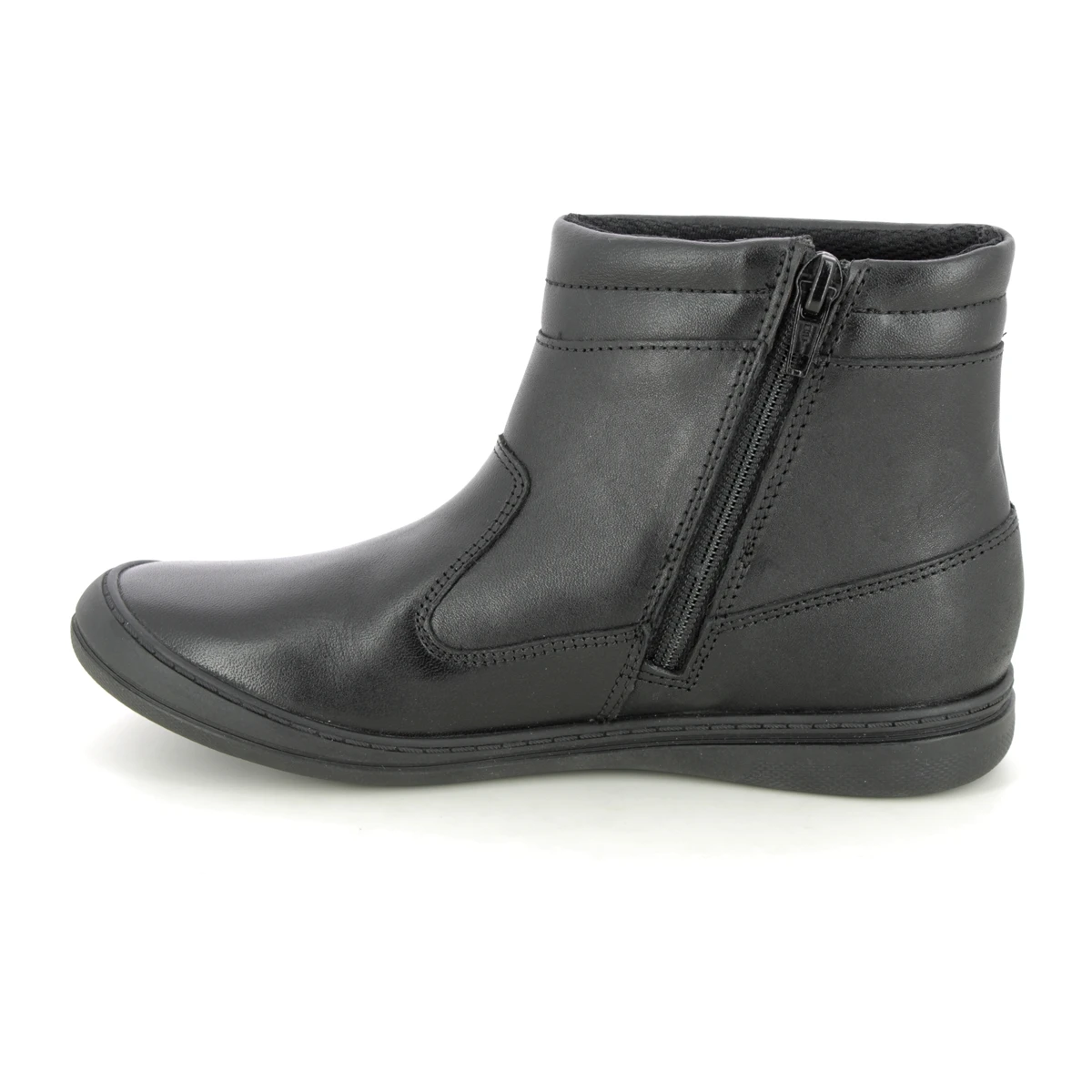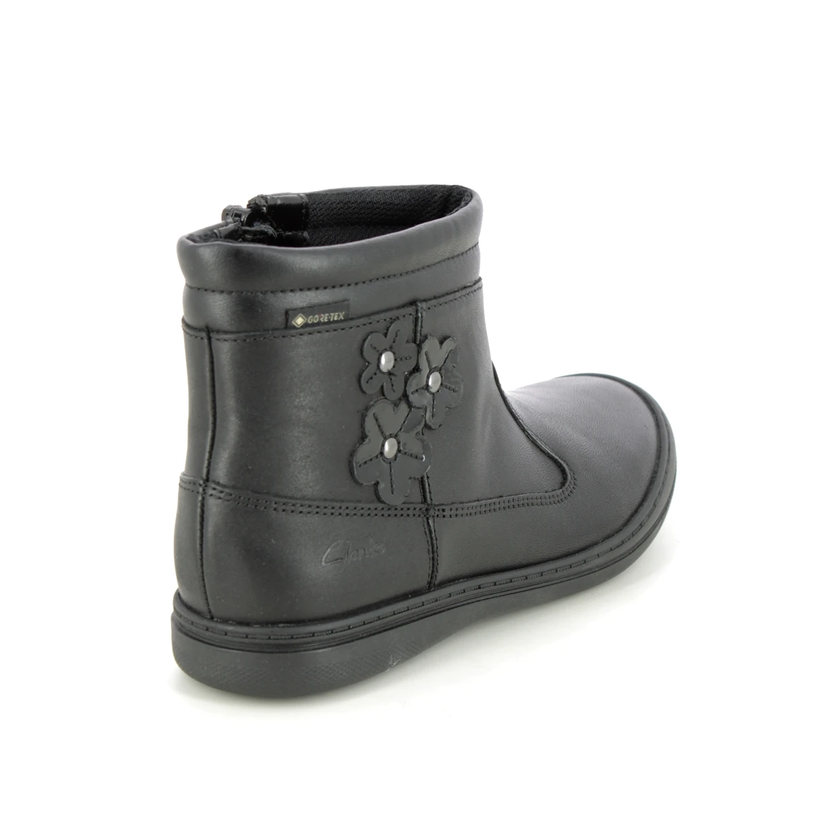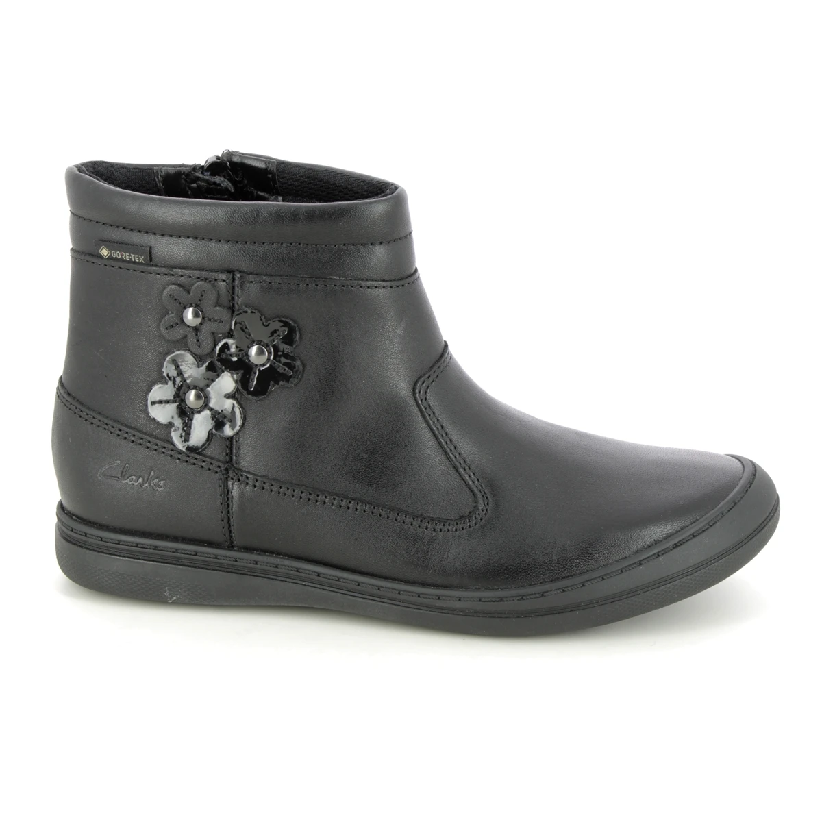 The Clarks 510376F SCOOTER GO GTX girls waterproof boots are a stylish yet practical choice. These girls Gore Tex boots have a black leather upper with overlay panels for improved durability. There are three flower and stud details on the outside and the interior side zip allows a quick and easy fastening. The Gore tex membrane is guaranteed waterproof and breathable and stops water from coming in but allows excess moisture to escape.