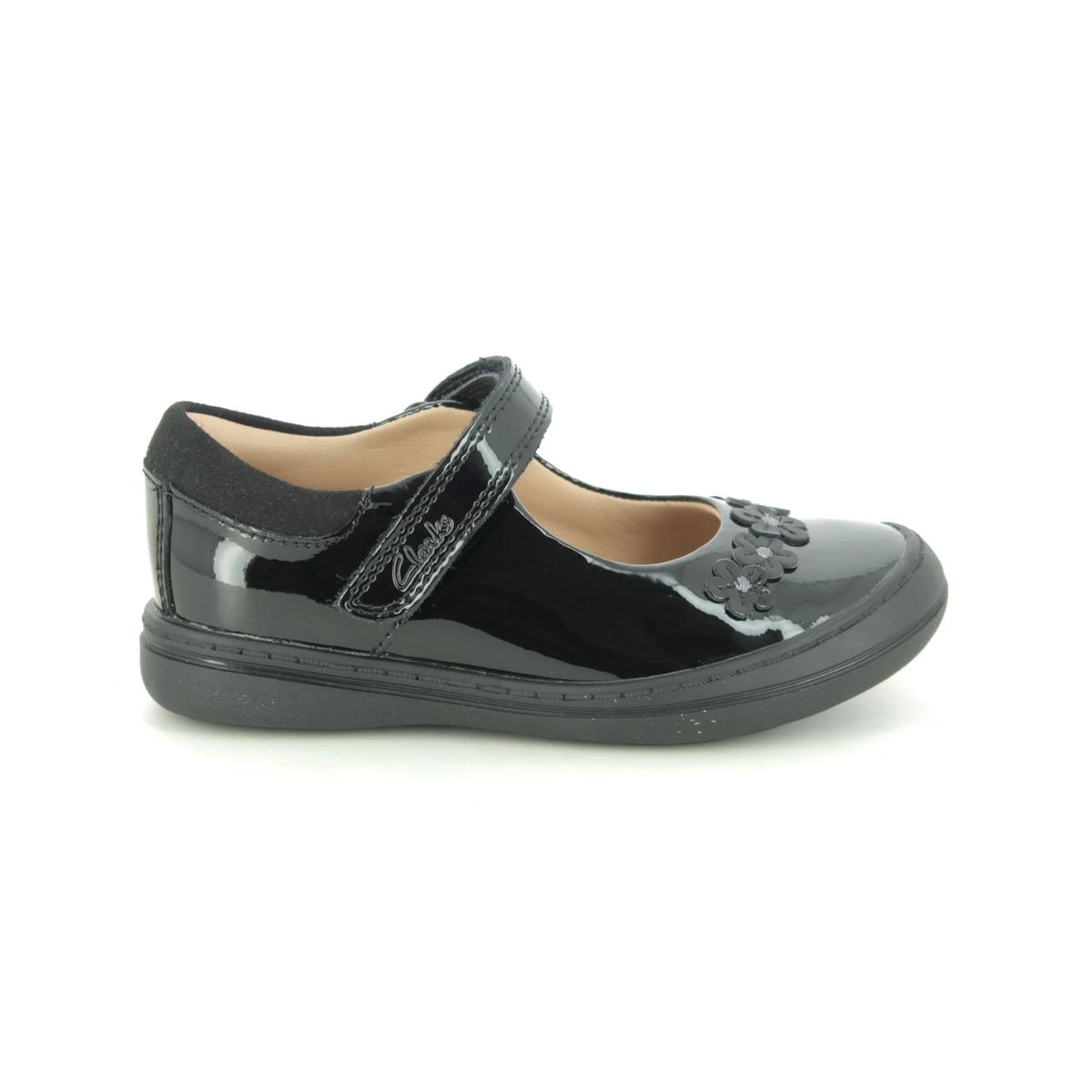 The Clarks Scooter Jump T girls mary jane school shoes are smart and pretty. The infant girls patent school shoes feature a shiny patent leather upper with a pretty flower and gemstone design on the toe. The rubber outsole extends up the toe making them more hard wearing and the Velcro strap over the foot offers a secure and comfortable fastening. The girls hard wearing school shoes have a padded collar and Agion lining designed to keep feet fresher for longer.