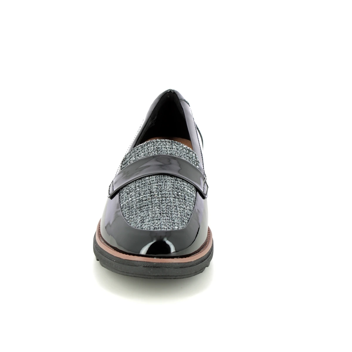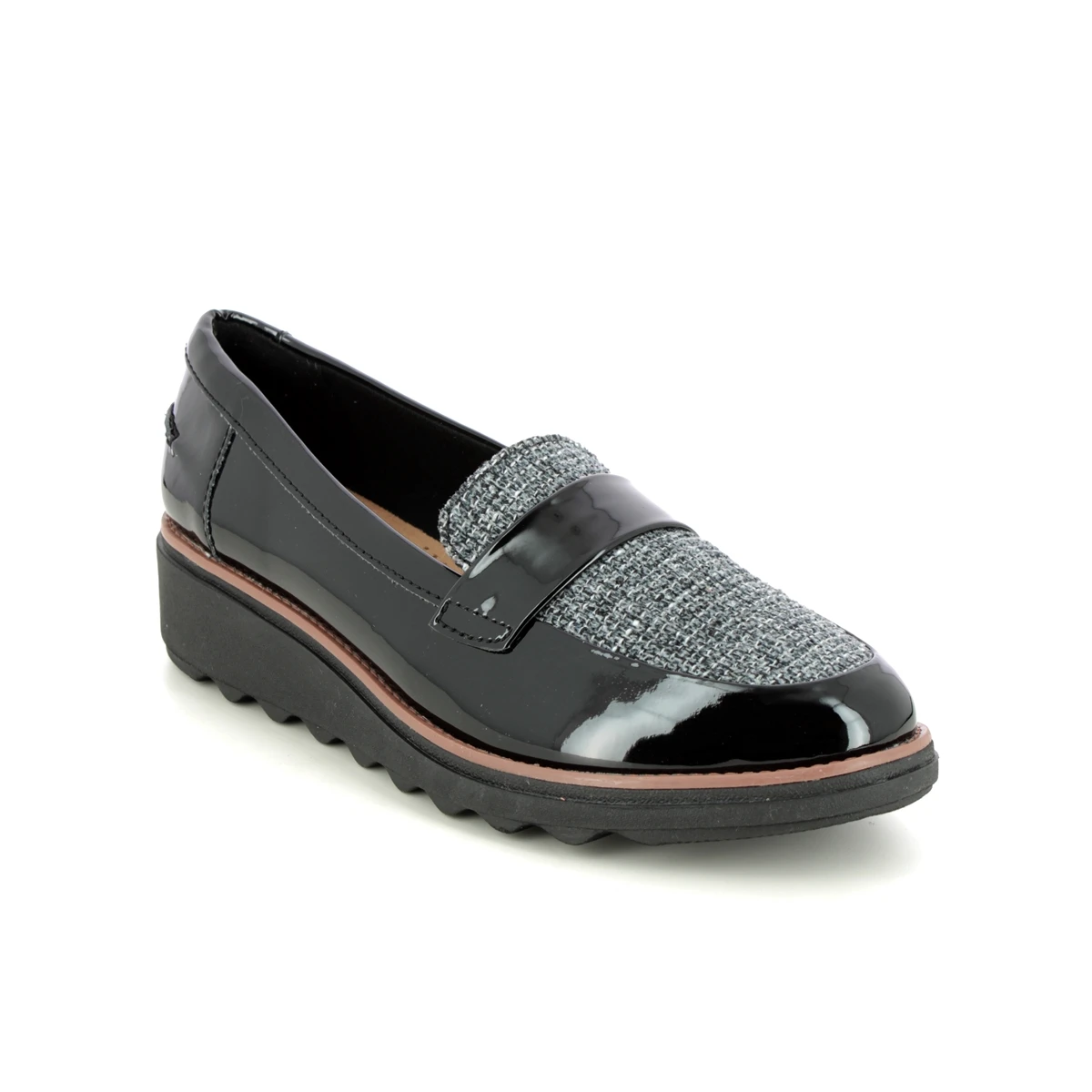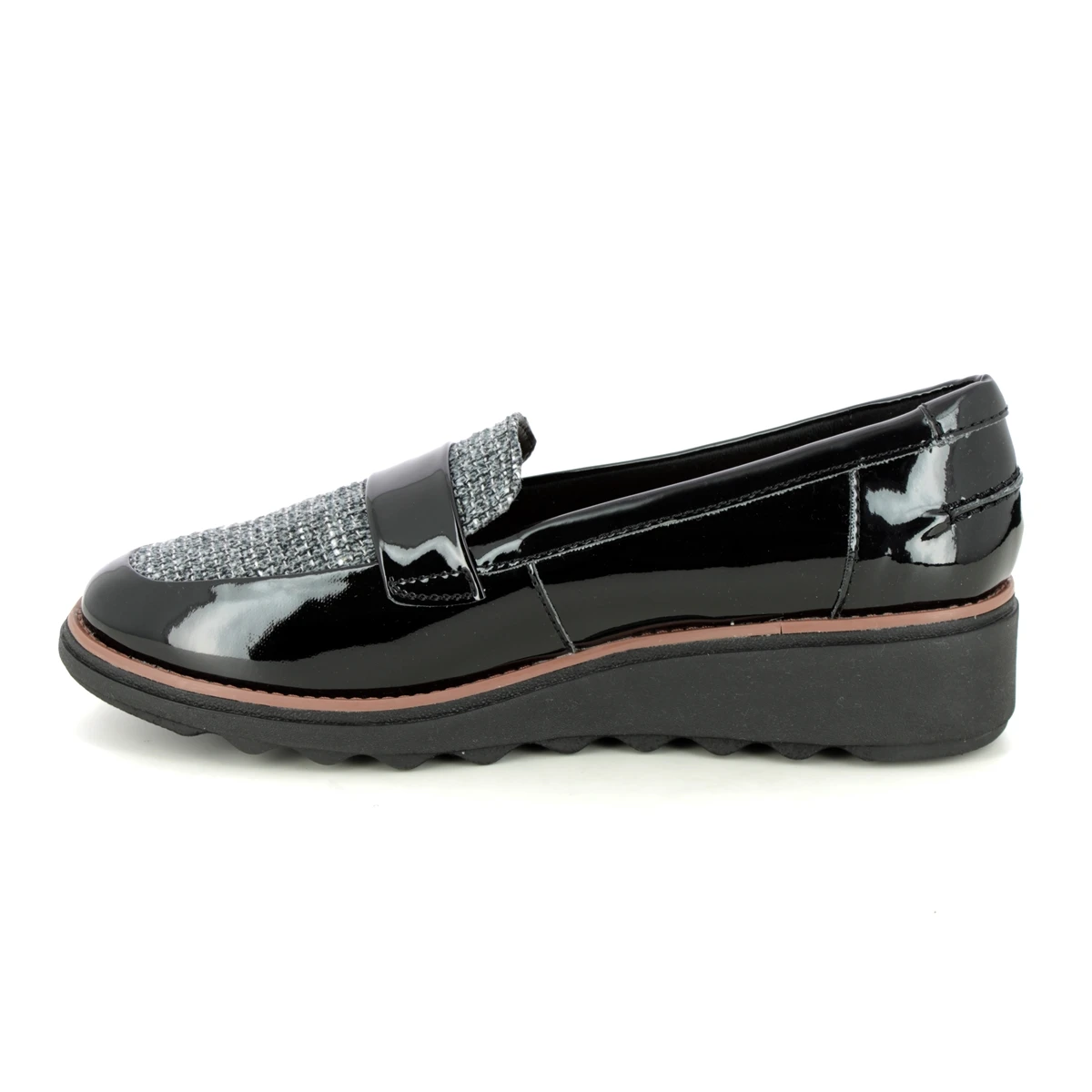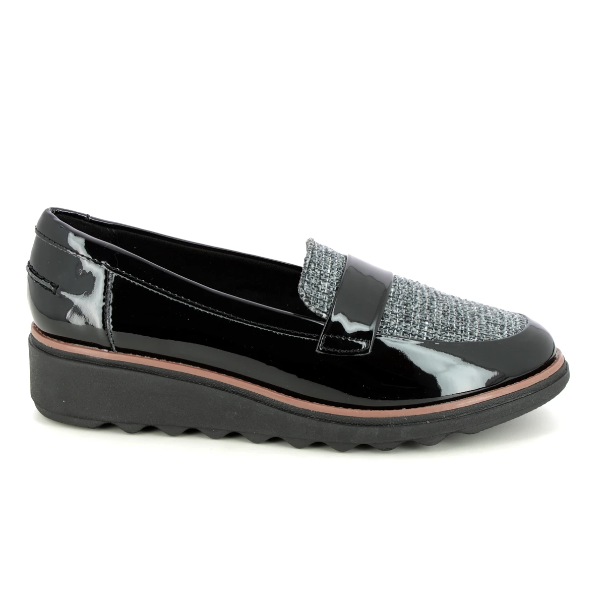 Clarks Sharon Gracie womens black patent loafers are stylish and comfortable. These womens black slip on shoes have a patent upper with a contemporary tweed panel. Perfect for wearing to work these womens black loafers have a 45mm wedge heel for extra support under the heel.