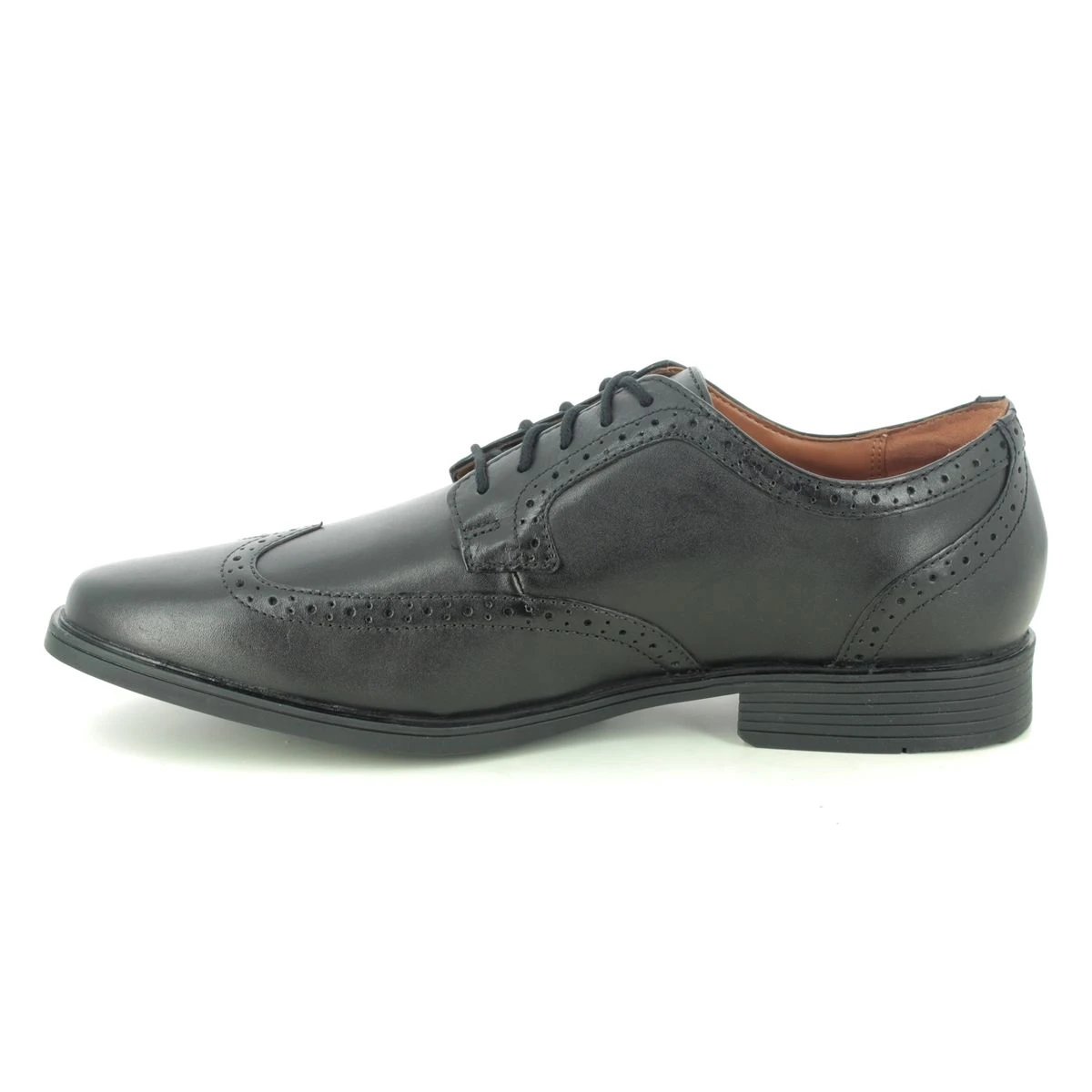 Clarks Tilden Wing mens black leather brogues are smart and very good value for money. The black leather upper is smooth and breathable and features a wingtip design and punch hole trim. The lace up smart shoes are adjustable and secure and the padded collar ensures comfort underfoot.