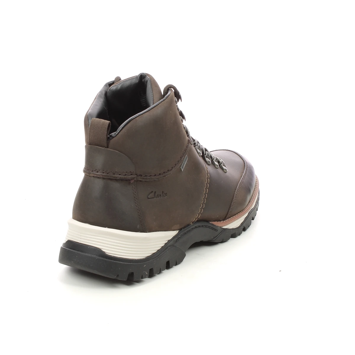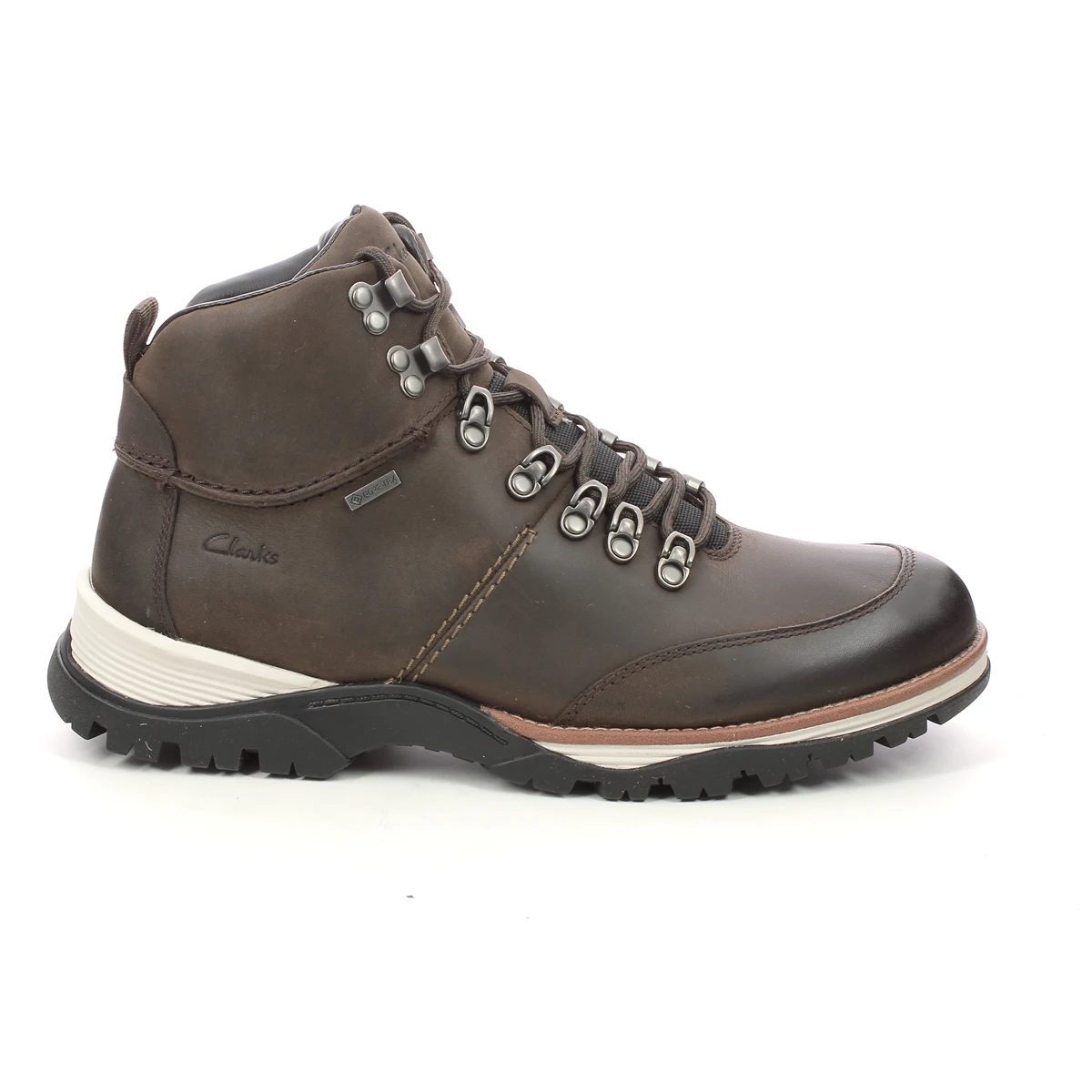 The Clarks 612607G TOPTON PINE GTX mens walking boots are sturdy and waterproof. These Clarks walking boots have a dark brown oiled leather upper which creates a distinctive distressed look. The rugged laces and hardware ensure a secure and adjustable fastening whilst the Gore Tex membrane is guaranteed waterproof and breathable. Padding around the collar and the Clarks Cushion Plus footbed ensure superb comfort underfoot whilst the rubber sole unit is cleated for improved traction across a variety of terrains.