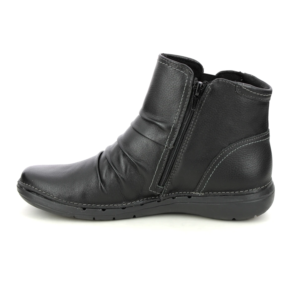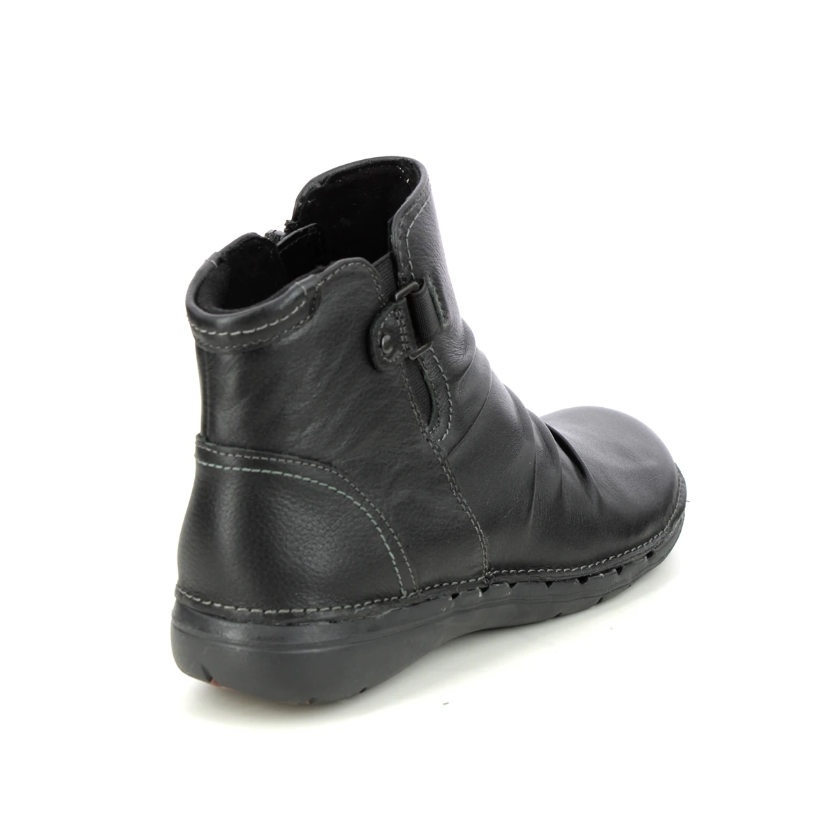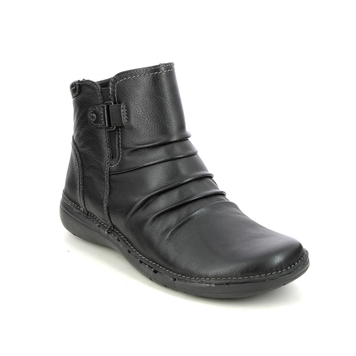 The Clarks Un Loop Top women’s black ankle boots offer comfort and support. These black boots have a pebble-grained leather upper with contrasting stitching and a buckle detial on the side. Lightiwehgt and flexible, these black leather boots are perfect for autumn.