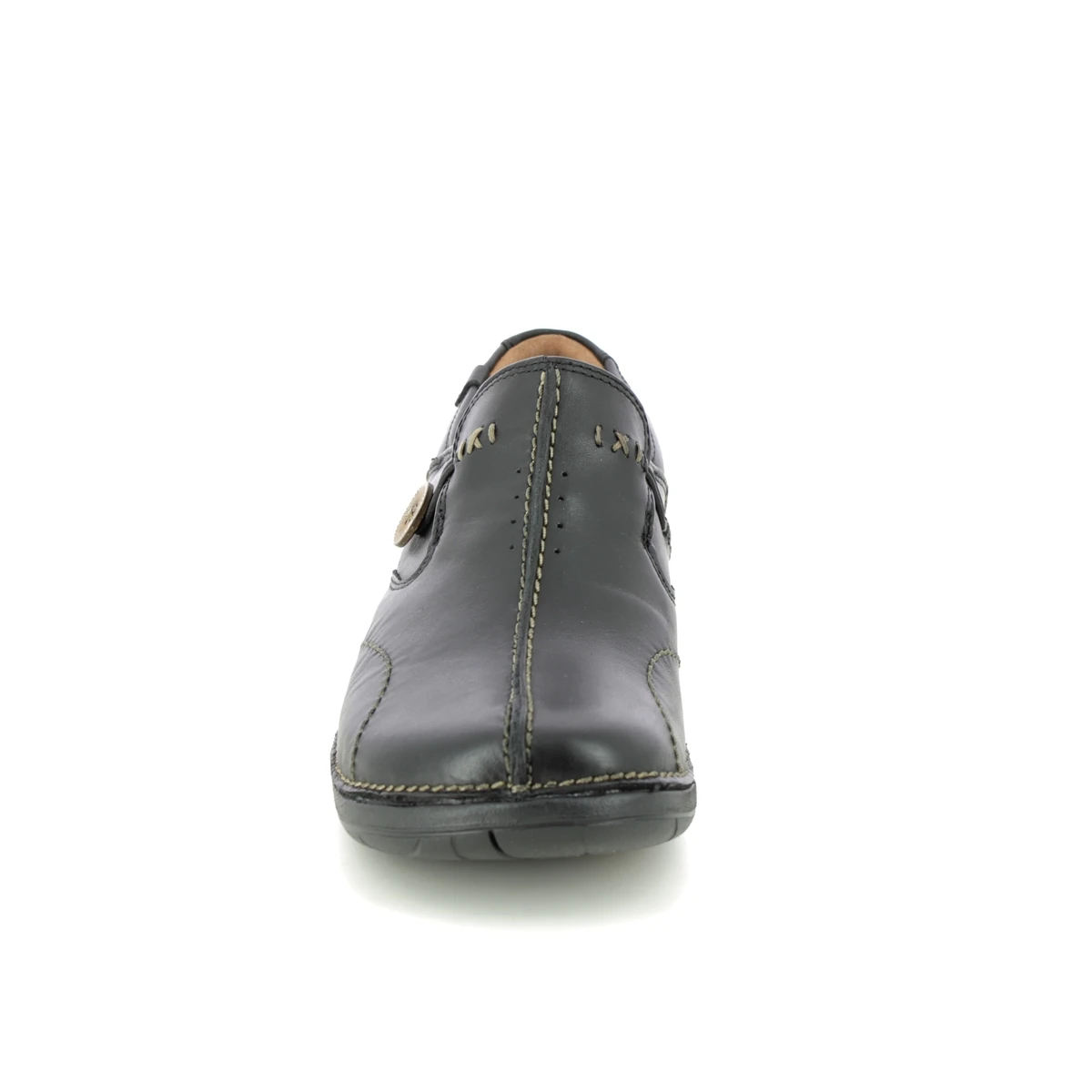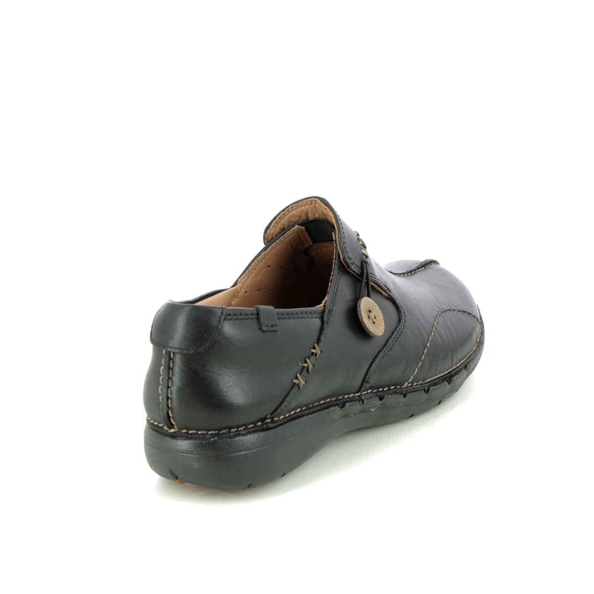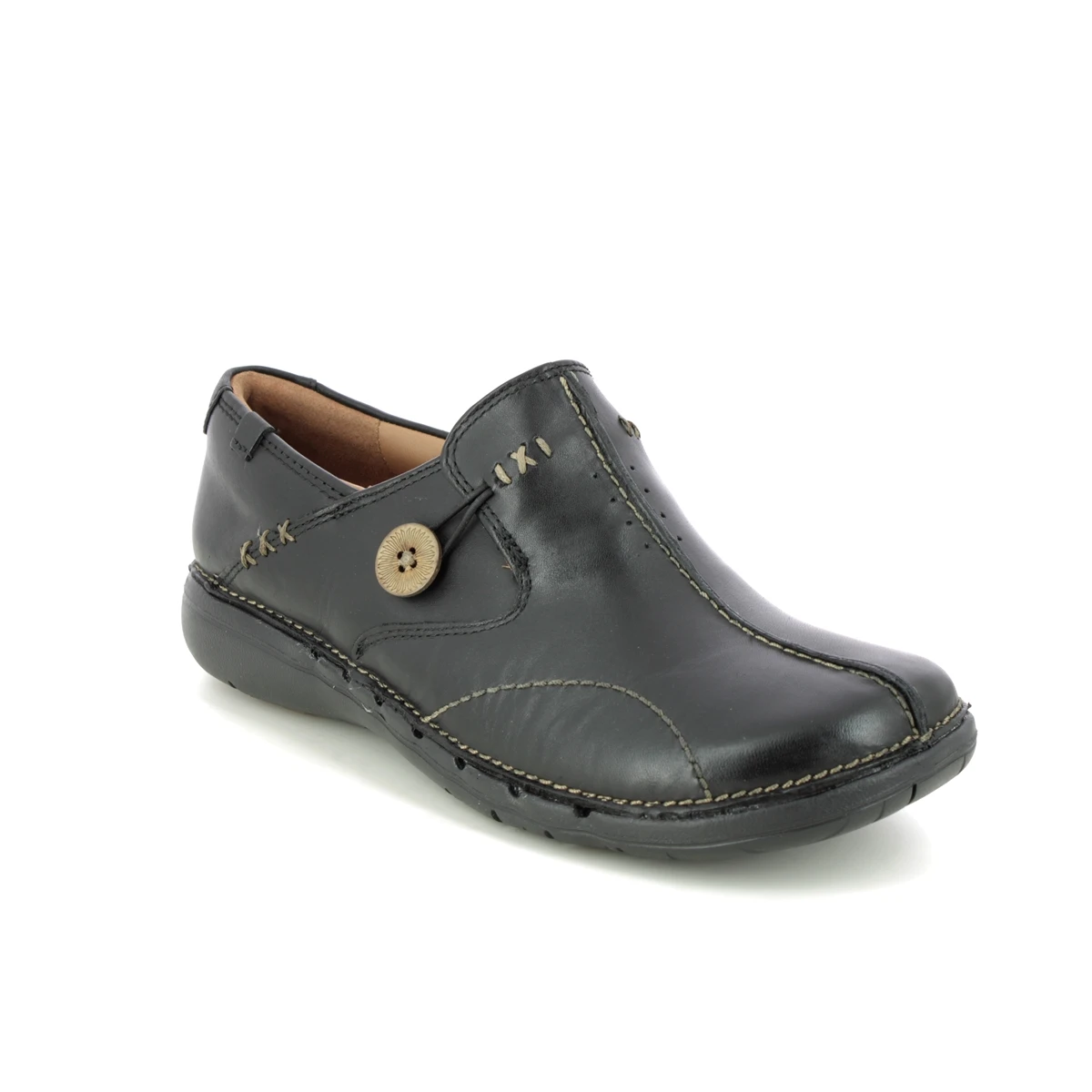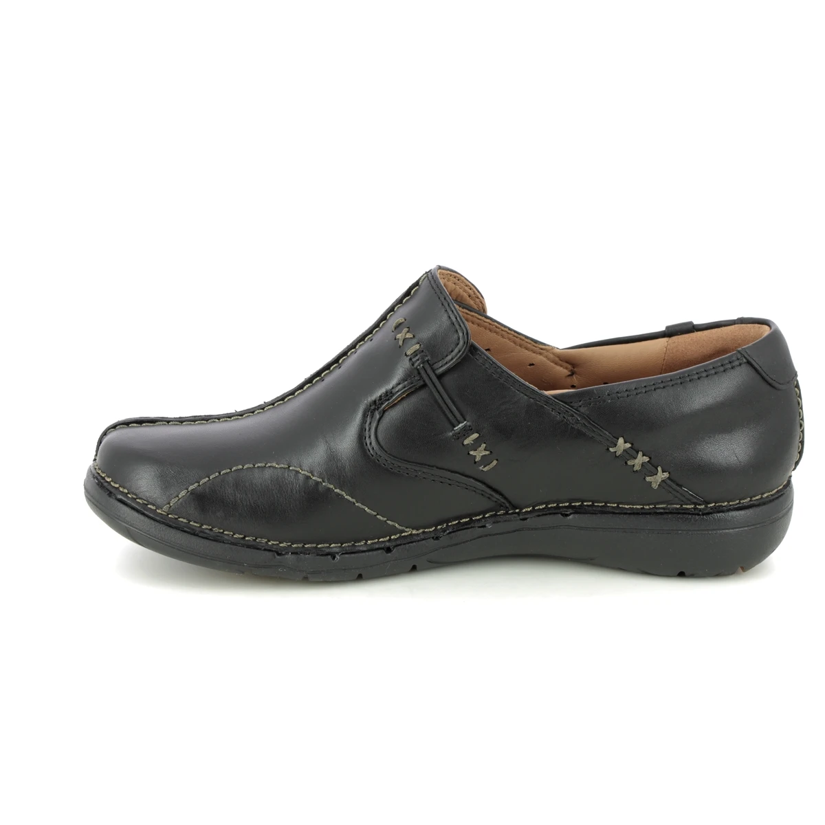 Clarks Un Loop Wide womens black comfort slip on shoes combine superb support with a comfy wide fit shoe. Often worn by those working in hospitals these womens wide fit Clarks have a breathable leather upper lining and footbed which is ideal for absorbing excess moisture and maintaining a cool climate. These slip on shoes have minimal details and a rubber outsole which offers improved traction.