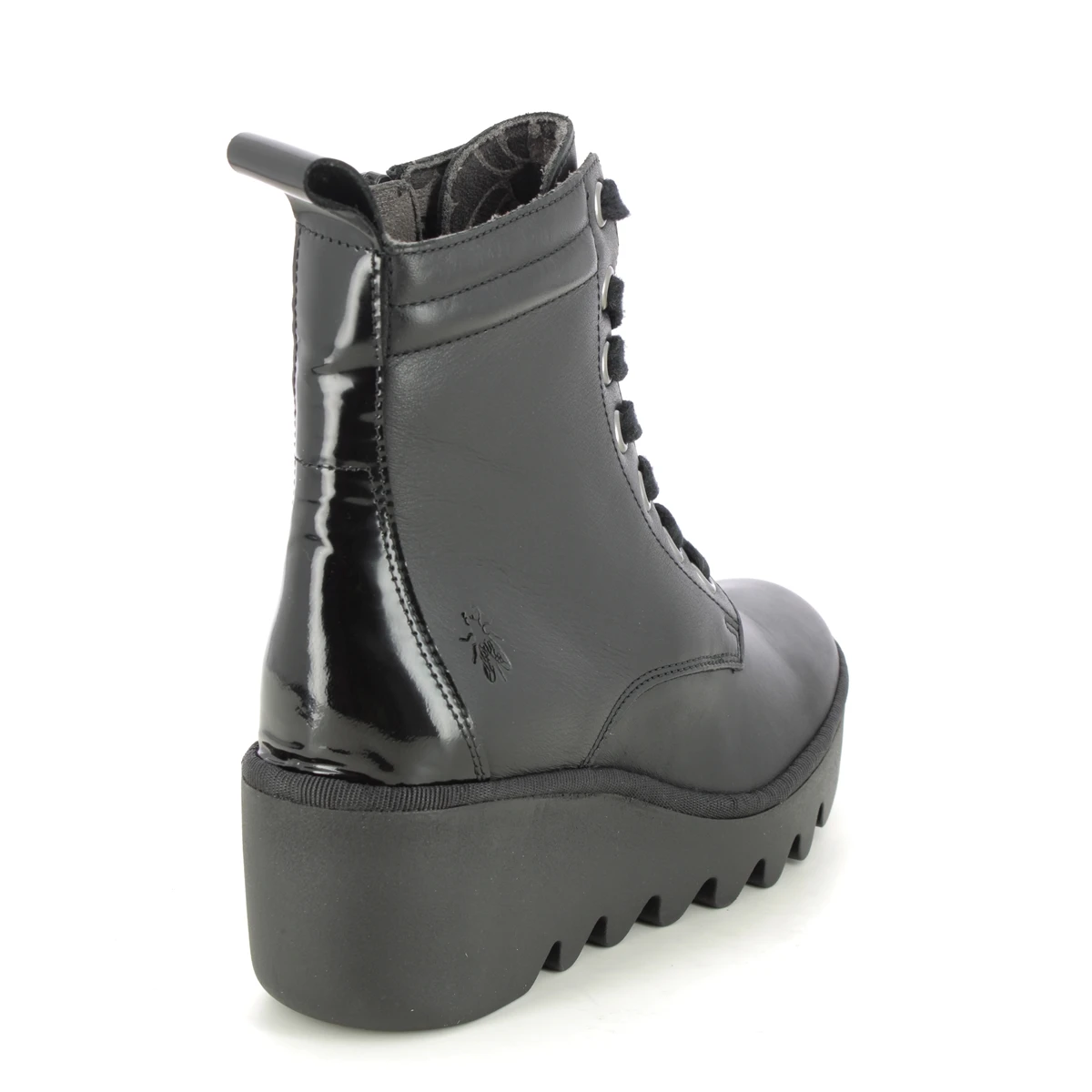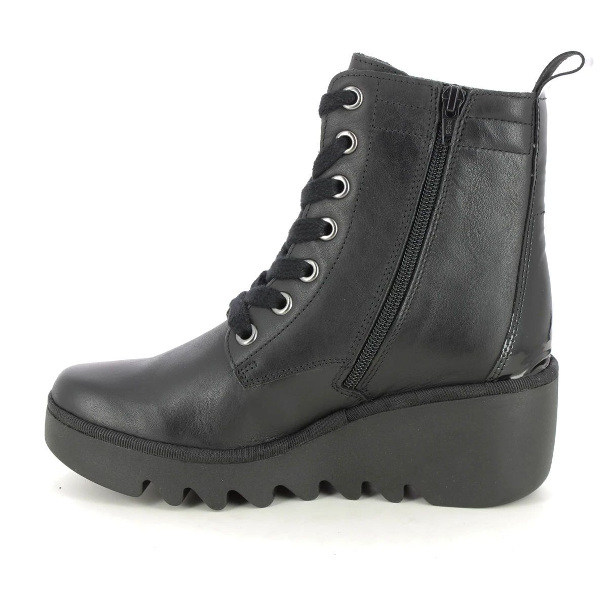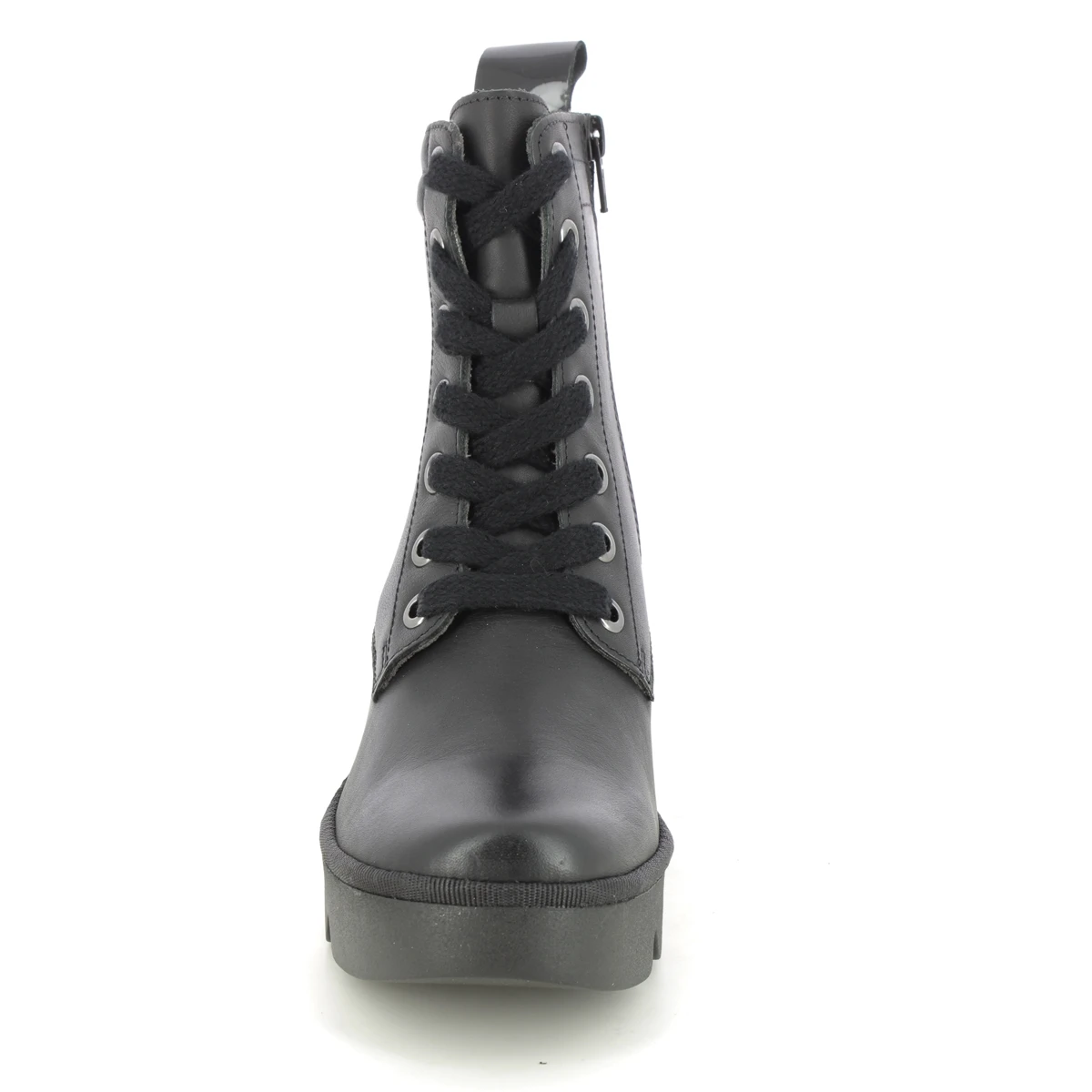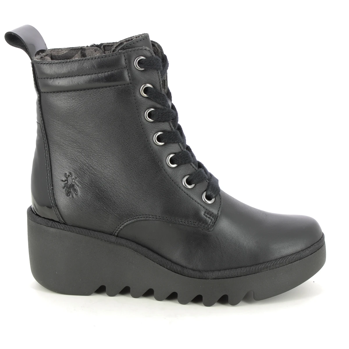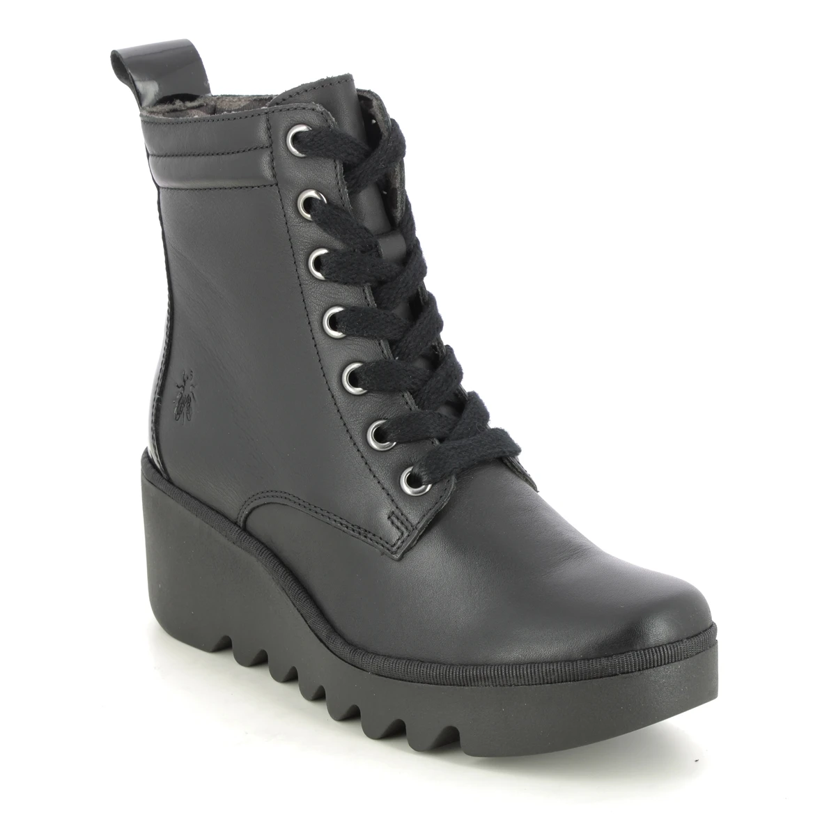 Fly London Biaz Blu Lace women’s black wedge boots are chunky and trendy. These women’s black lace up boots offer a secure and adjustable fastening.