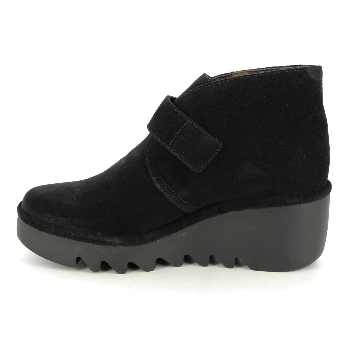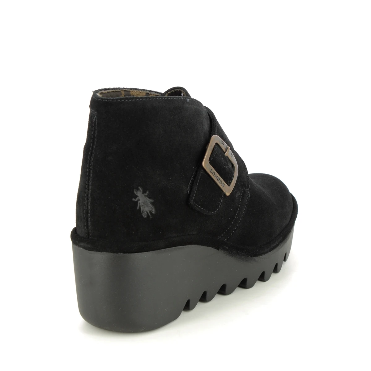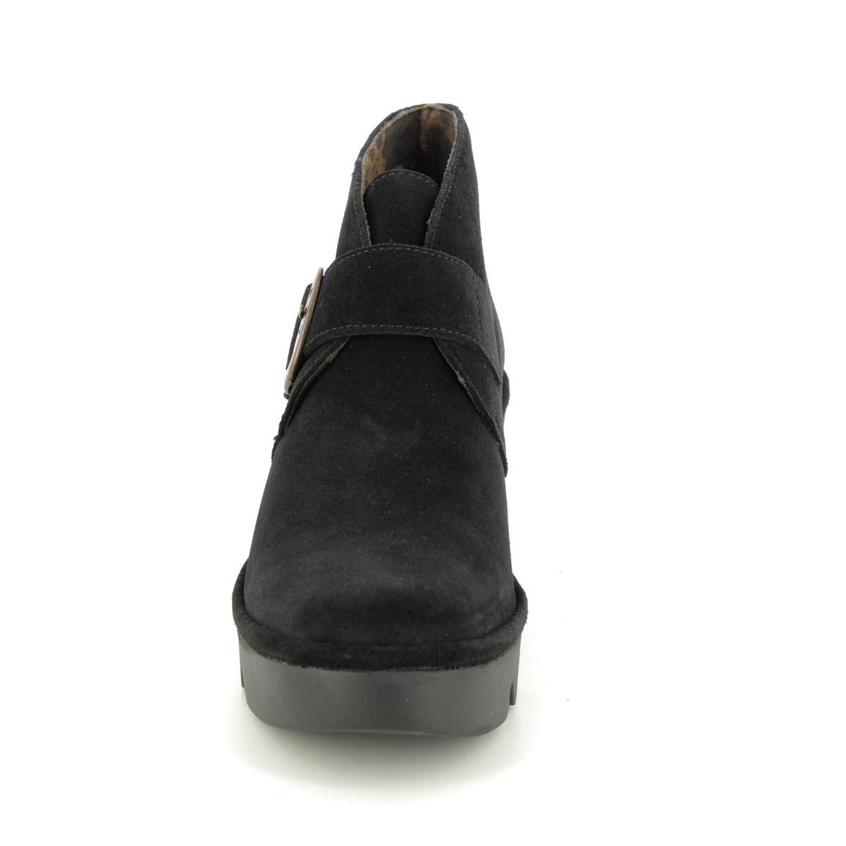 Fly London Birt Blu women’s black suede wedge boots are comfy and stylish. These women’s black ankle boots have a low asymmetric cuff with a buckle fastening and zigzag wedge sole measuring 6.5cm.
