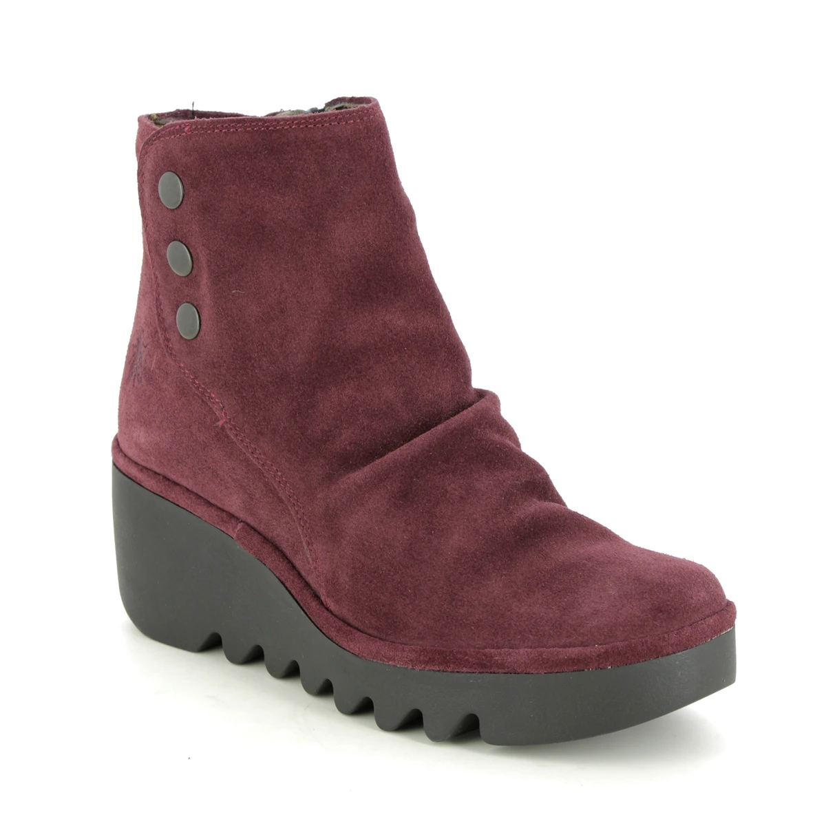Fly London Brom Blu women’s wine suede wedge boots are the perfect colour for autumnal wear. These women’s ankle boots have a suede upper with ruching for a flattering look, whilst the interior side zip allows easy fastening. There are three metallic buttons on the side for decoration and the wedge sole measures 65mm.