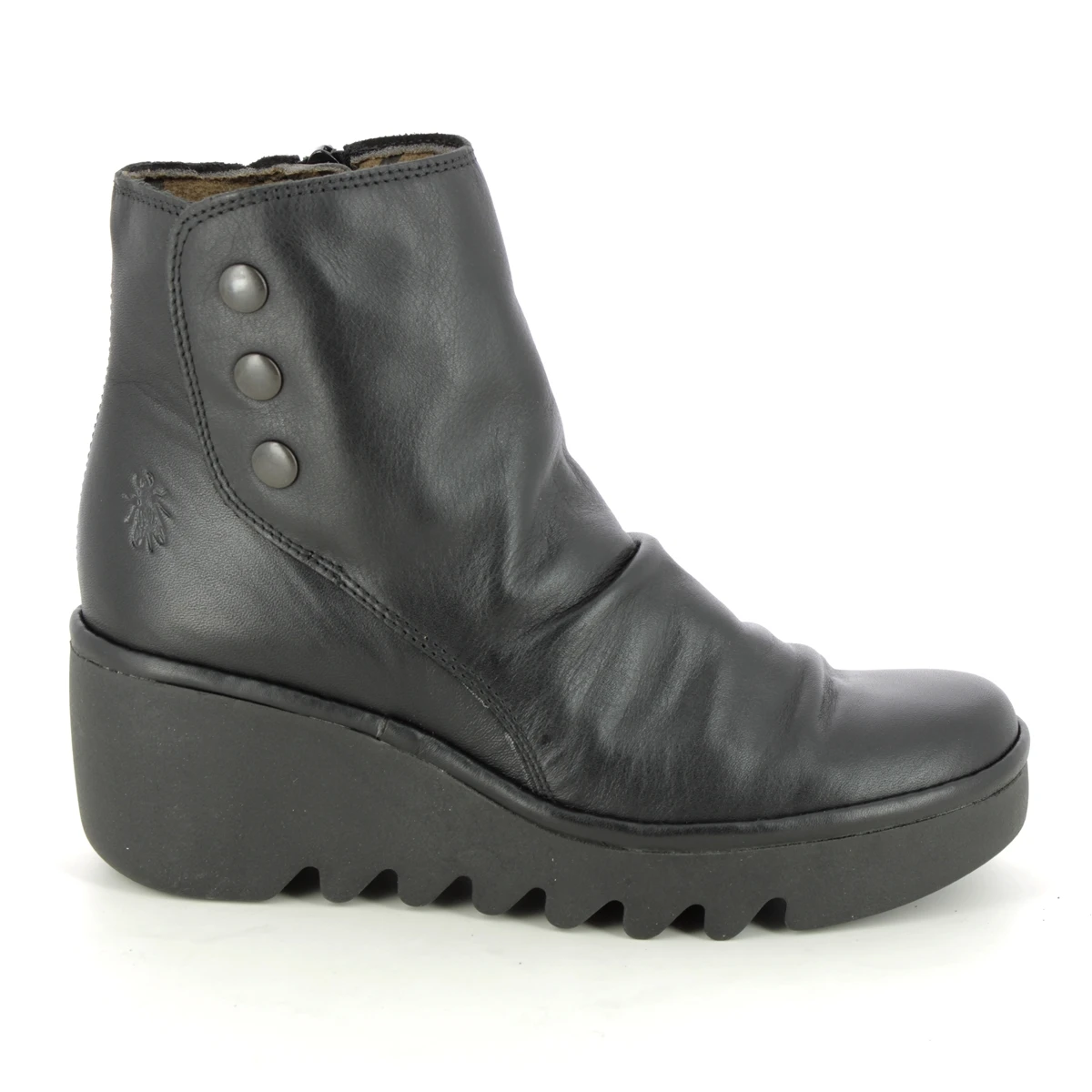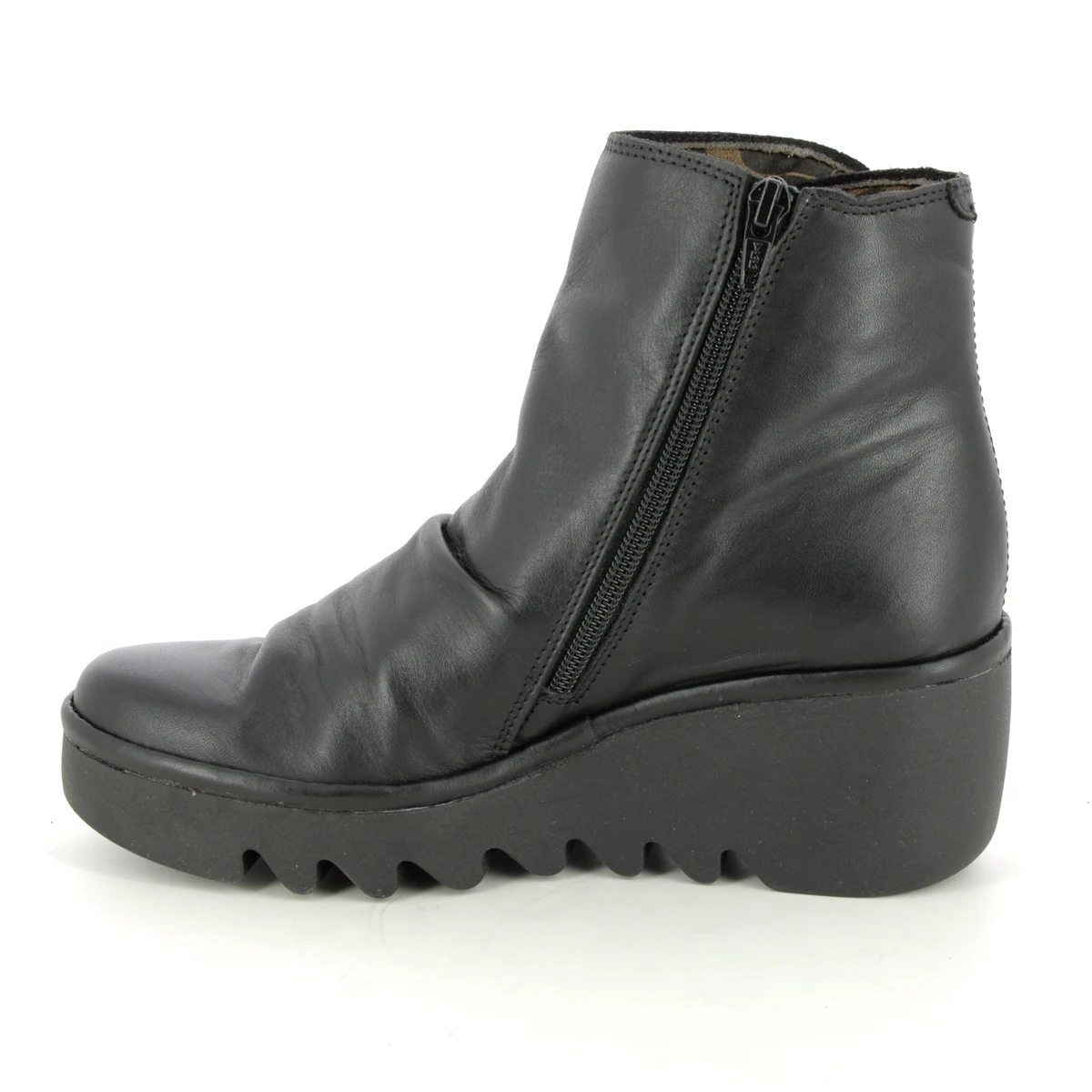 Fly London Brom Blu women’s black leather wedge boots are versatile. The smooth black leather upper maintains a smart appearance whilst the chunky cleated sole unit adds dramatic height and measures 65mm at the heel. With an interior side zip for easy fastening, these women’s black leather ankle boots can be worn with a variety of outfits and colours for easy styling.