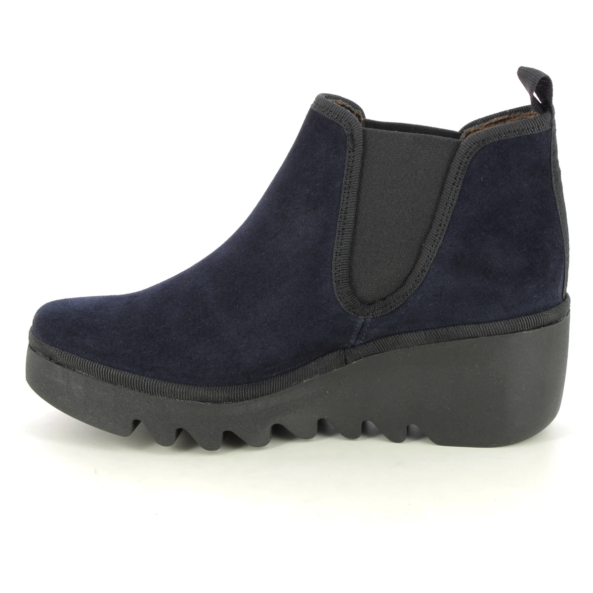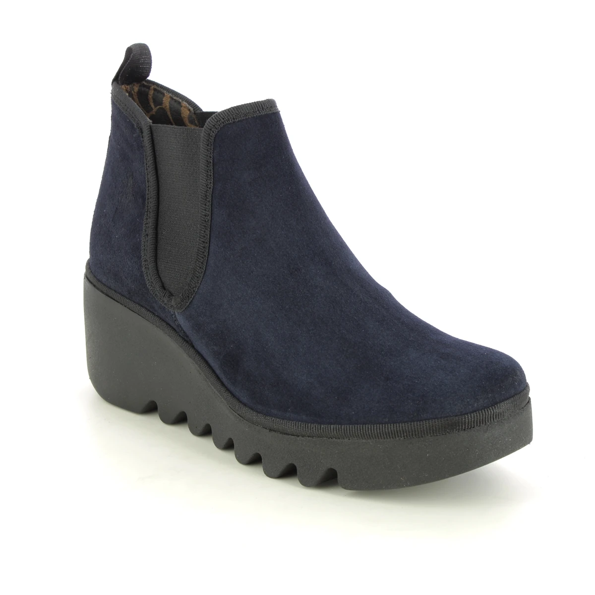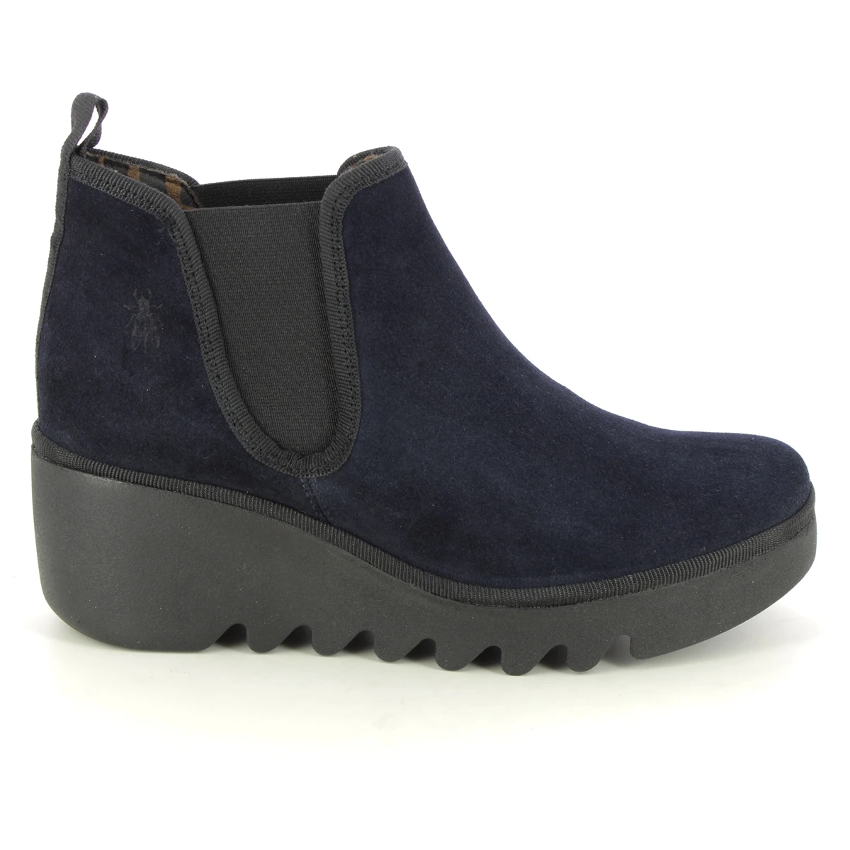 The Fly London Byne Blu women’s navy ankle boots are perfect for pairing with denim. These women’s low cuff wedge boots have elastic side panels, with a chunky wedge heel measuring 65mm.