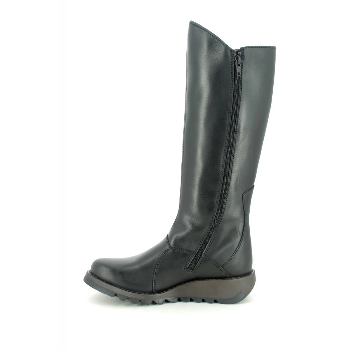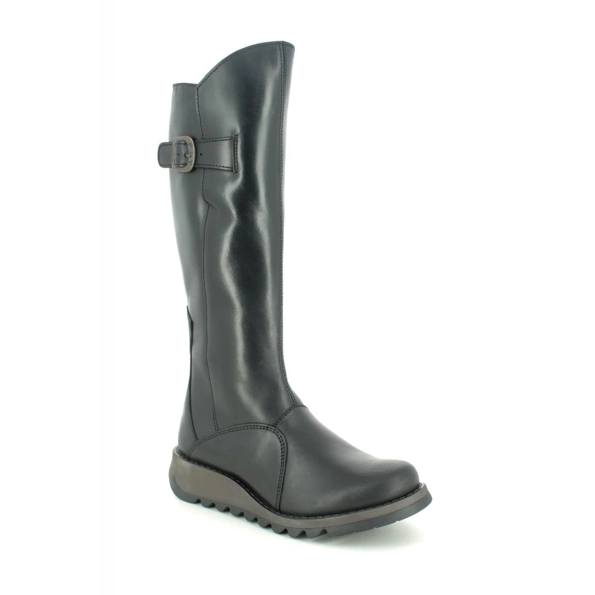 Fly London P142912 MOL 2 is ladies black knee high boot. These sleek tall boots have a supple black leather upper finished to the premium quality that Fly London is known for. Stitching accents and additional leather overlays help to improve fit and structure whilst the functional metallic buckle on the side breaks up the black. The cuff of the long black boots has been shaped to flatter the legs whilst the super soft lining will keep your legs and feet cosy.