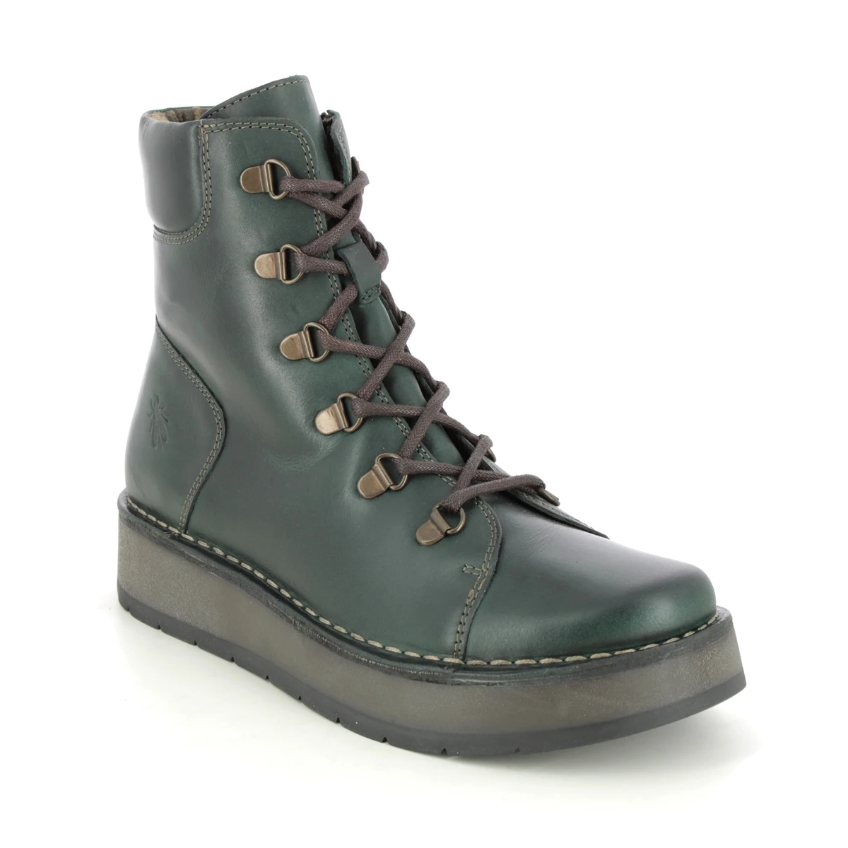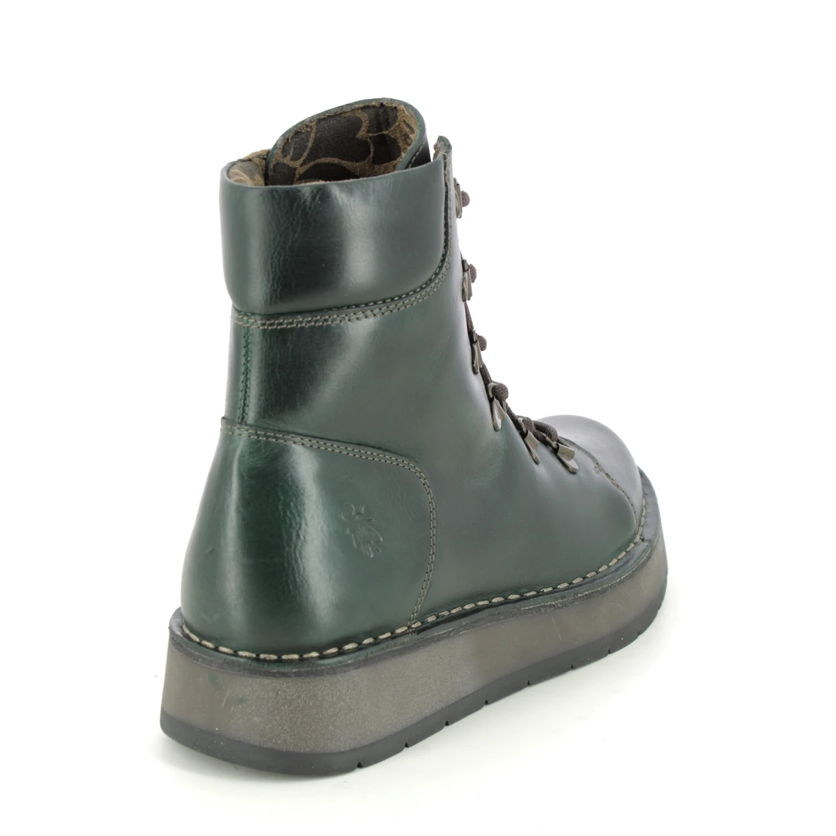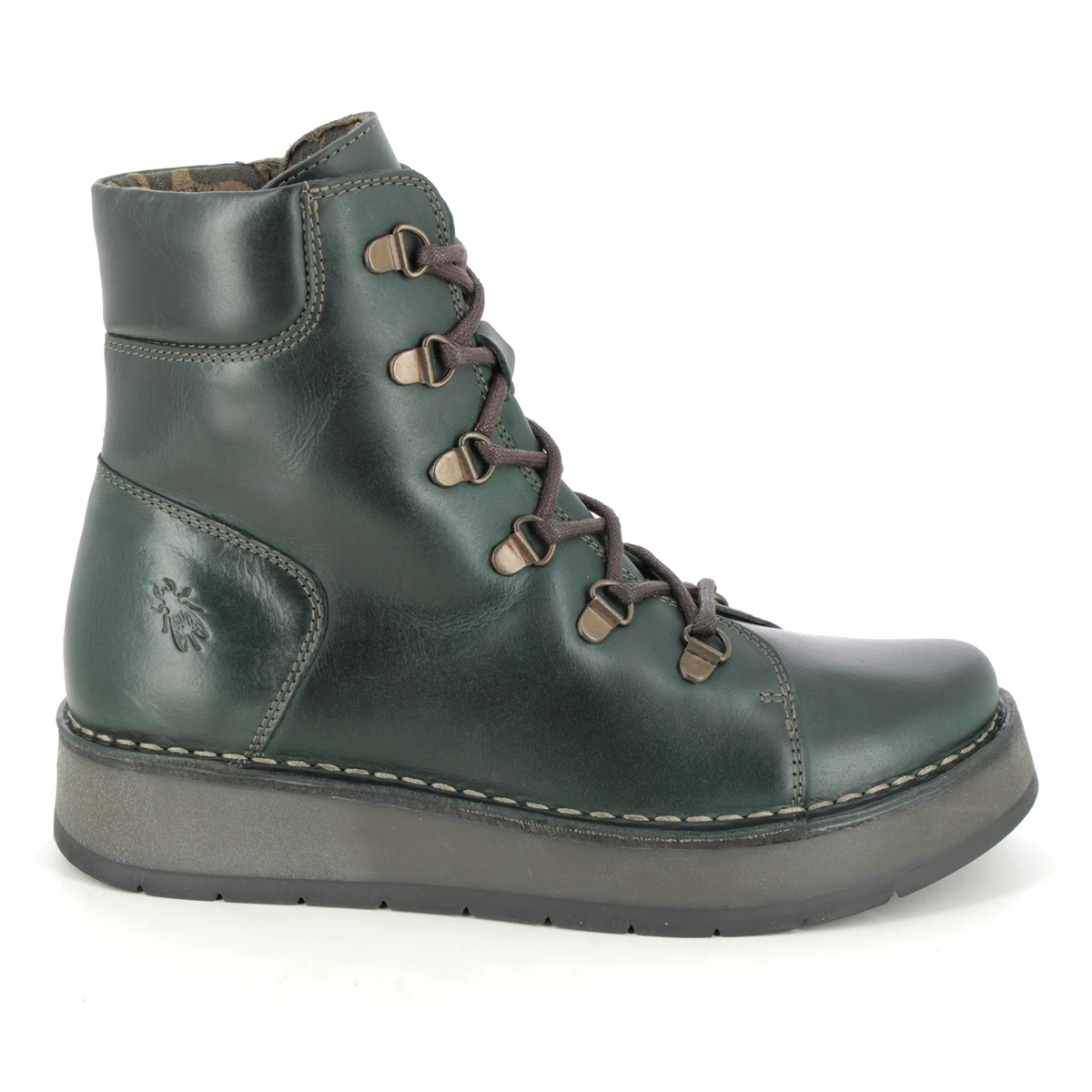 Fly London Roxy Ravi womens petrol leather lace up boots are seen here in a gorgeous dark green shade. The metal hardware and black padded cuff maintain the masculine look whilst the rubber platform wedge sole offers additional stability underfoot. The premium leather uppers have a distinctive distressed yet glossy finish.