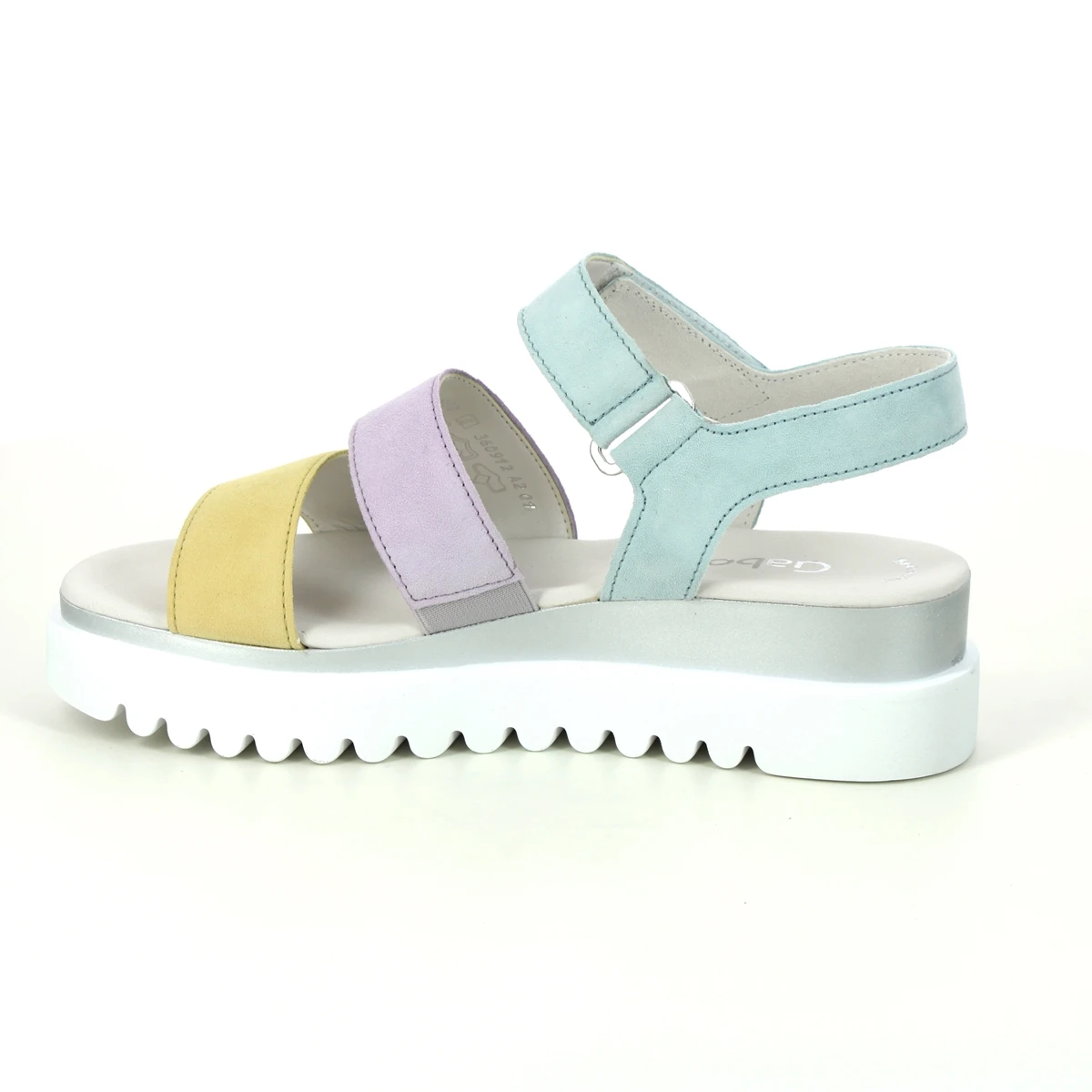 The Gabor Billie women’s blue multi coloured wedge sandals are contemporary and comfortable. These women’s platform style wedges have a multi-coloured leather upper of pastel blue, lilac and pale yellow with an adjustable rip tape strap. The padded footbed is soft against bare feet whilst the platform outsole and low wedge heel measures 35mm at the heel for a little extra height. Pair with mom jeans and a plain white tee for an effortless outfit.