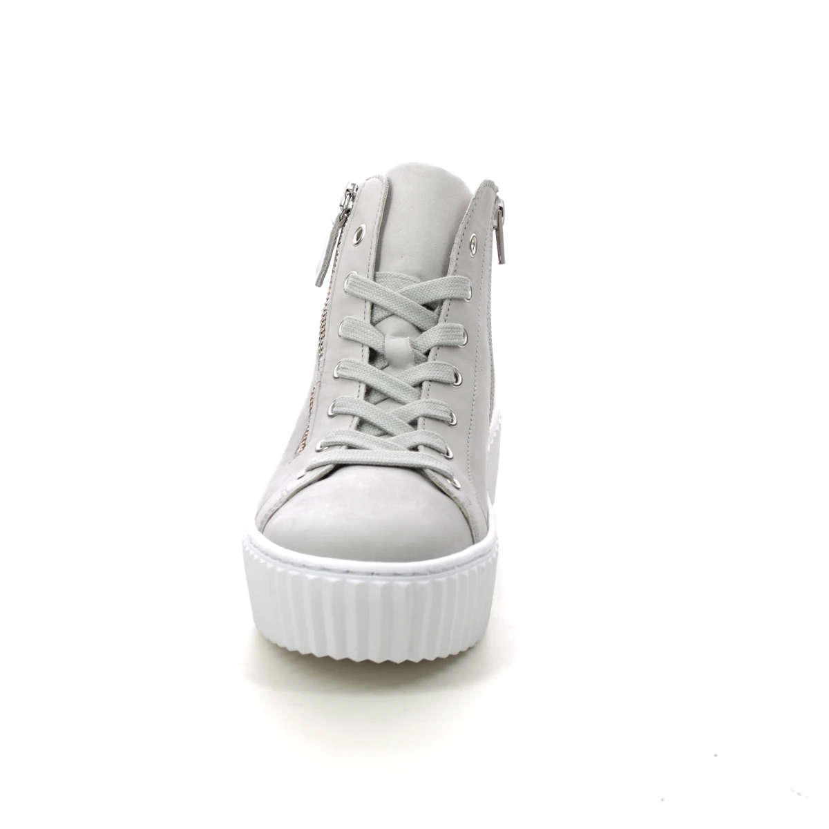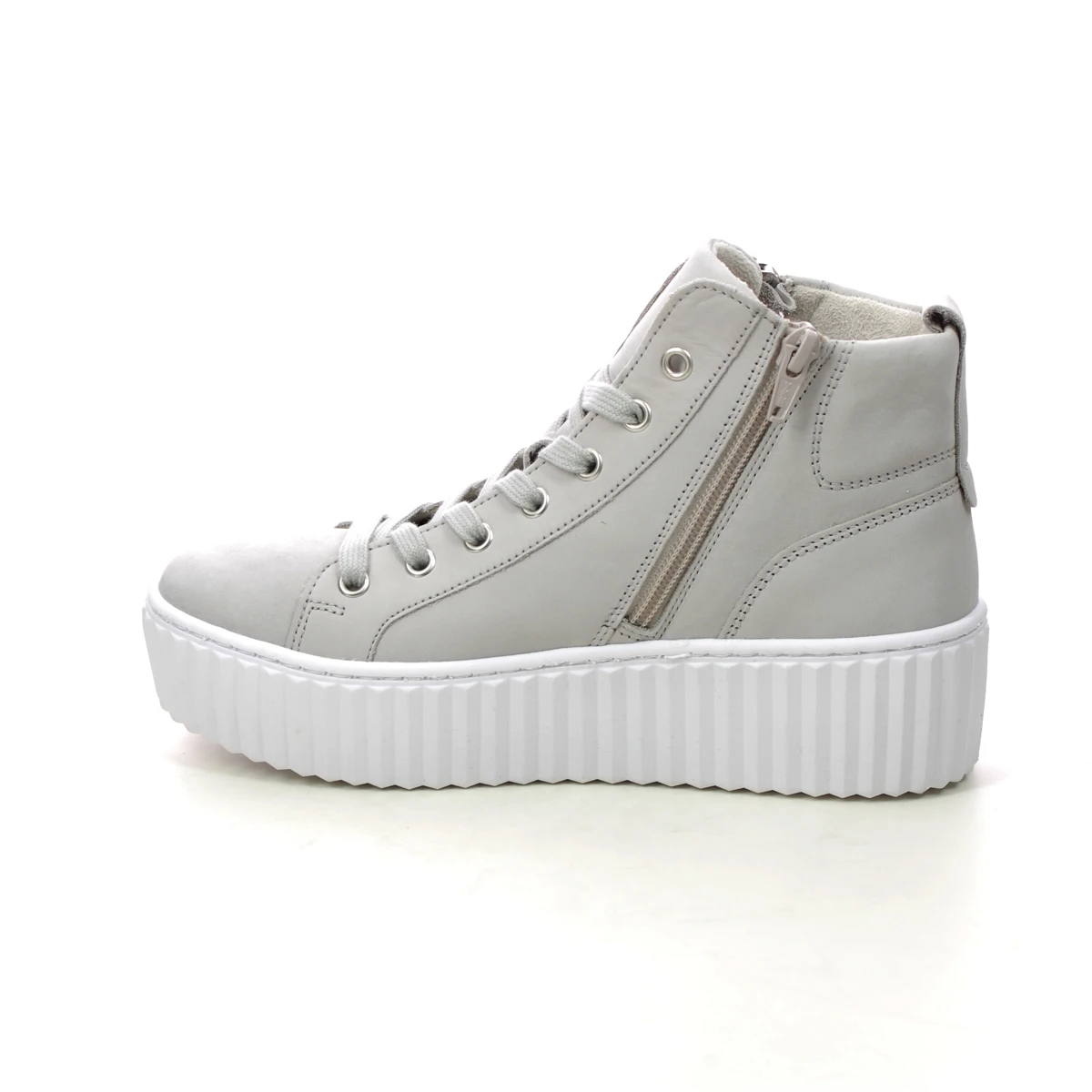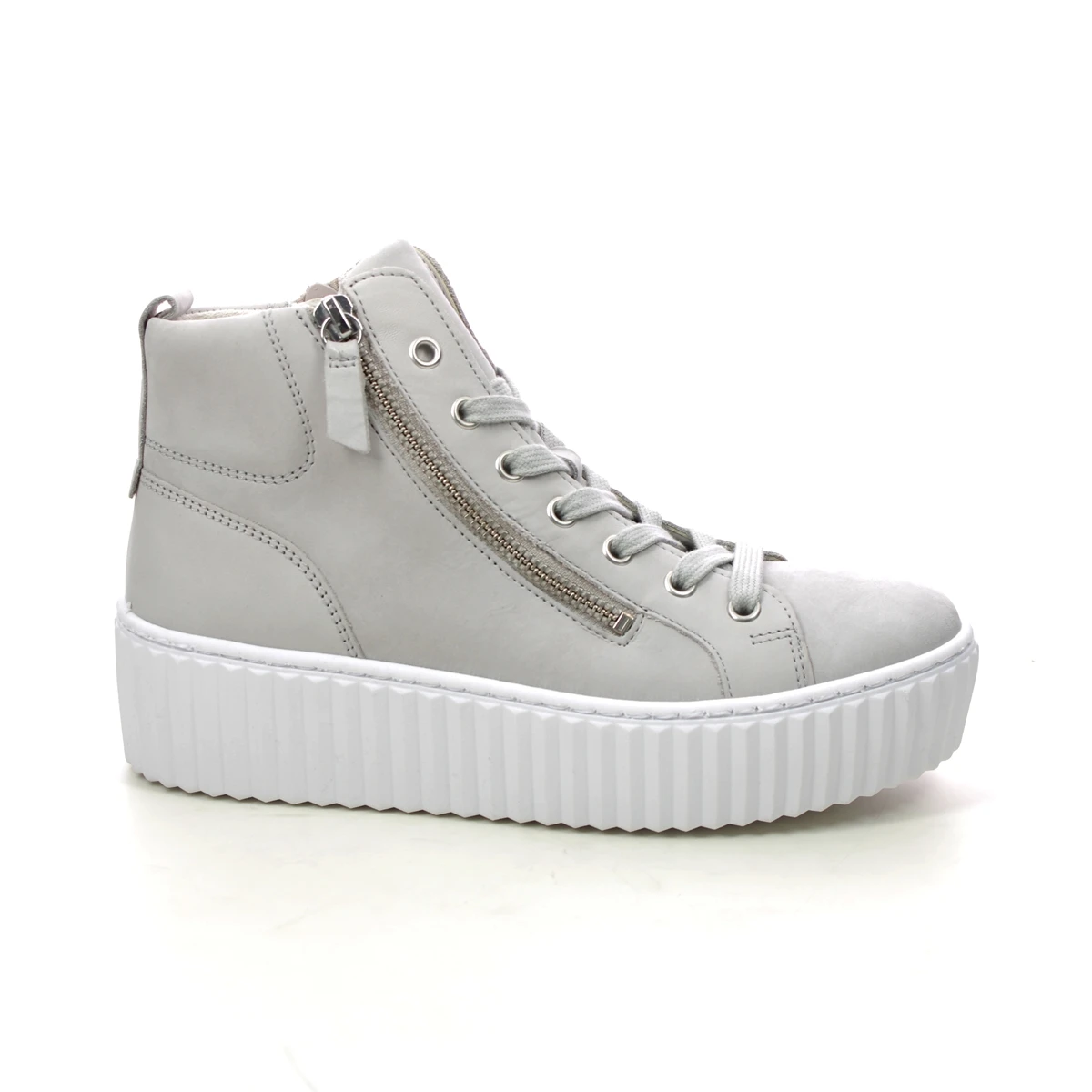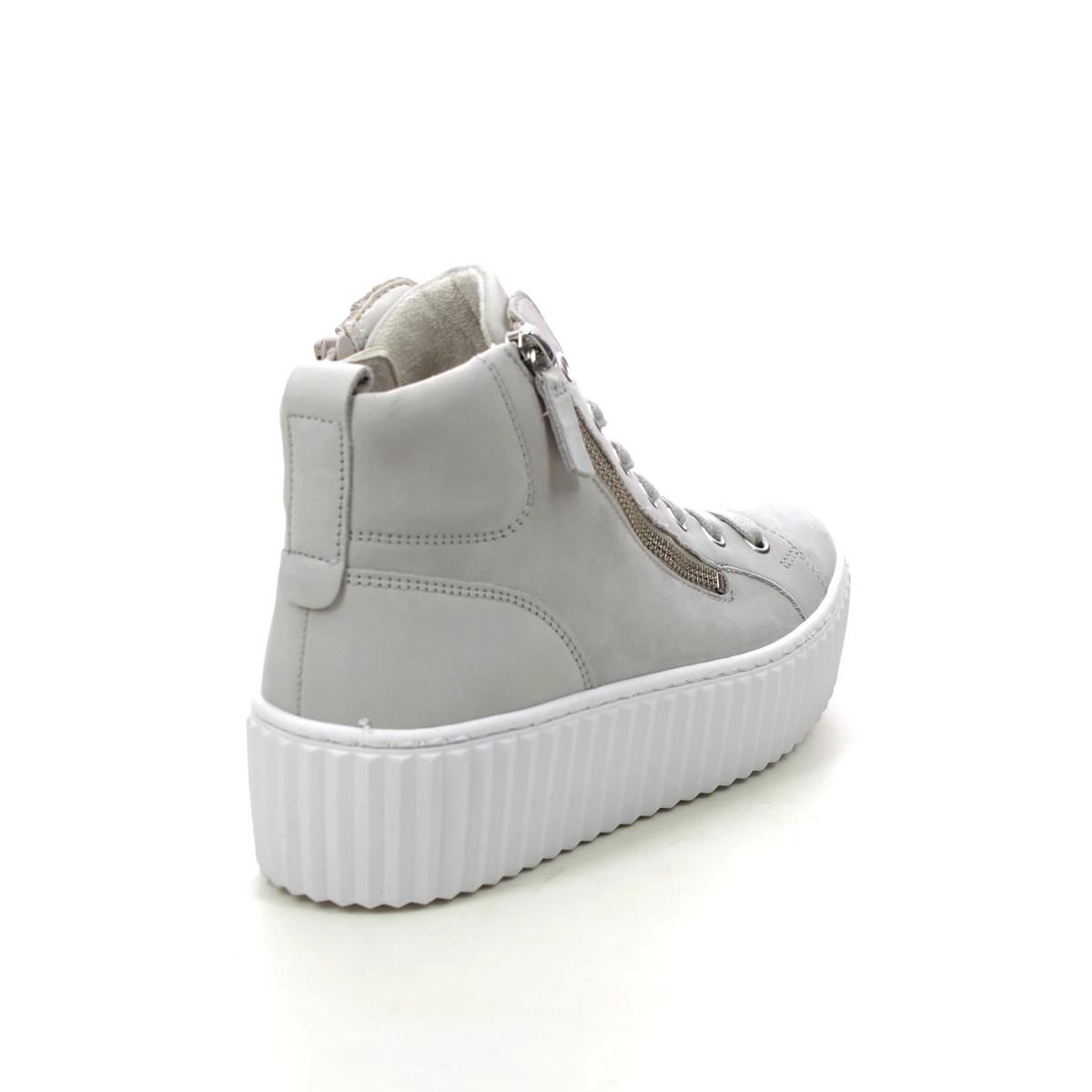 Gabor Debbie Dolly women’s light grey hi top trainers are supportive and contemporary. These women’s grey hi top sneakers have a nubuck leather upper with side zips and lace fastening for adjustable fit. The removable insole offers a more personalised fitting, along with space for your own orthotics if required. The chunky platform sole in contrasting white keeps these lace up boots contemporary. Pair with a midi skirt and printed tee for a stylish outfit.