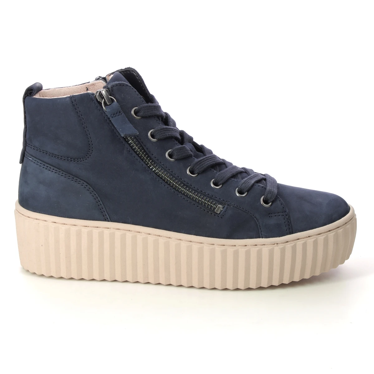 The Gabor Debbie Dolly women’s navy hi top trainers have a soft suede leather upper with side zip and lace fastening. These women’s trainer boots have a platform sole measuring 45mm for extra height underfoot, and the removable insole offers additional space if required.