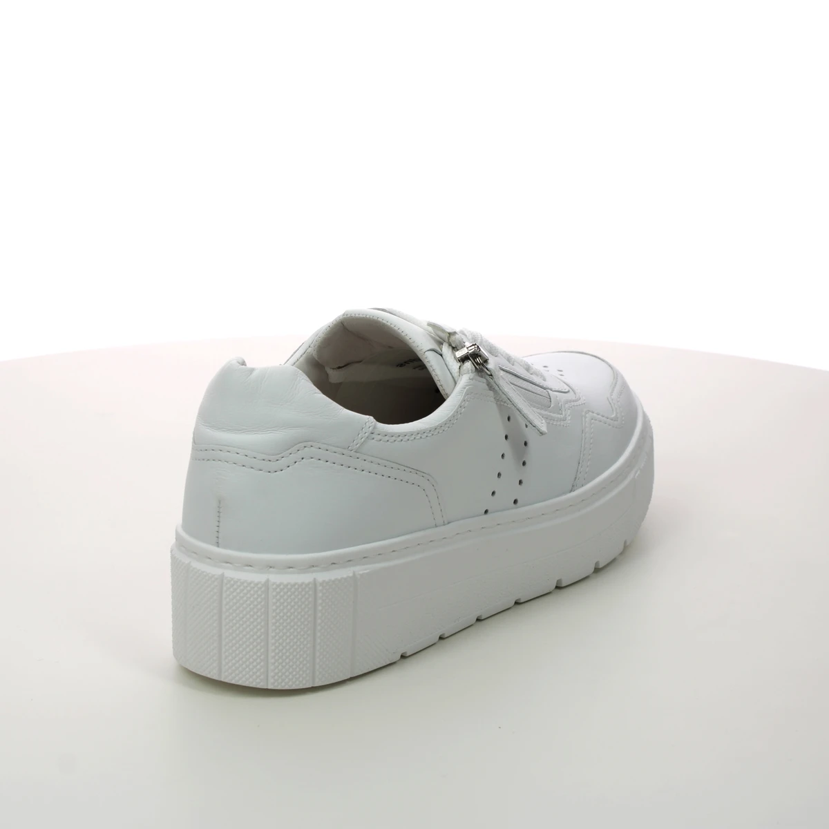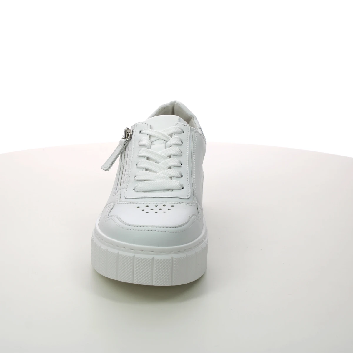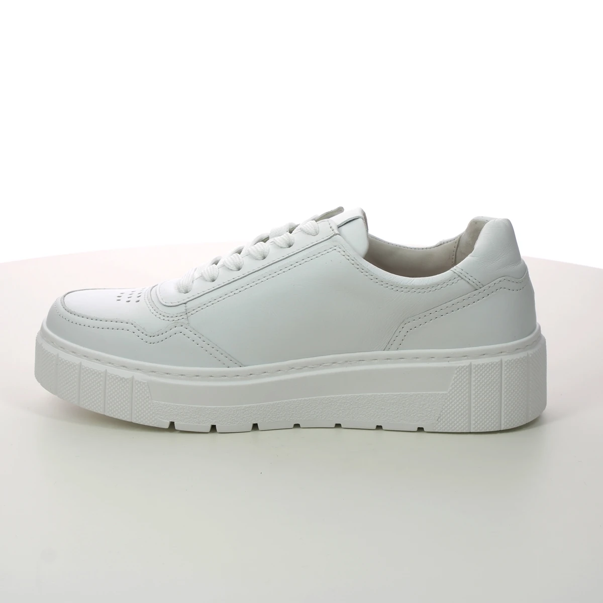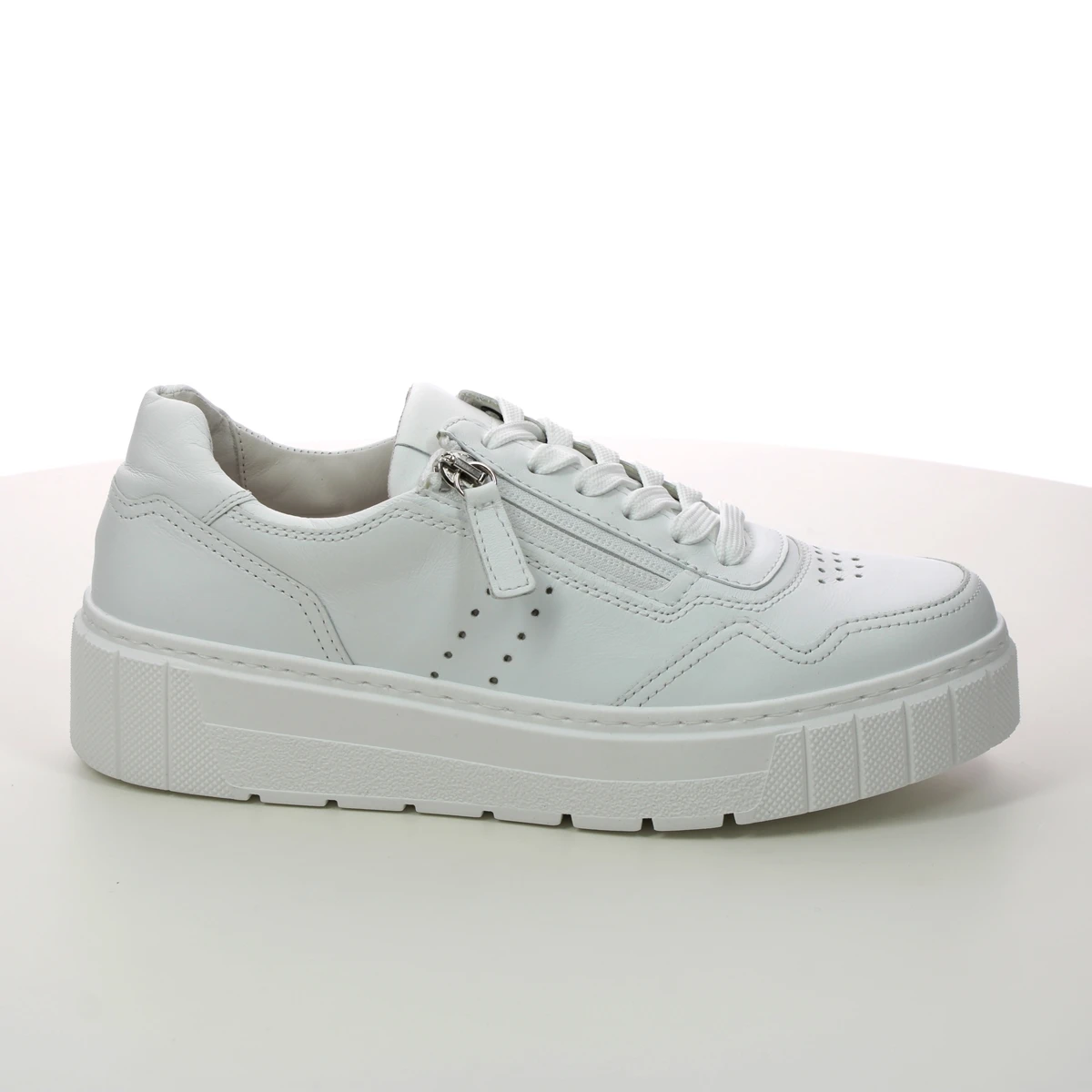 Gabor Farica women’s white leather trainers are trendy and sporty. These women’s white platform trainers are reminiscent of Nike Air Force sneakers, this time made with premium leather materials. There are perforations over the toe and retro inspired overlays. The handy side zip and full lace ensures a secure and adjustable fastening, whilst the padded removable insole offers additional space.