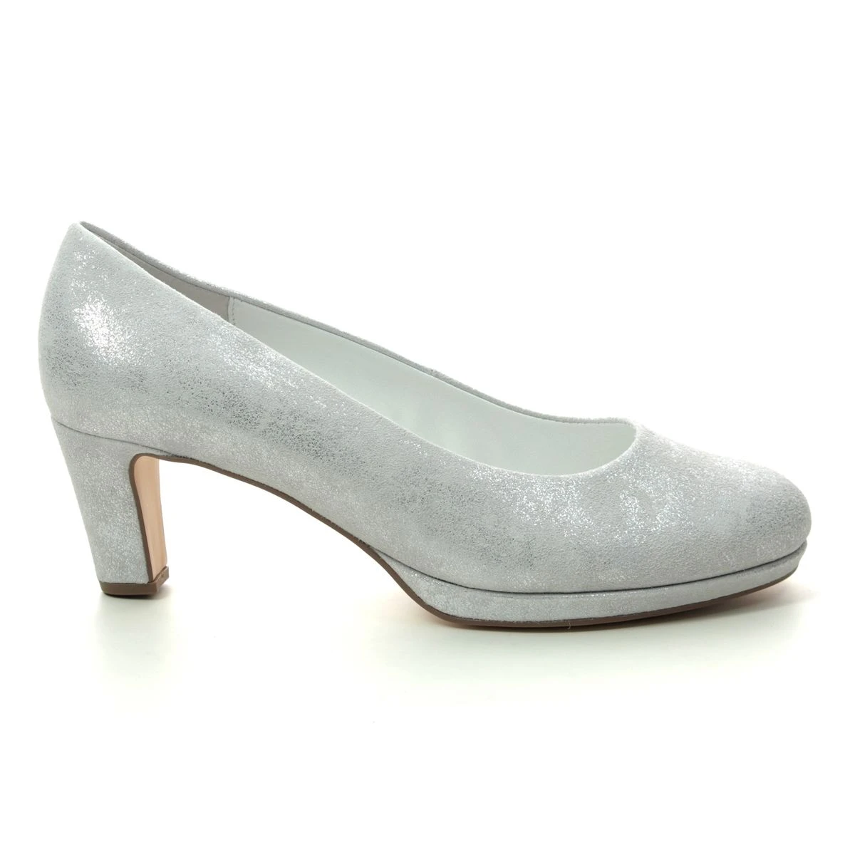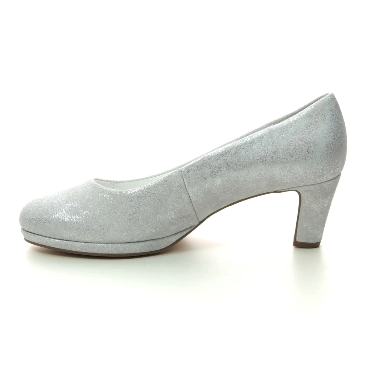 Gabor Figaro 21.260.43 is a classic silver low court shoe. The sparkly heeled shoes have a super soft upper with a rounded toe. A platform under the toe box and the broad 50mm heel will help you stand steady on your feet, and the padded footbed will maintain the utmost comfort during wear. Gabor heels are known for being comfy and often have extra width to facilitate an exceptionally comfortable fit. These Gabor silver shoes are easy to wear and extremely versatile, so can be worn for work, evenings out or special occasions. Wear with straight trousers and a crisp white blouse for a professional look, or pair with a floral dress for a special occasion