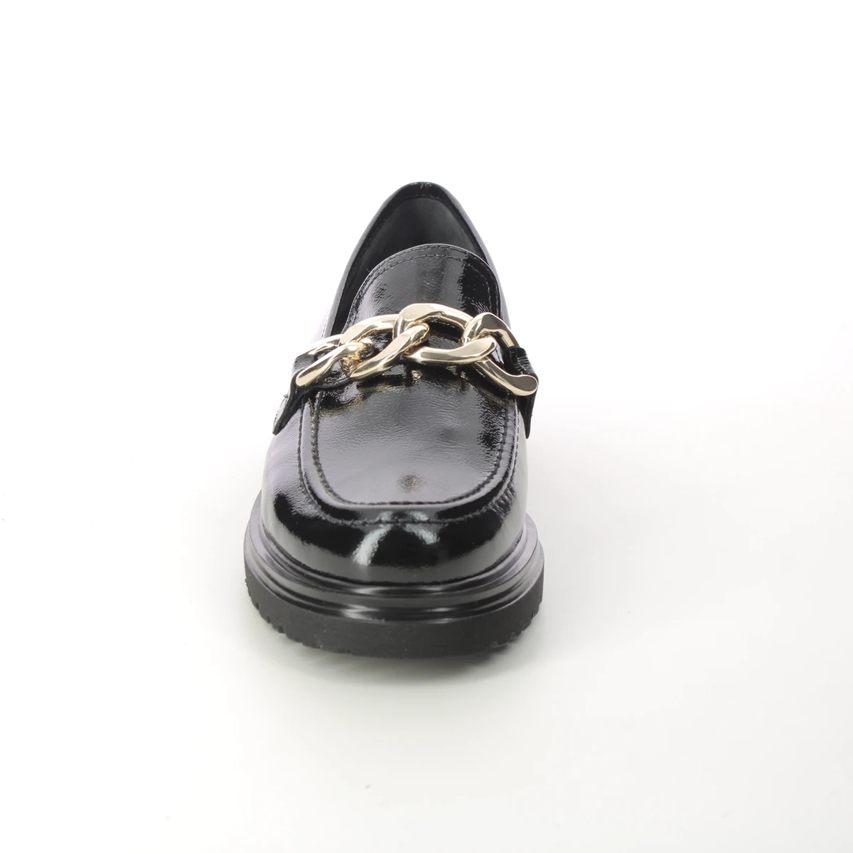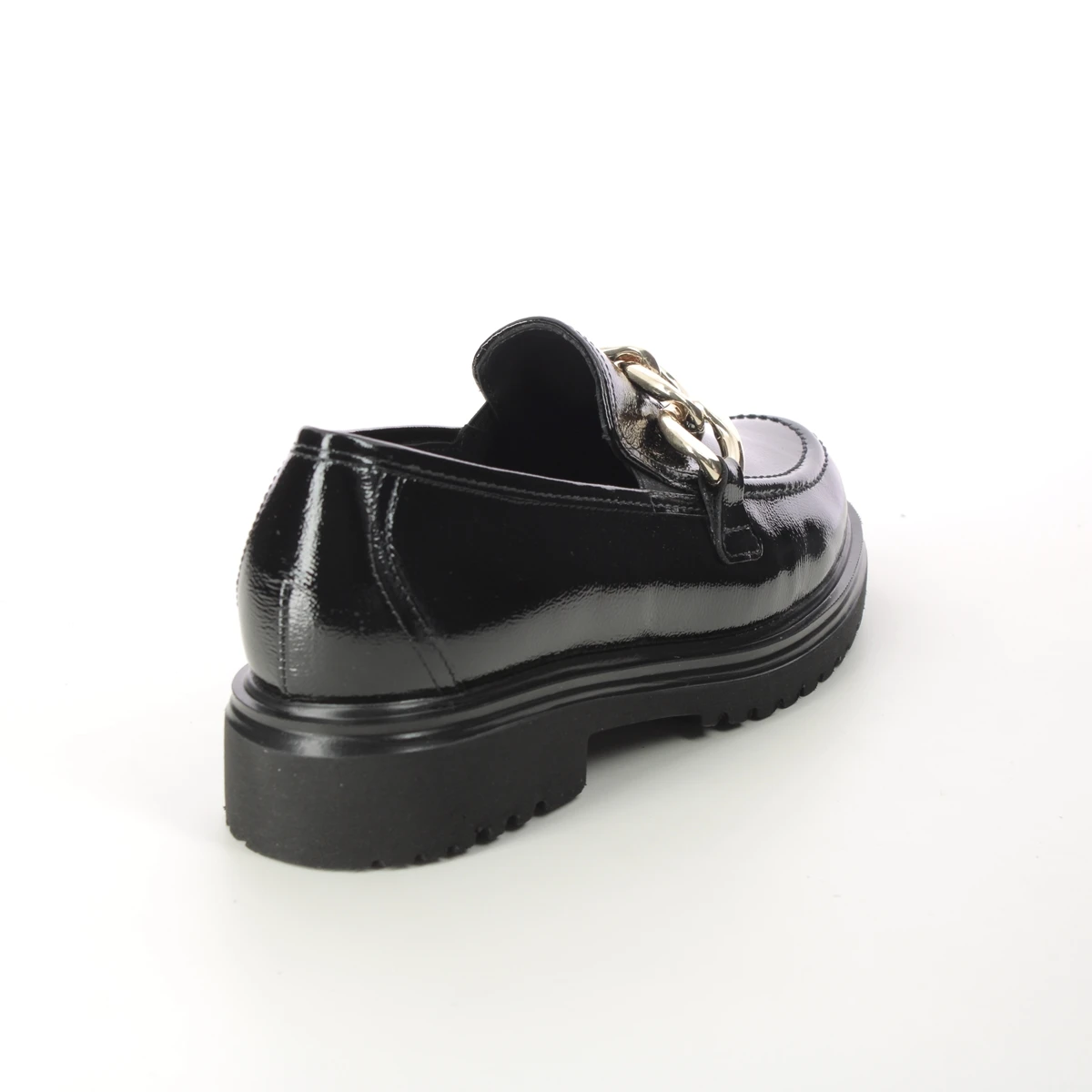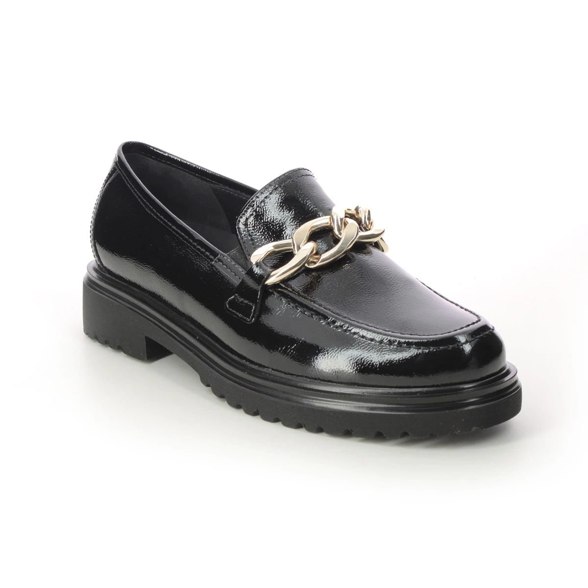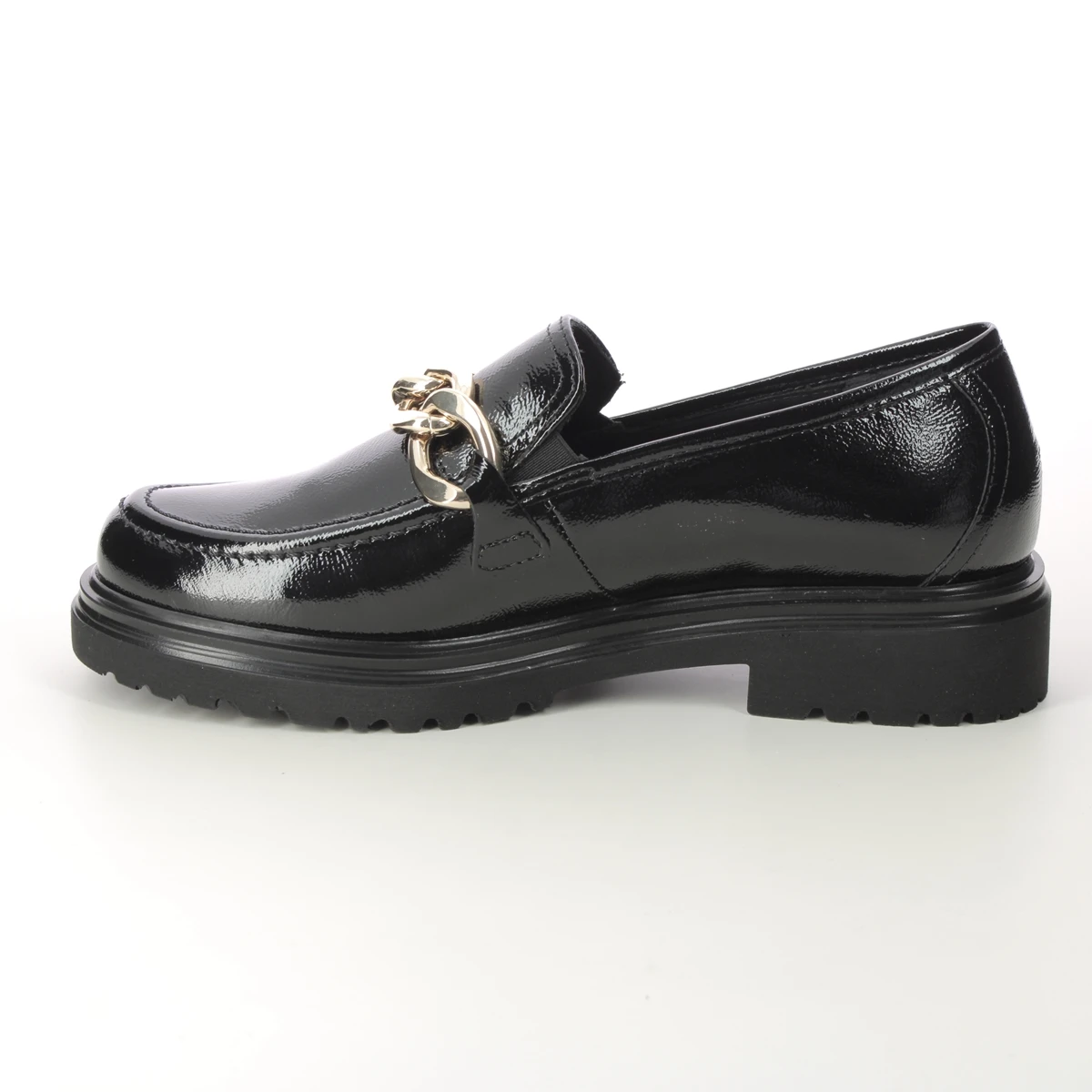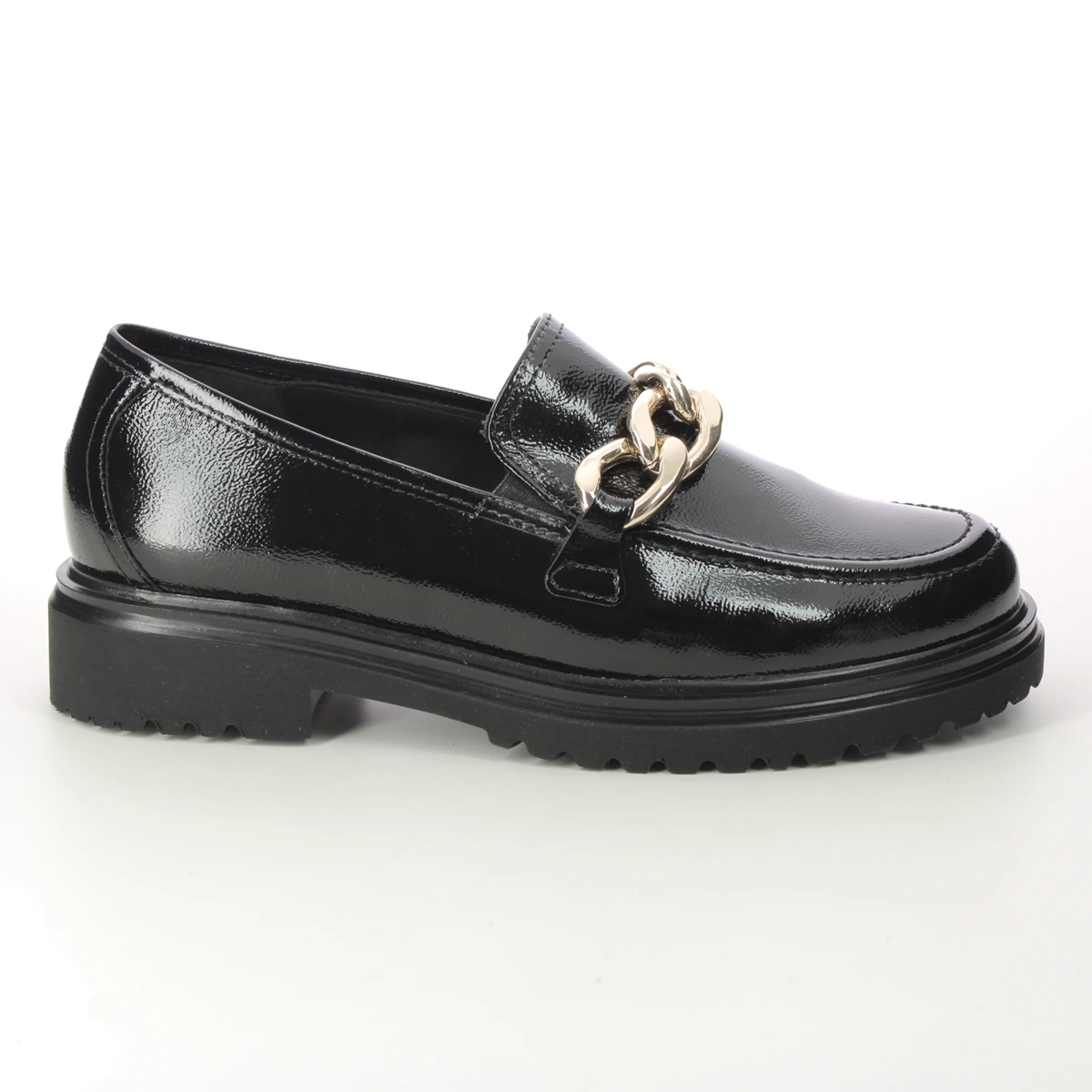The Gabor Florida womens black loafers combine a classic silhouette with contemporary details. These womens loafers have a black patent leather upper with a chunky gold chain design over the toe. The cleated sole measures 35mm at the heel and maintains the fashion-forward look of these black slip on shoes.