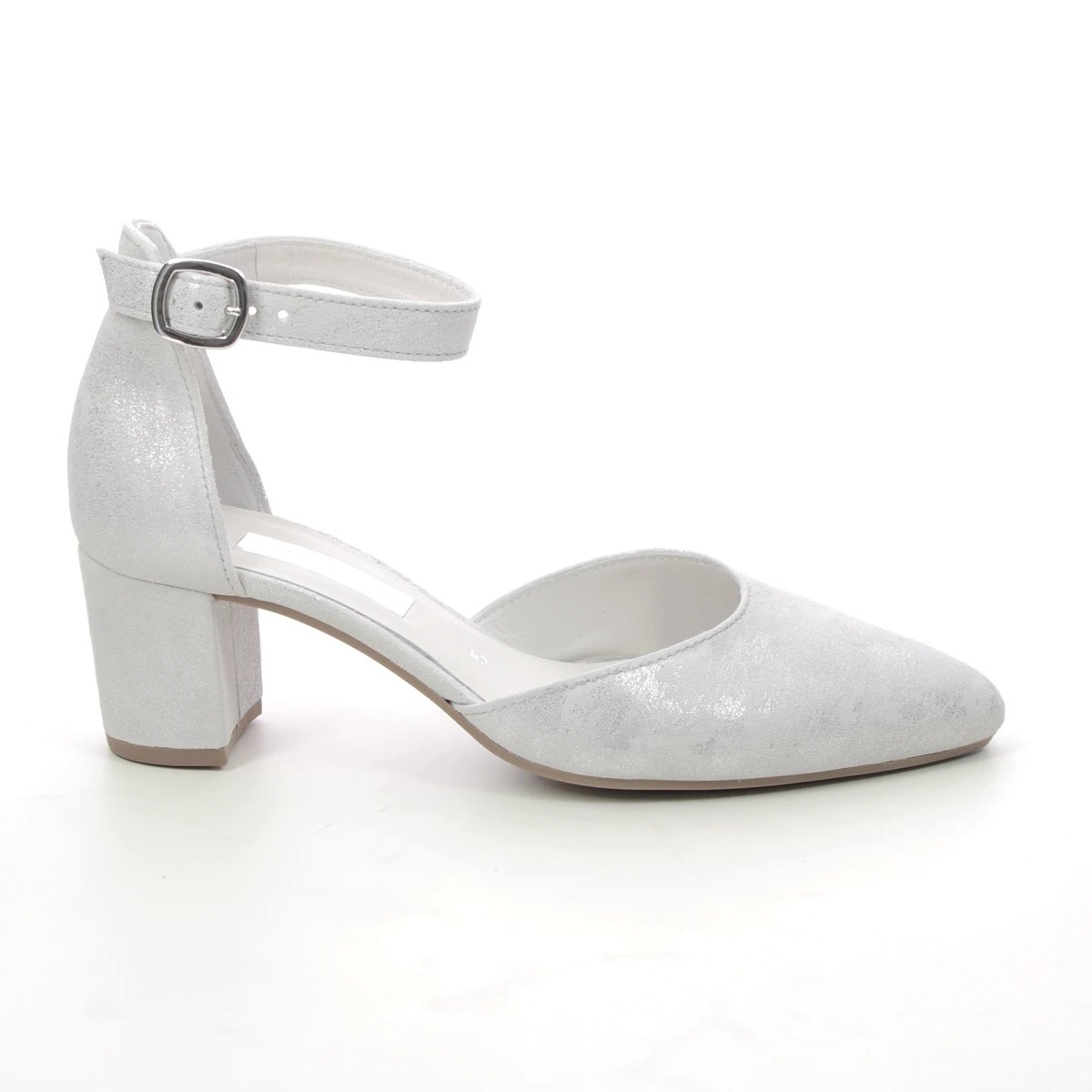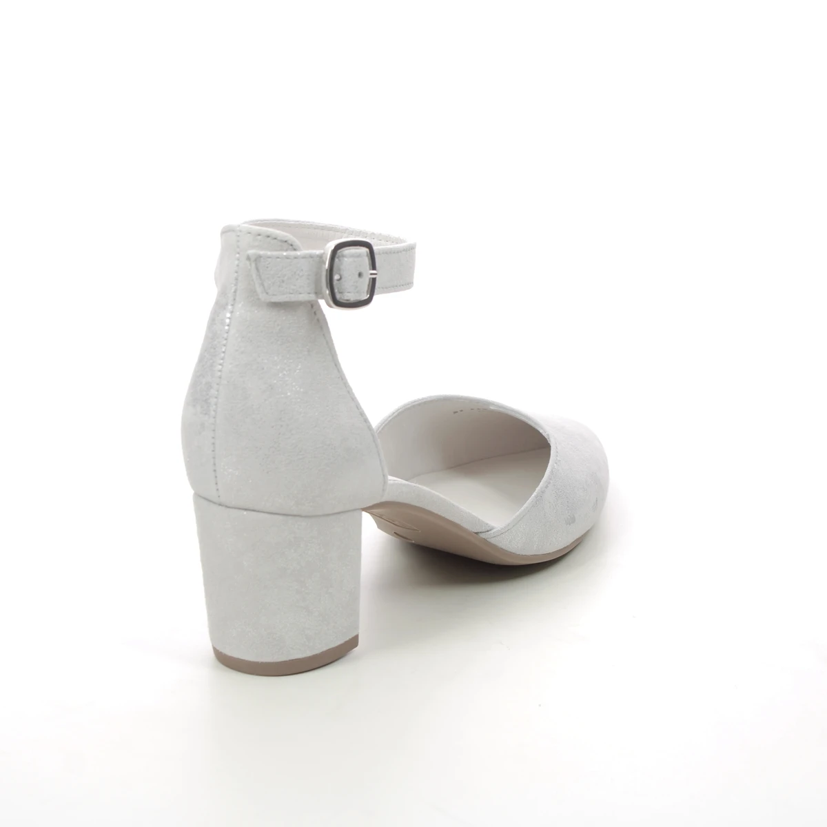 Gabor Gala women’s off white court shoes are perfect for special occasions. These women’s block heeled shoes have an off white suede upper with a subtle shimmer. The covered heel back and adjustable ankle strap and buckle ensure a secure fit, whilst the covered block heel measures just 55mm for extra height without compromising on comfort. These Gabor Gala heels were a popular style last season so we don’t expect them to be around for long!