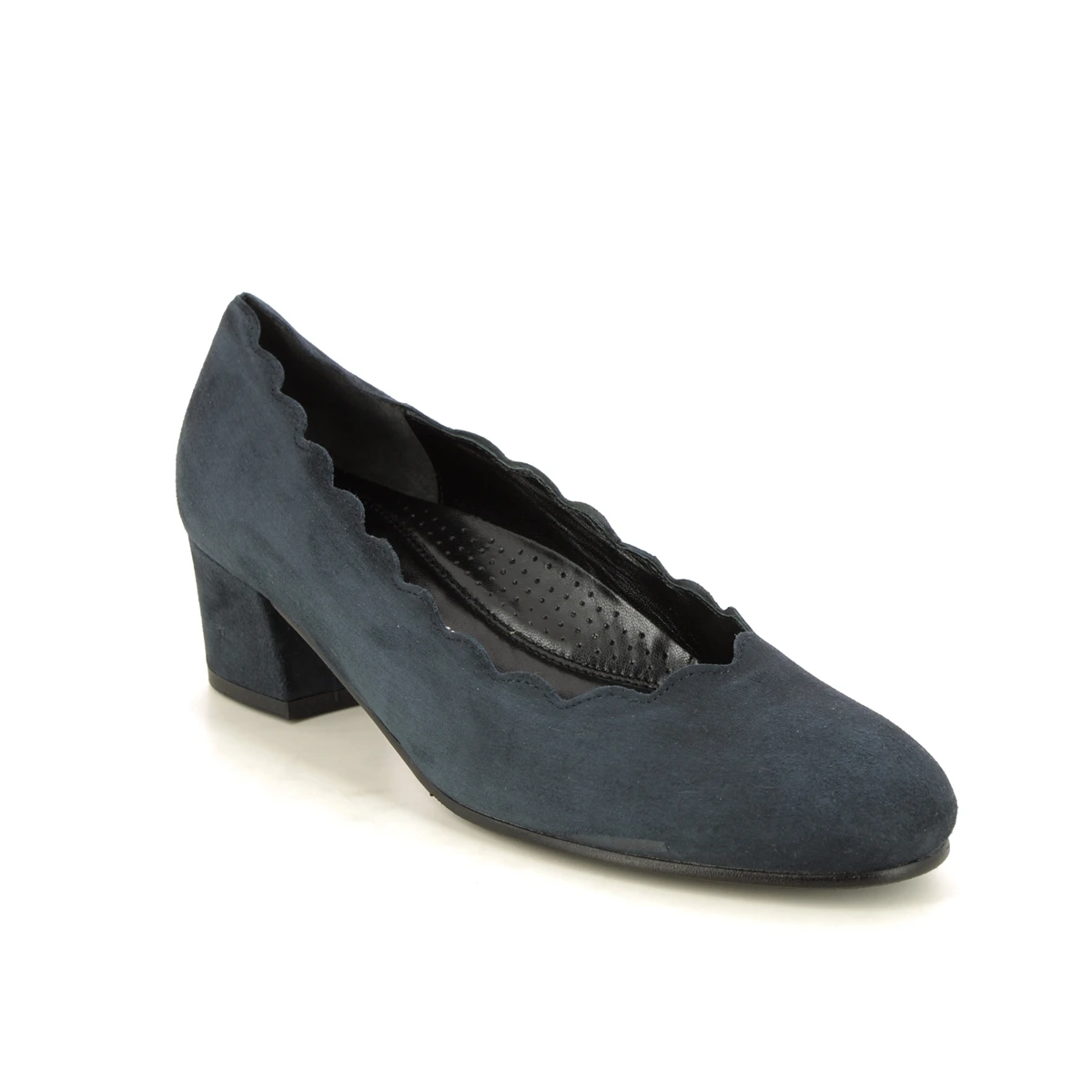 The Gabor Gigi Dallas womens navy suede court shoes are comfortable and flattering. The suede leather upper is scalloped around the top trim which is both flattering and flexible. The covered block heel measures 40mm.