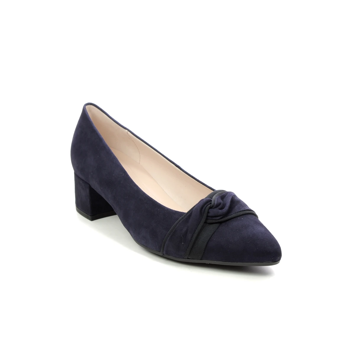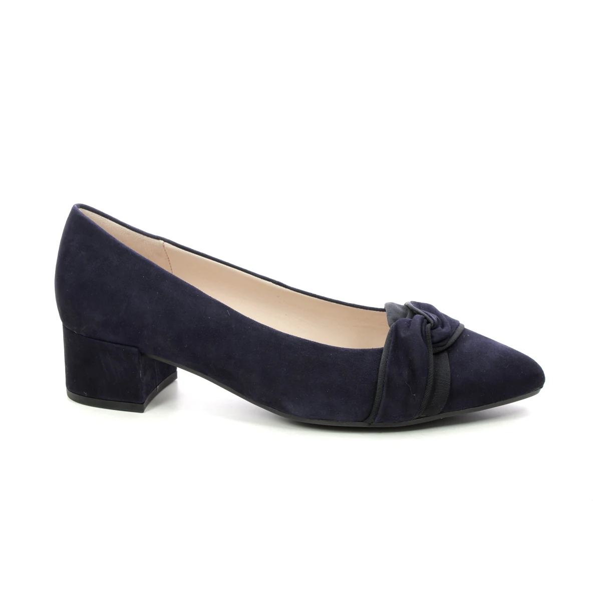 The Gabor Harding women’s navy court shoes offer comfort and a smart appearance. These women’s low heels have a soft suede leather upper with a ruched bow detail over the toe. Perfect for comfort at special occasions, the covered block heels measure just 40mm for extra support underfoot whilst the padded leather footbed ensures superb comfort for all day wear.