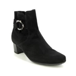 The Gabor Hemp womens heeled boots in black suede offer a little extra height. These womens black ankle boots have a suede leather upper simply decorated with a silver buckle design on the side. The interior side zip offers easy foot entry whilst the stacked block heel measures a very wearable 40mm.