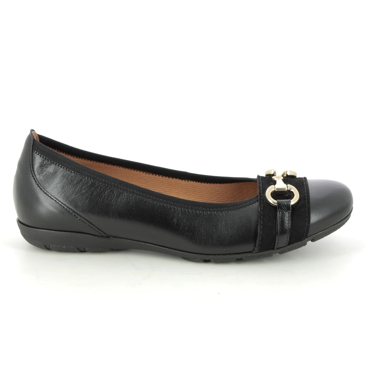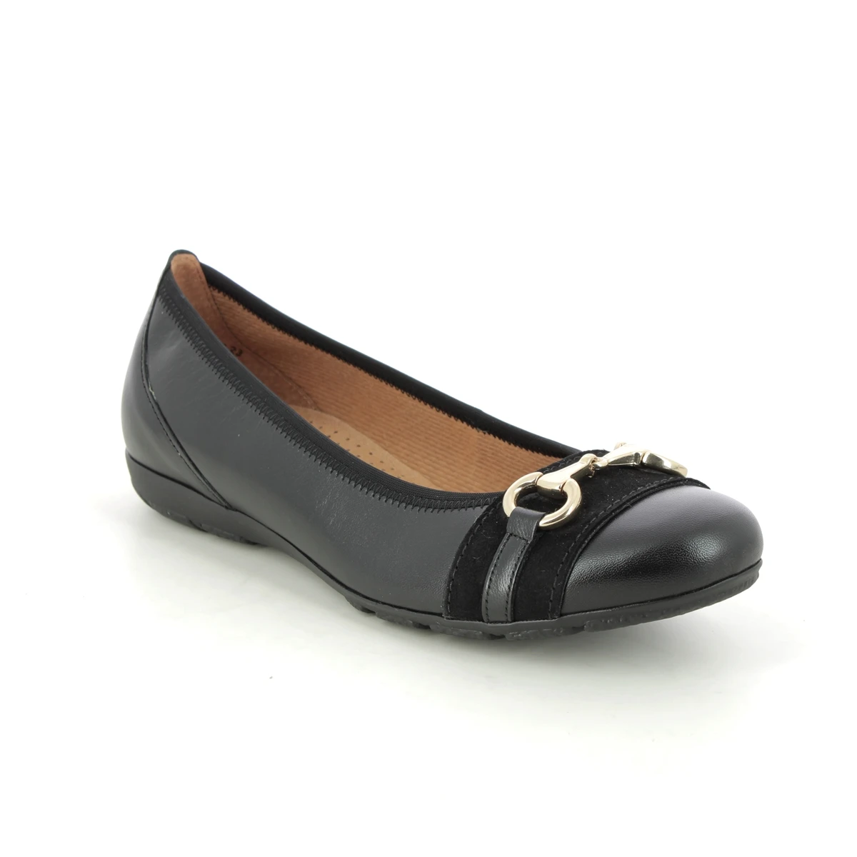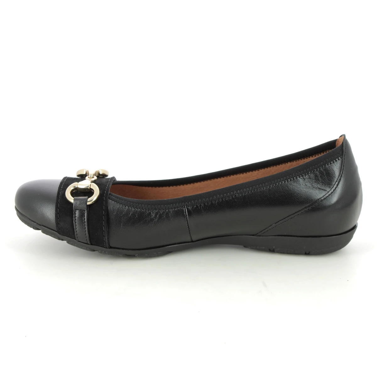 Gabor Raif Hovercraft women’s black leather pumps are comfy and versatile. These women’s Gabor pumps have a smooth black leather upper with stretchy top trim for a secure fit. There is a pretty gold buckle detail over the toe for added interest whilst the padded footbed and supportive outsole offers excellent comfort underfoot.