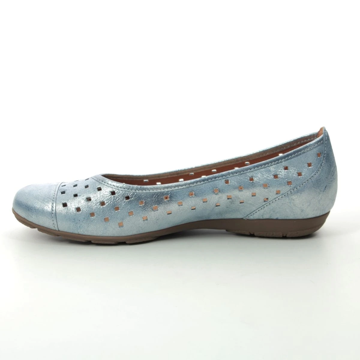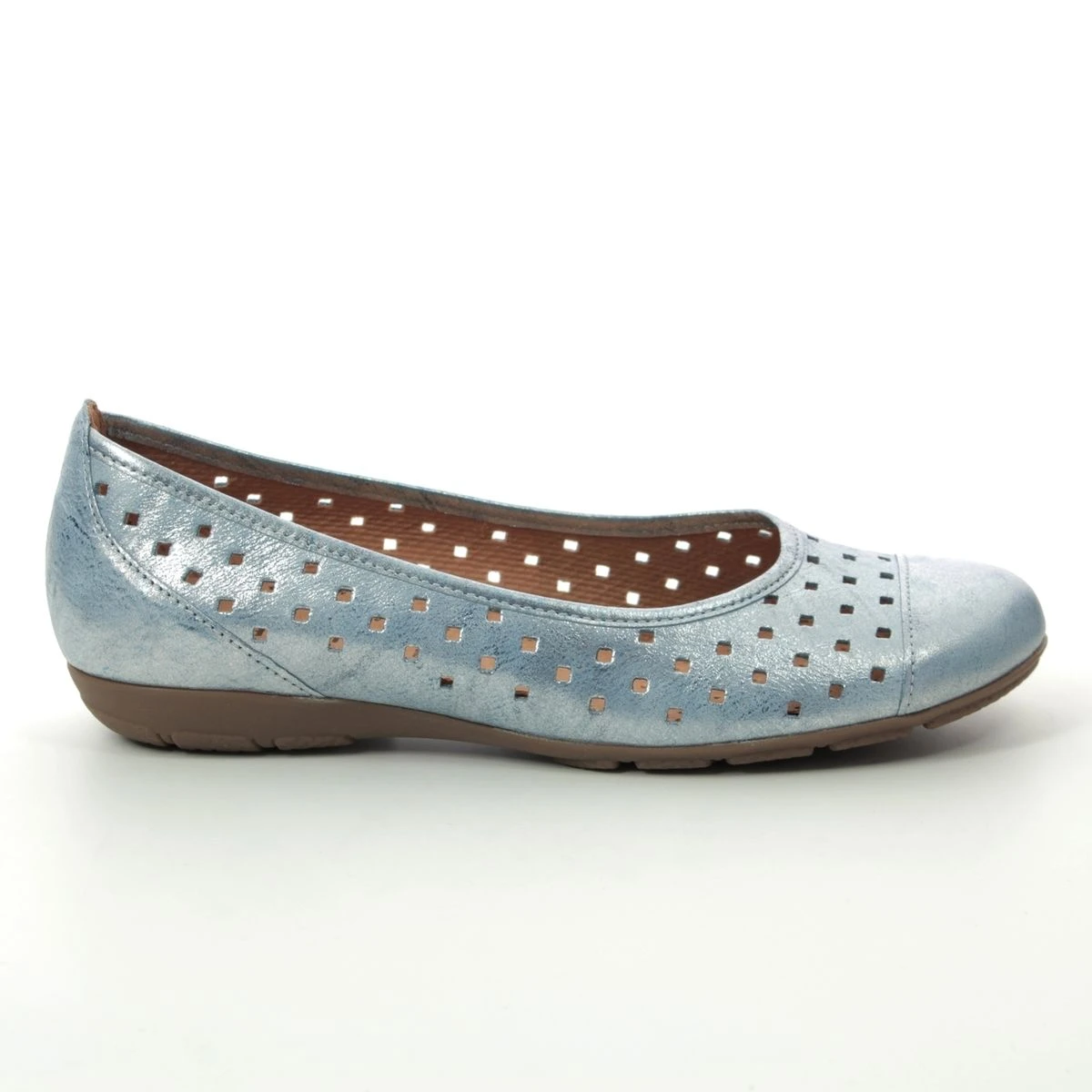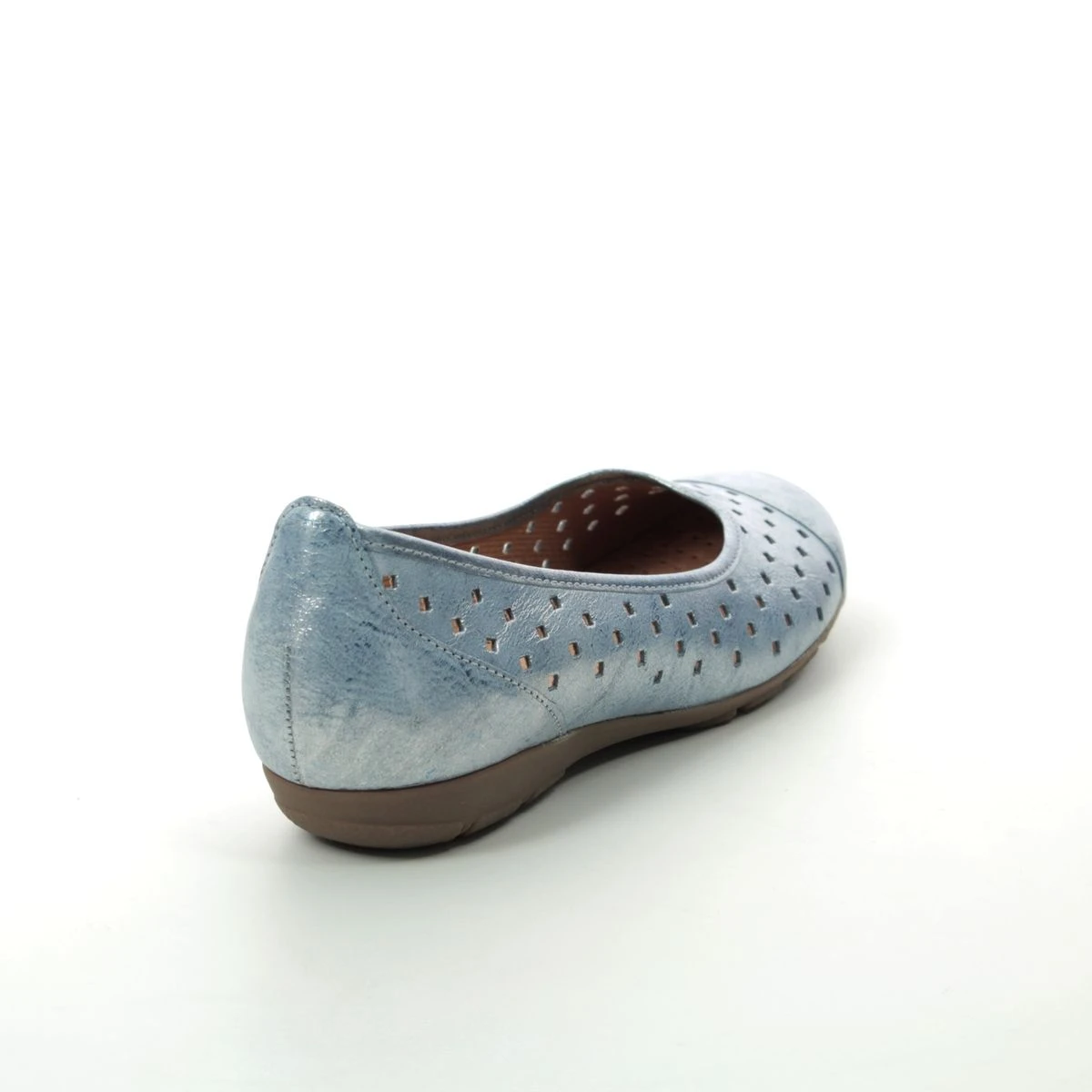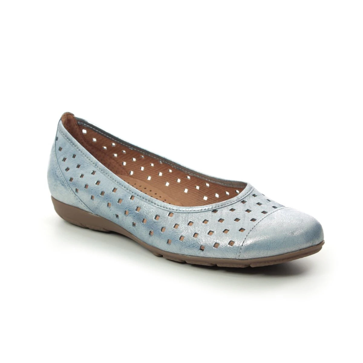 Gabor Ruffle pumps offer superior comfort with versatile styling. The upper comprises of pale blue leather with perforations throughout for a super multi-finish flat shoe. These Gabor pumps can be worn with lots of outfits and colours making it an excellent choice for work wear and smart casual looks. Wearable with trousers skirts dresses and tights this style is extremely versatile. The heel backing and toe cap overlays provide additional support and the raised heel back will help to protect your heel. Soft lining and a padded footbed will keep you comfortable during wear and the outsole will help to improve grip.