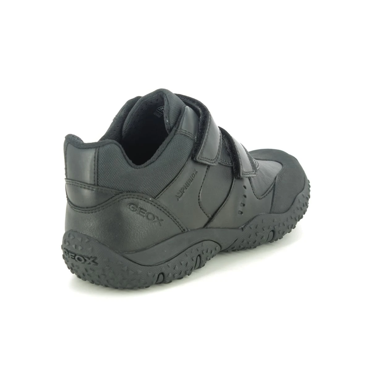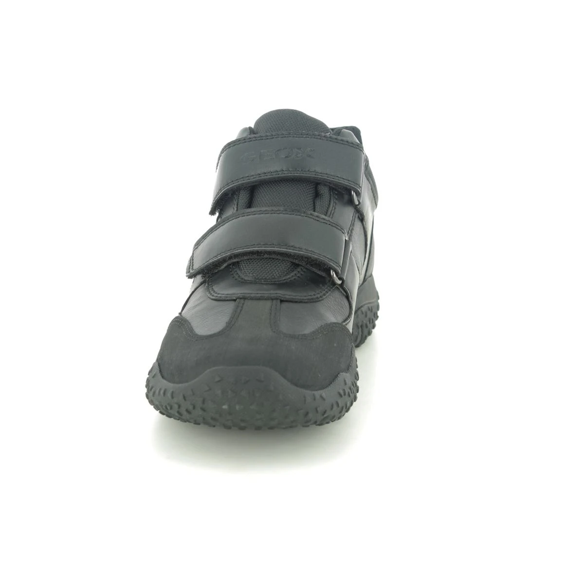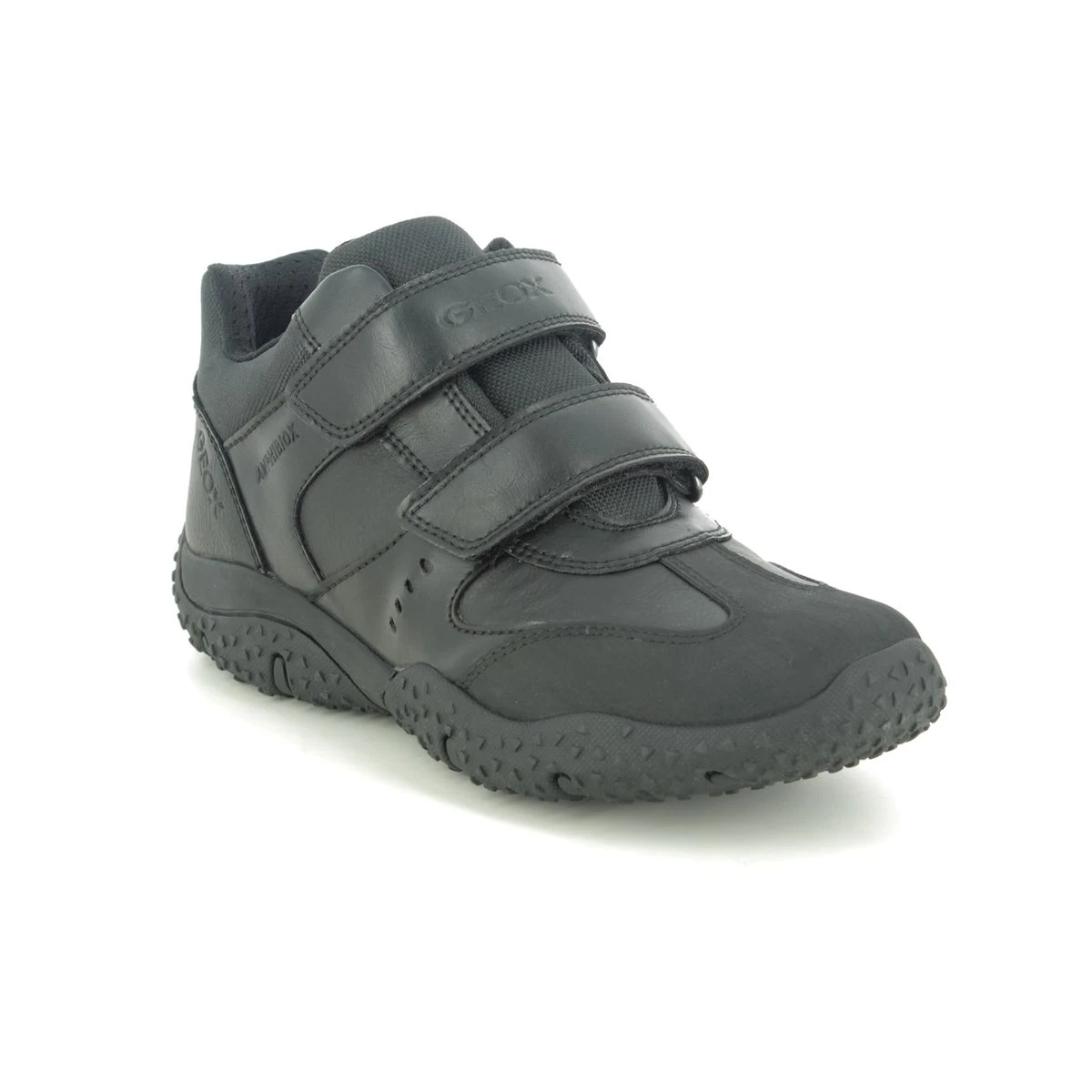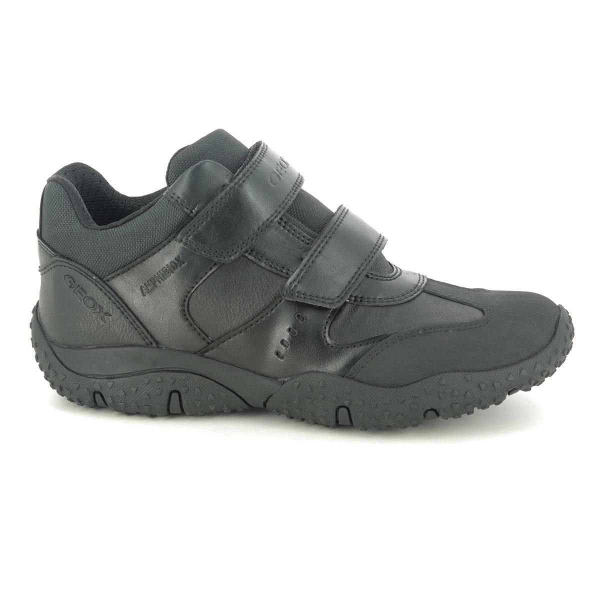 Geox boys shoes are ideal for school. These black waterproof boots have a smooth leather upper with additional overalys for added durability. The two velcro straps offer easy fastening and the padded tongue and collar ensure a snug and comfy fit. The outsole has grooving for better grip making these boys school shoes a good option for the winter season.