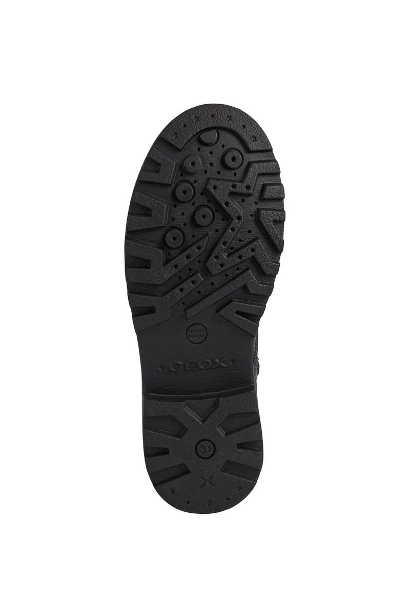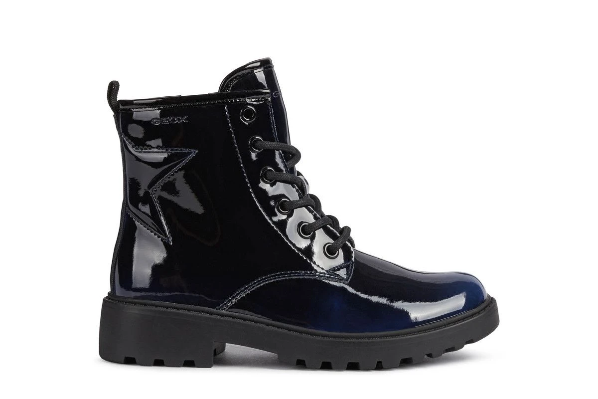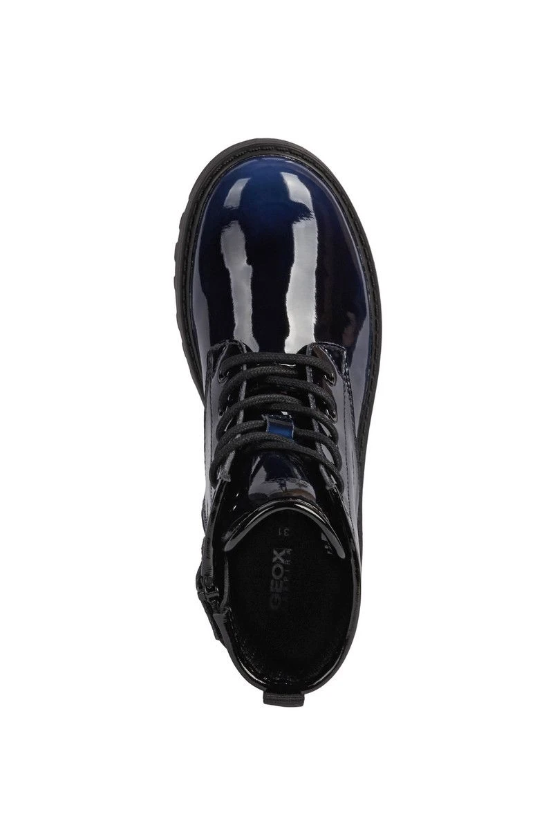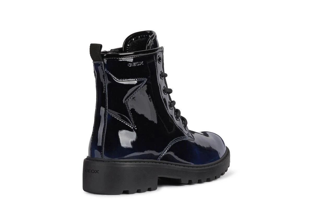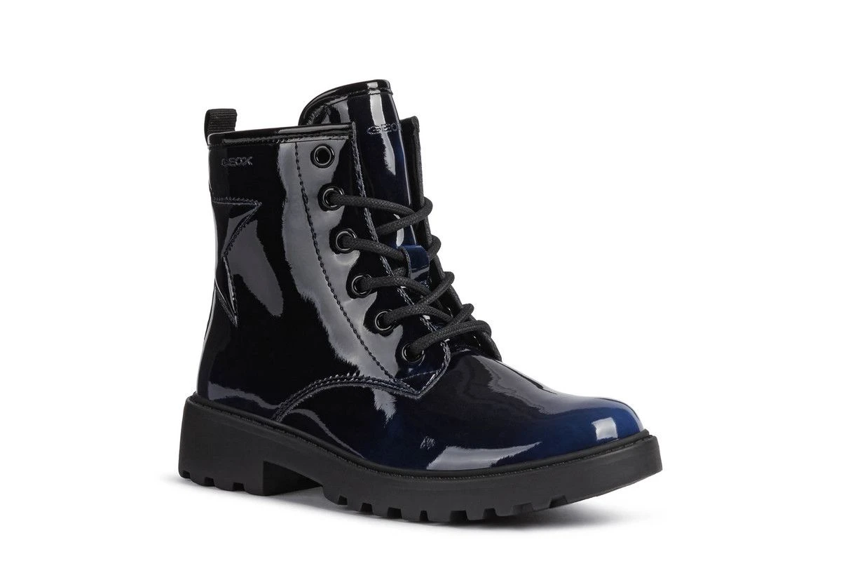 These Geox girls boots are stylish and sophisticated. Featuring a navy patent effect upper these girls lace up boots are ideal for both school and casual wear. There is a handy zip to aid a quick fastening whilst the cleated sole unit is smart and practical.