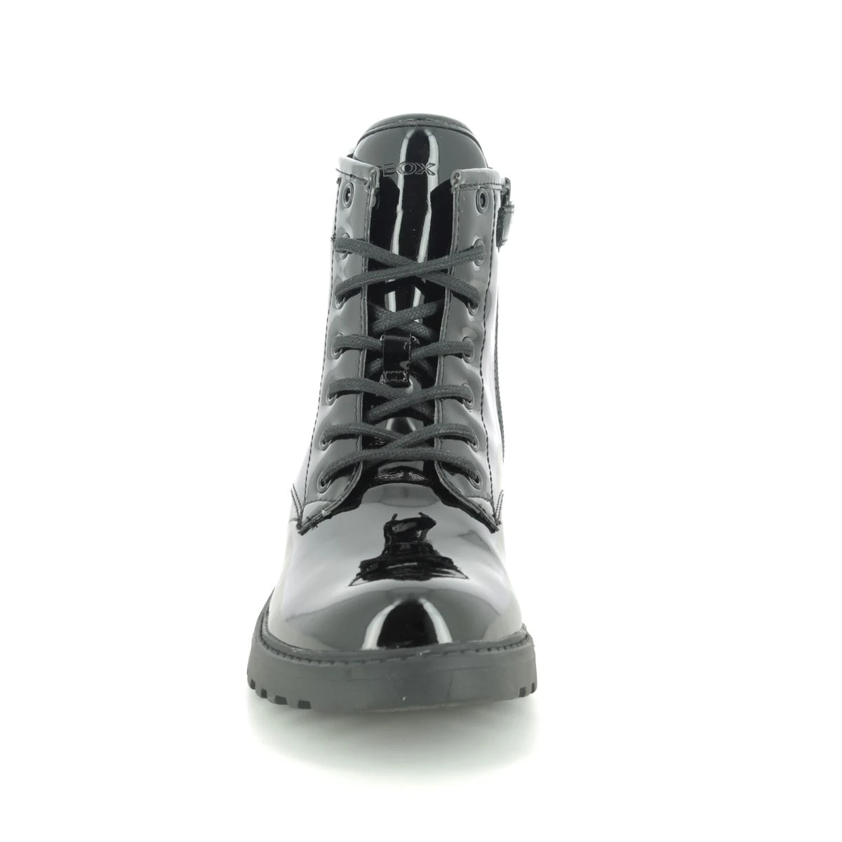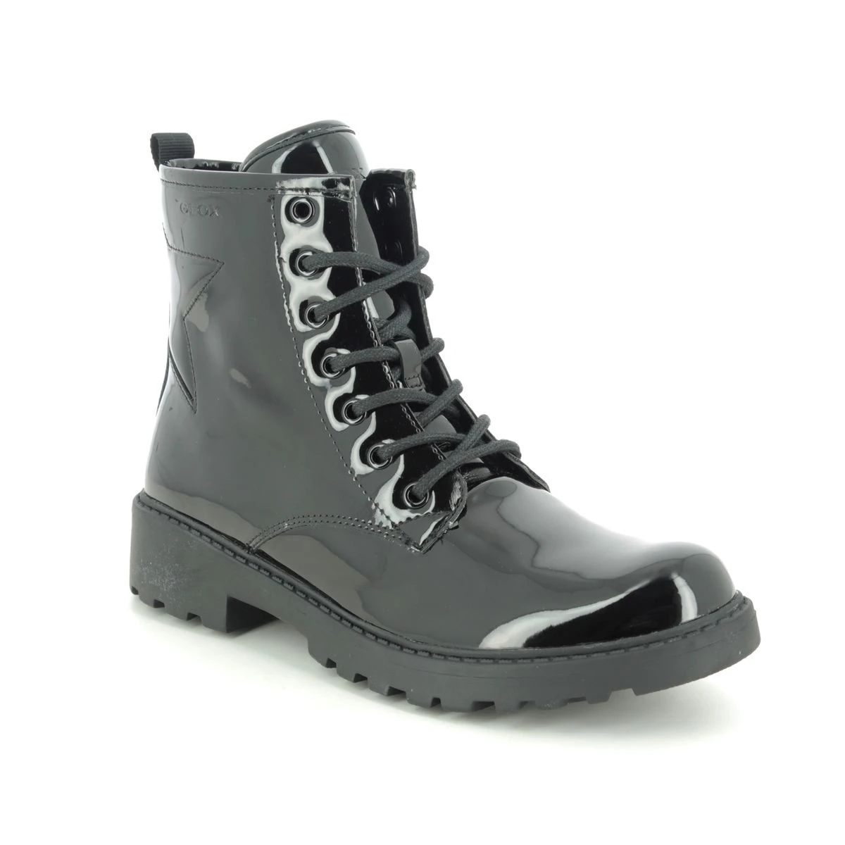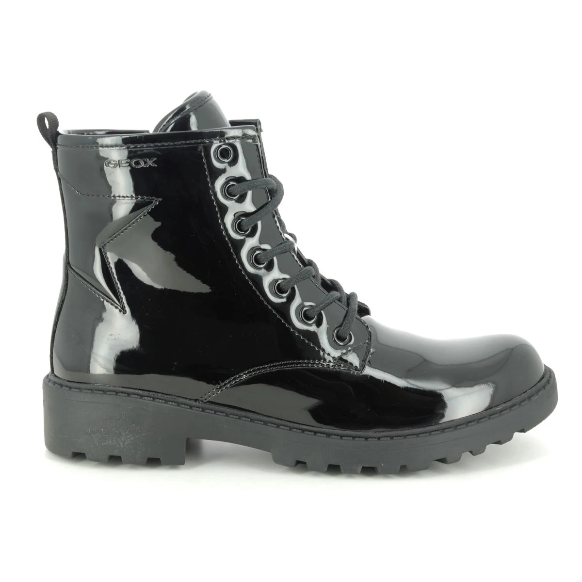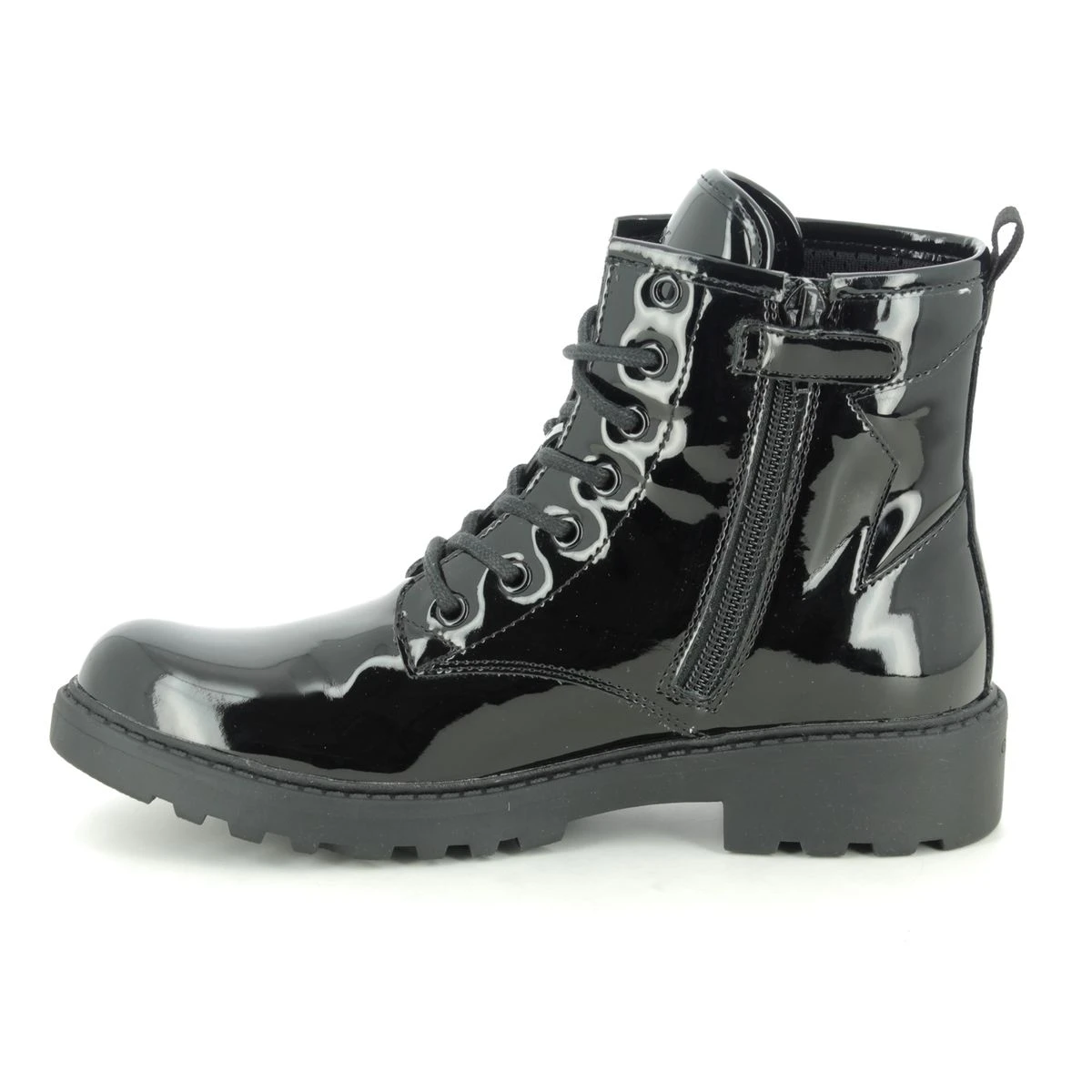 The Geox Casey Lace girls boots are bang on trend for the fashion savvy girl. These girls combat boots feature a shiny black patent upper made from high quality man made materials. The girls lace up boots offer a secure and adjustable fastening and the chunky sole unit is similar to the Doc Marten style. Perfect for school or weekend your little girl will love her new combat boots.