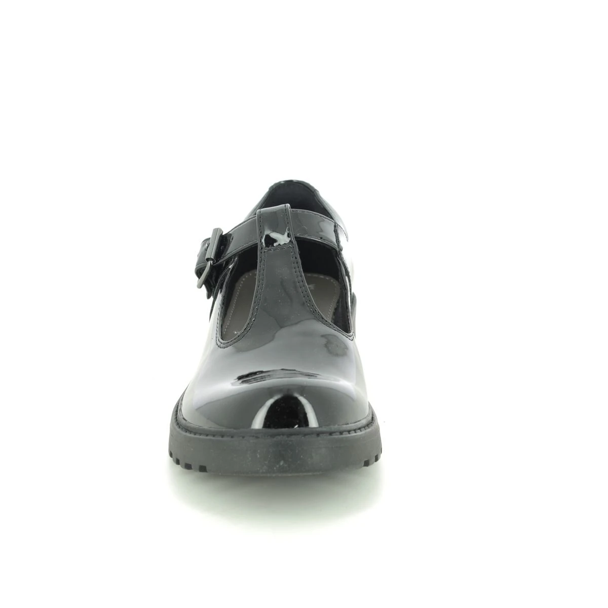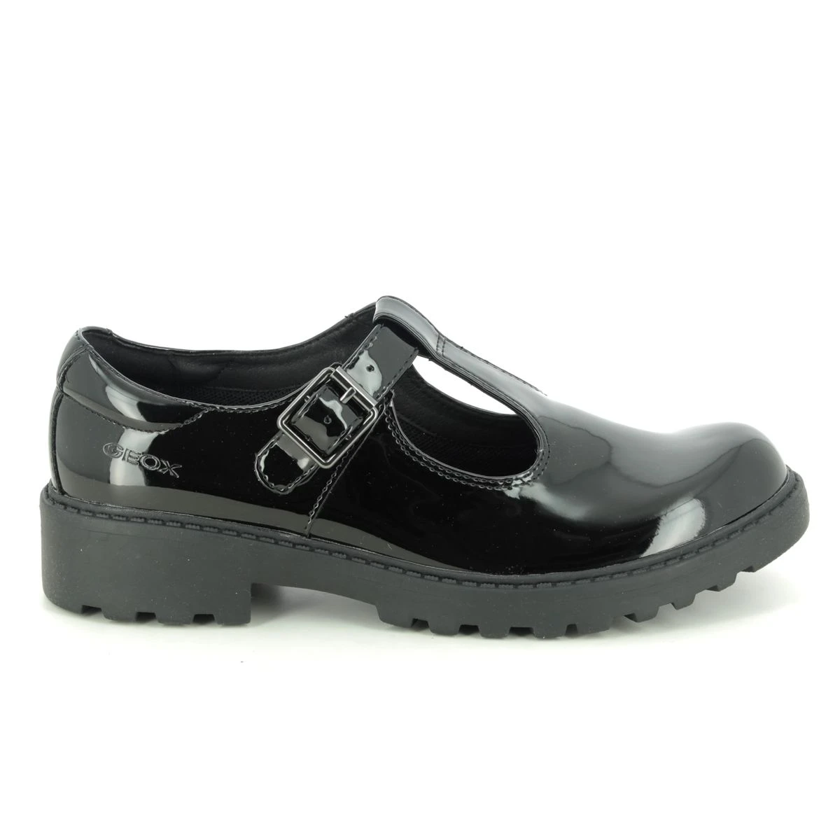 The Geox Casey T Bar girls shoes are a smart style for school uniform. The black patent effect upper has a smart shiny finish made from high quality man made materials. The T bar strap is adjustable and ensures a snug and secure fit. The chunky grooved sole unit offers additional durability.