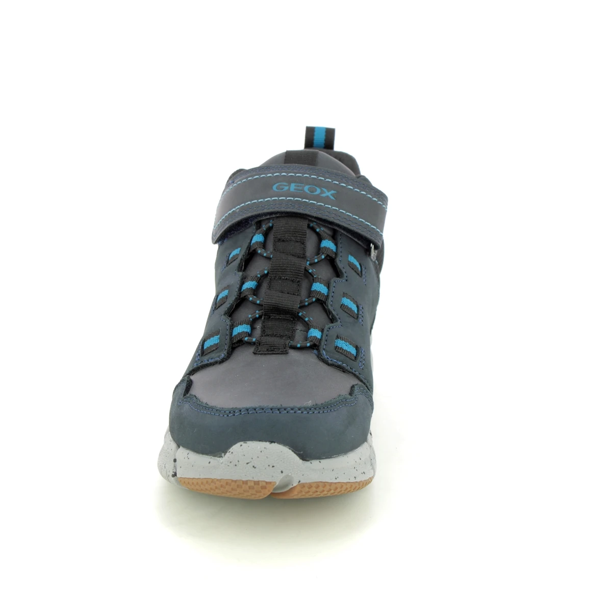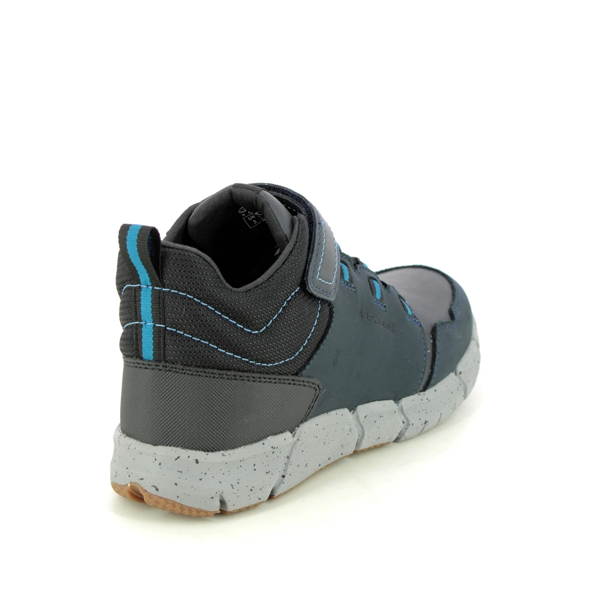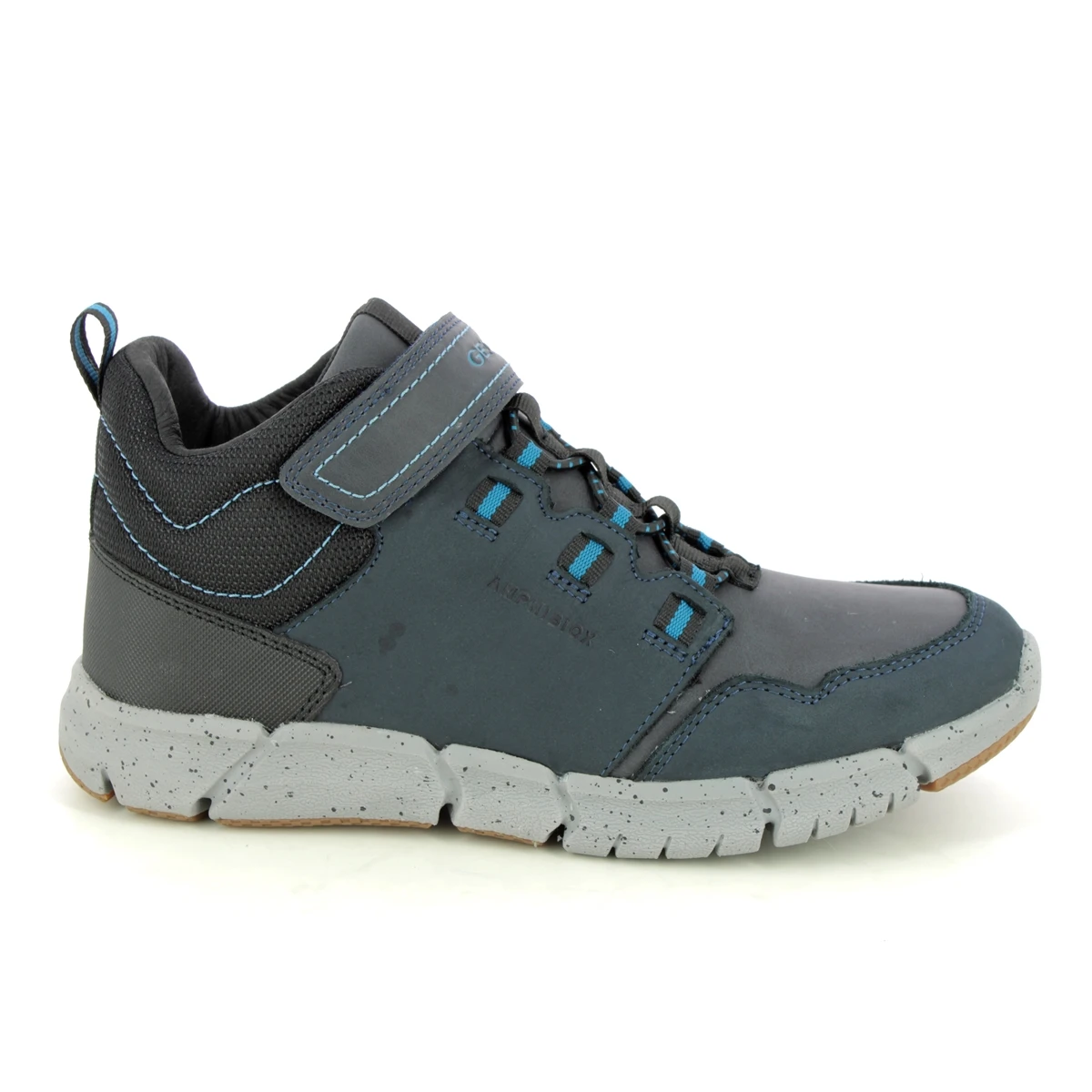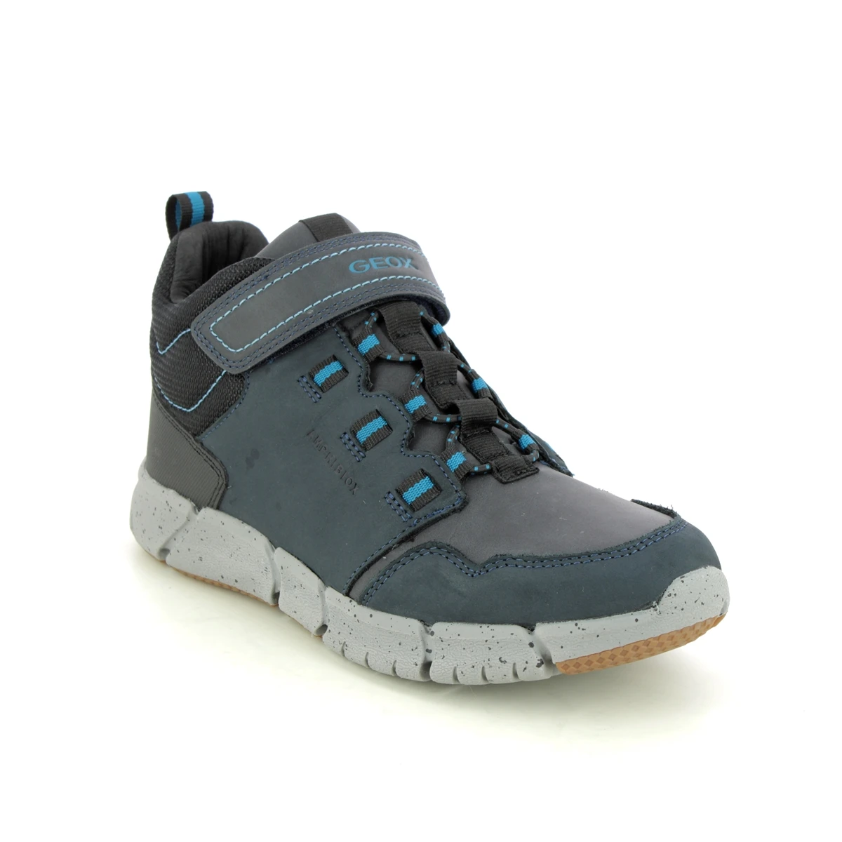 The Geox Flexyper B Tex boys hi top trainers are stylish. These boys navy boots feature leather and man-made upper with Amphibiox waterproof membrane which is breathable too. The distinctive sole is cleated for improved grip.