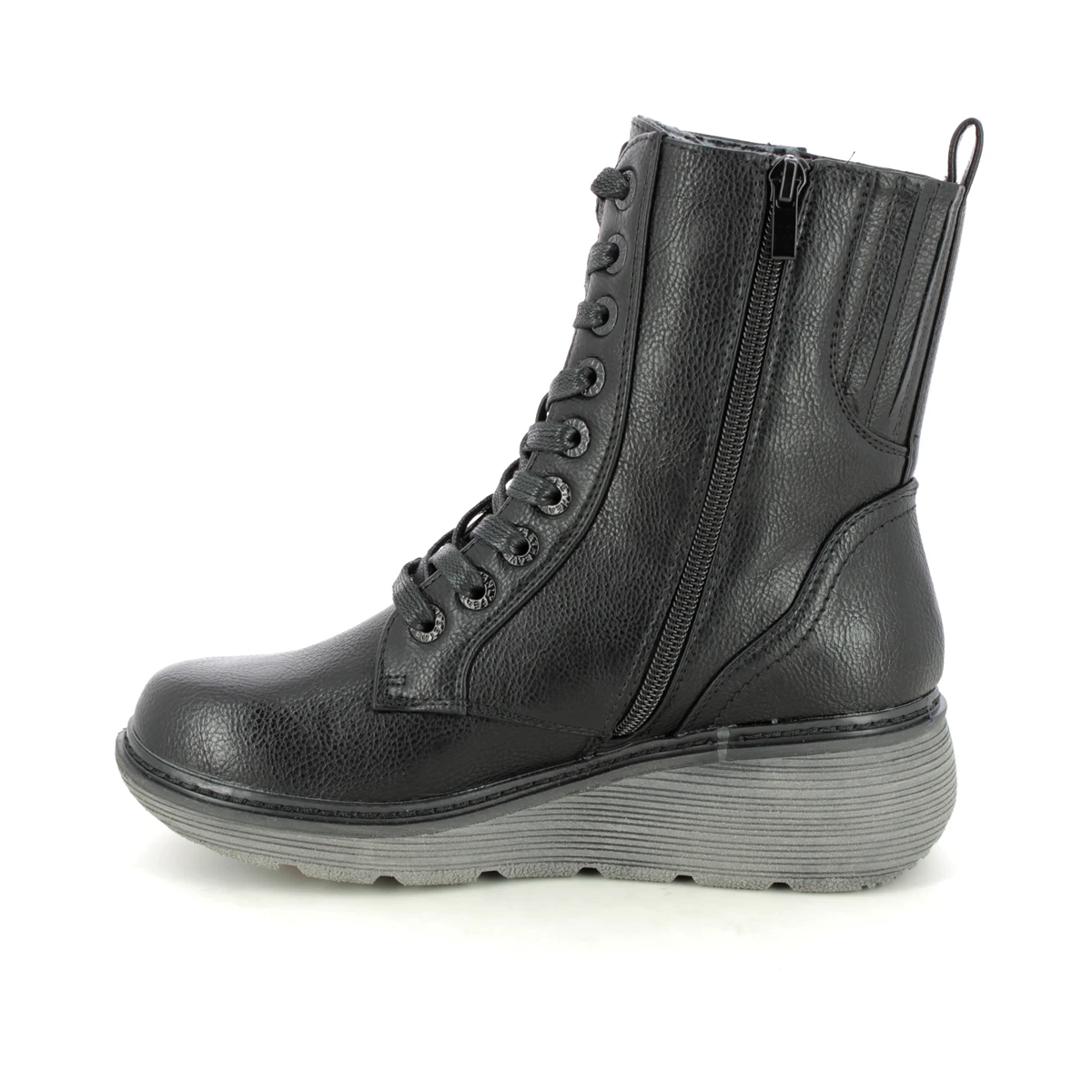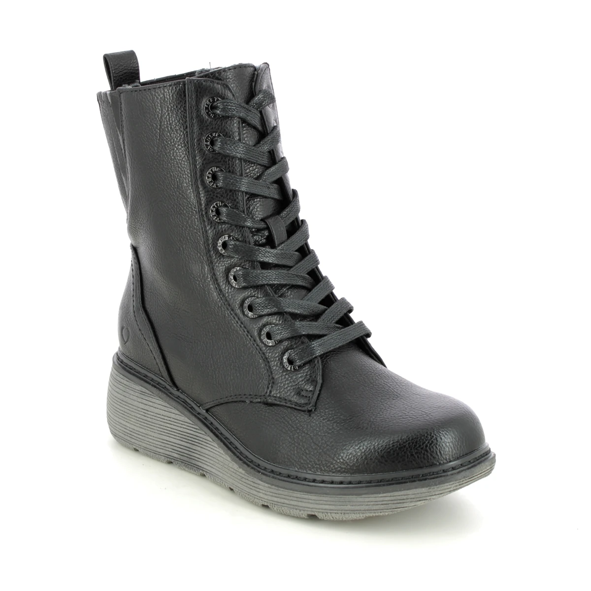 Heavenly Feet Festival Wedge women’s black lace up boots are versatile. The women’s black Vegan boots have a smooth man-made upper with a chunky wedge rubber sole for extra height and underfoot support.