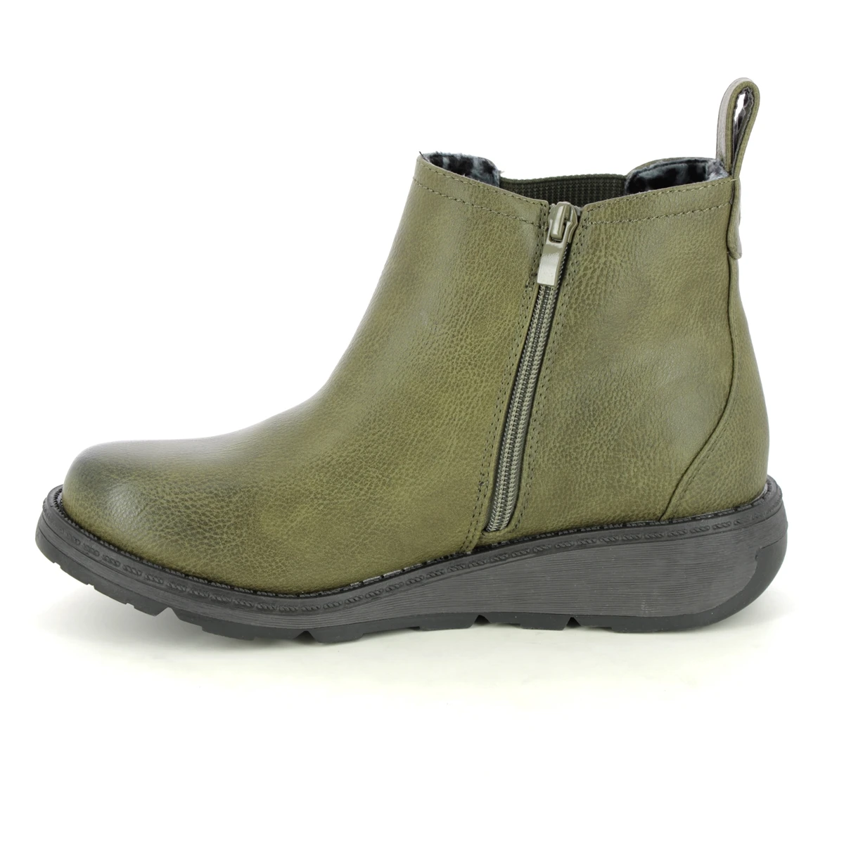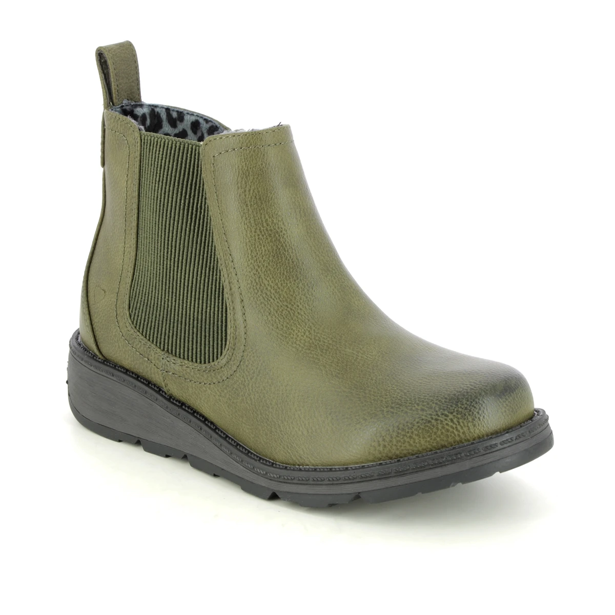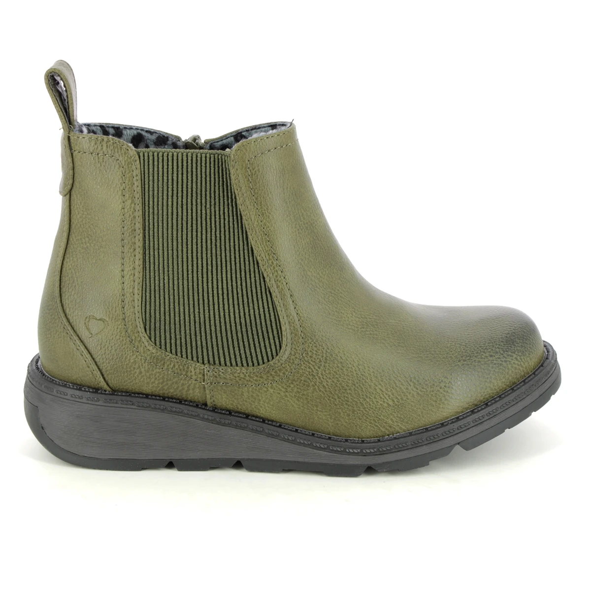 The Heavenly Feet Rolo 4 women’s green Chelsea boots are back for another year in this season’s green hue. These khaki green ankle boots have a leopard print textile lining with a stretchy side panel for improved fit. Pair with turned up mom jeans and a khaki knit jumper.