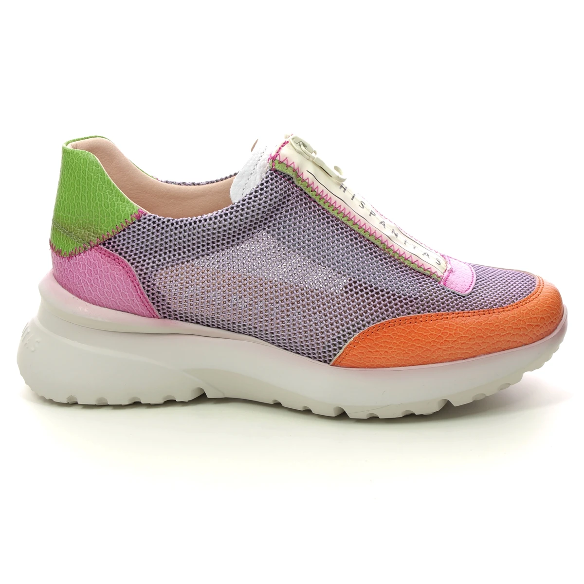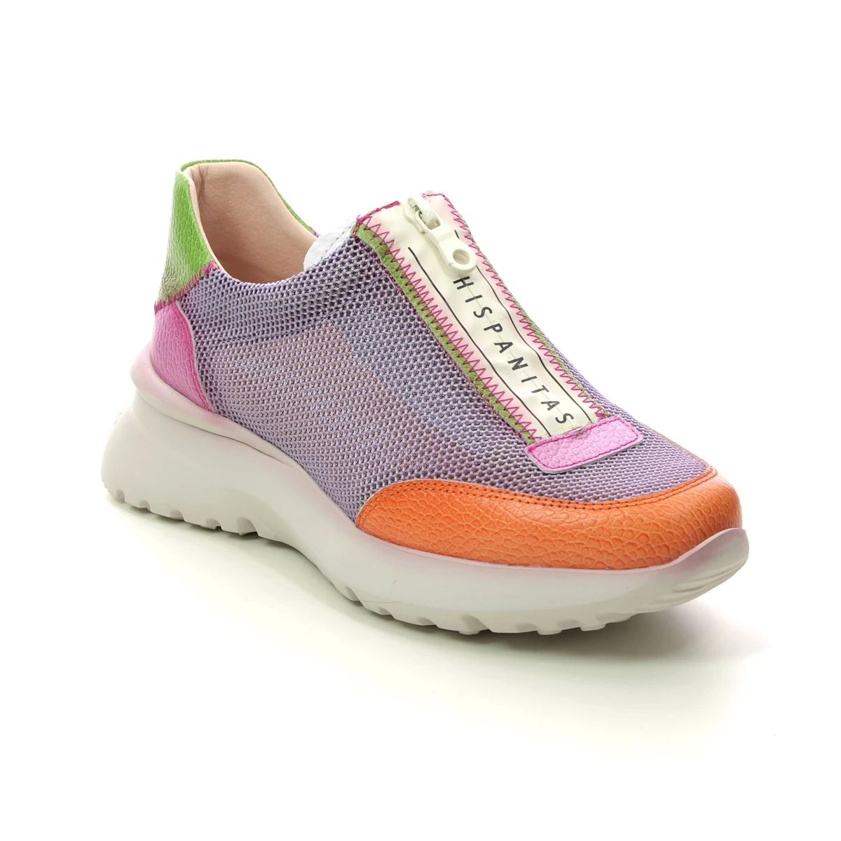 The Hispanitas Polinesia Wedge women’s purple trainers are colourful and fun. These women’s zip trainers have a combination upper of mesh fabric and premium leather in bold colours of purple, orange, green and pink. Perfect for adding a pop of colour to your outfit, these women’s wedge trainers are made from premium materials. The padded leather footbed offers superior comfort underfoot, and is full removable should you wish to use your own insoles. The chunky white sole measures 55mm for extra support and height underfoot.
