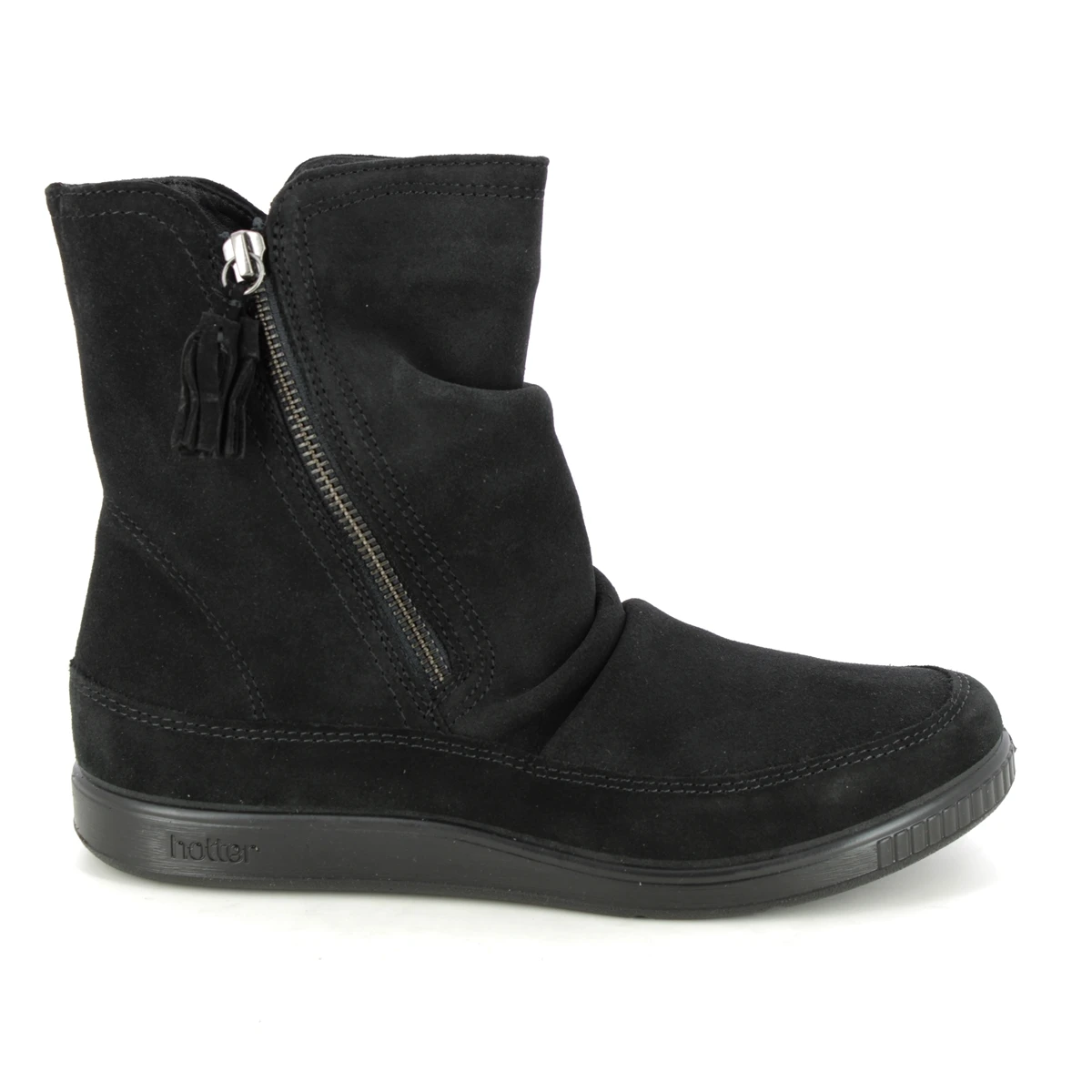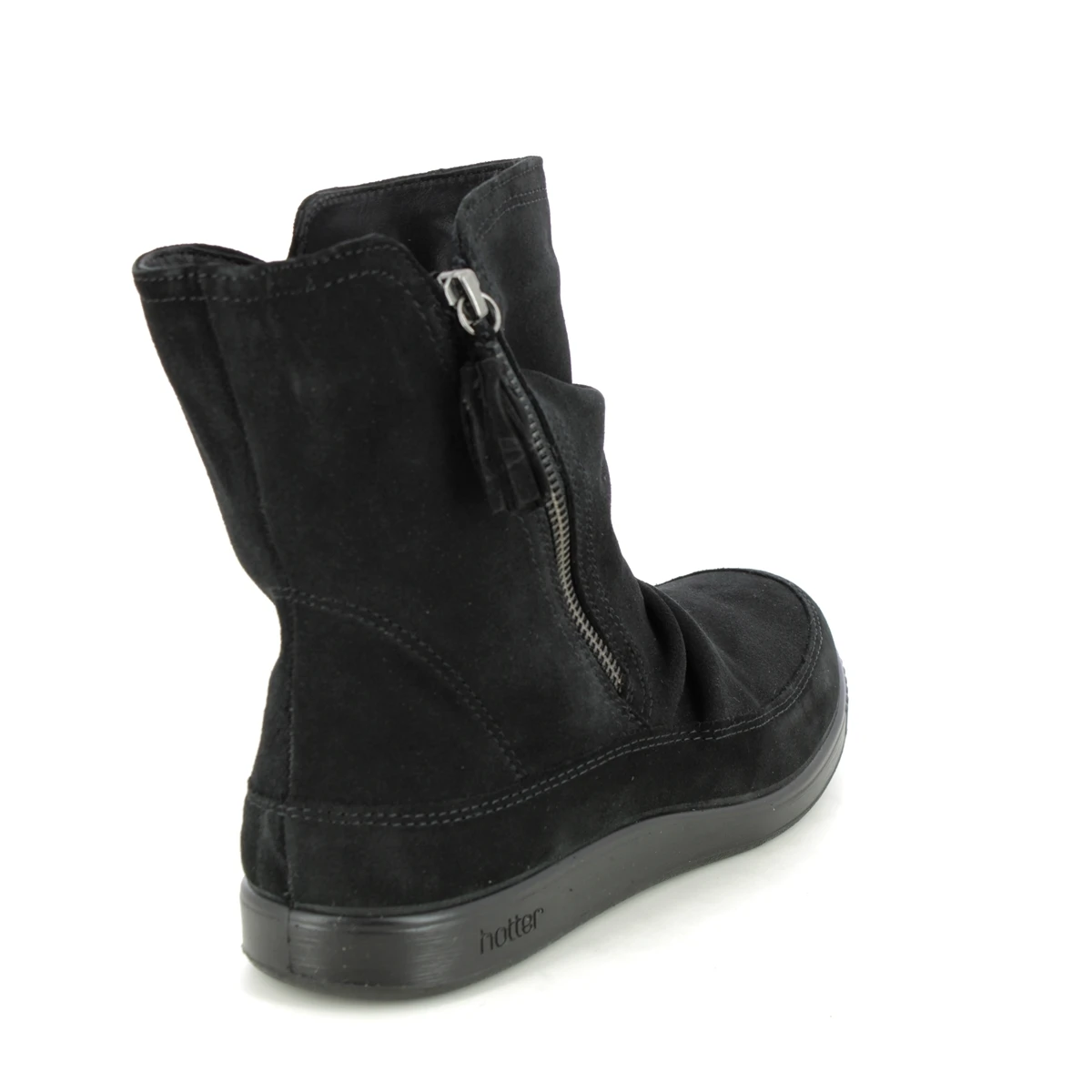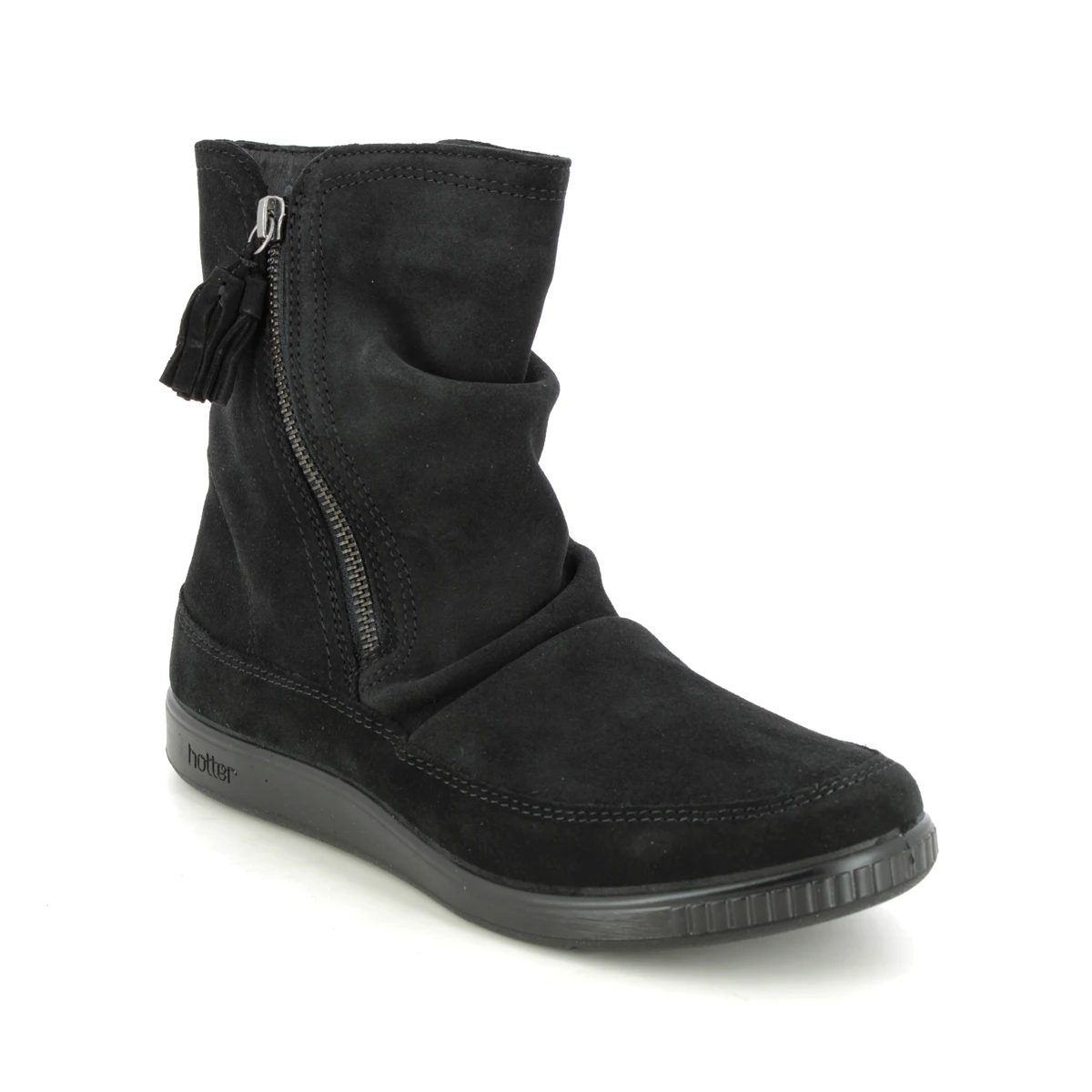Hotter Pixie 3 Wide women’s black ankle boots are comfortable and wide fitting. These women’s suede ankle boots have a soft upper which is flexible and breathable. The exterior functional zip has a tassle detail and the low profile of these boots offers comfort and stability.