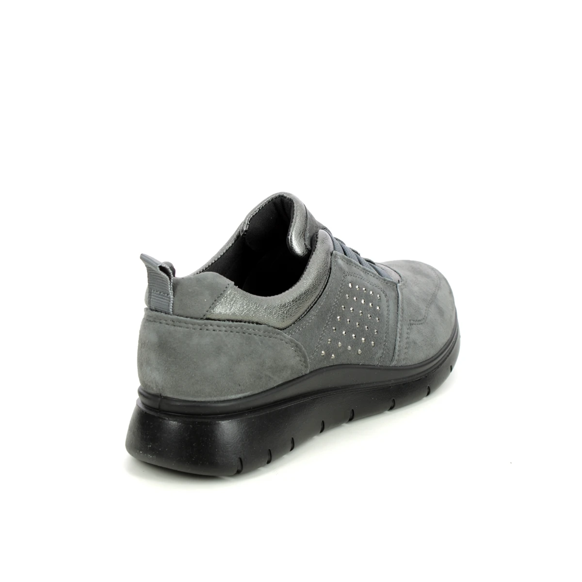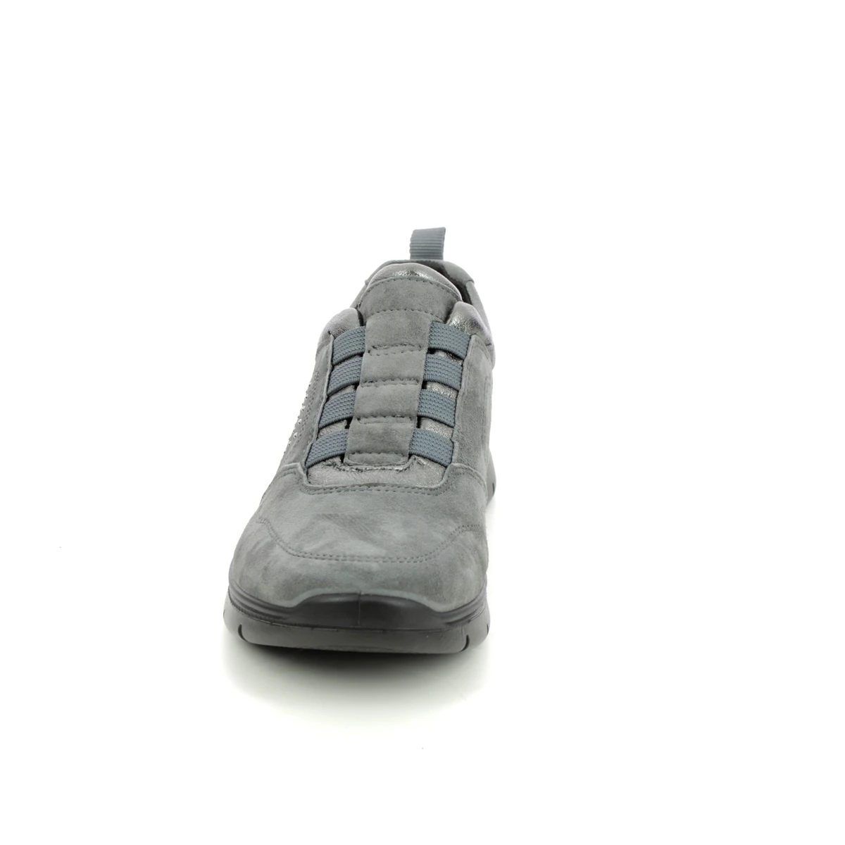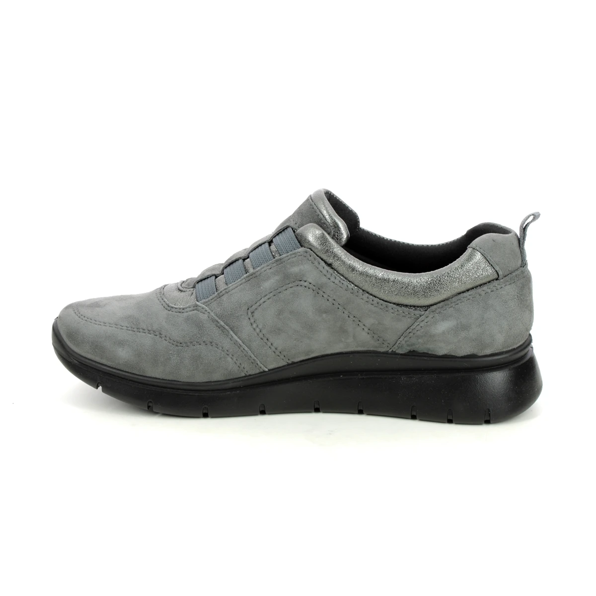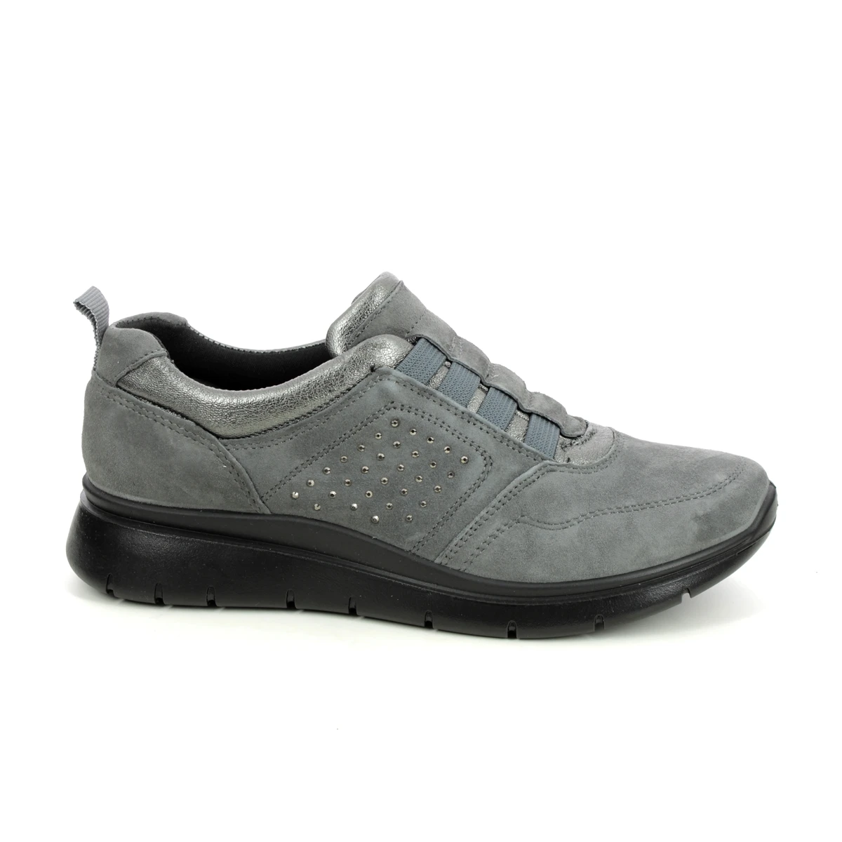 Imac Katia womens grey suede slip on shoes offer excellent everyday comfort. These womens grey slip on trainers have a soft suede leather upper with subtle shimmer leather trims and sparkling gemstones. The elastic straps over the padded tongue offer easy slip on fit whilst the padded lining ensures your feet are cocooned in comfort.