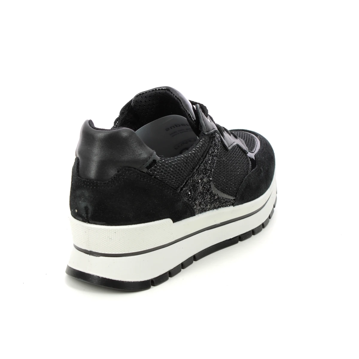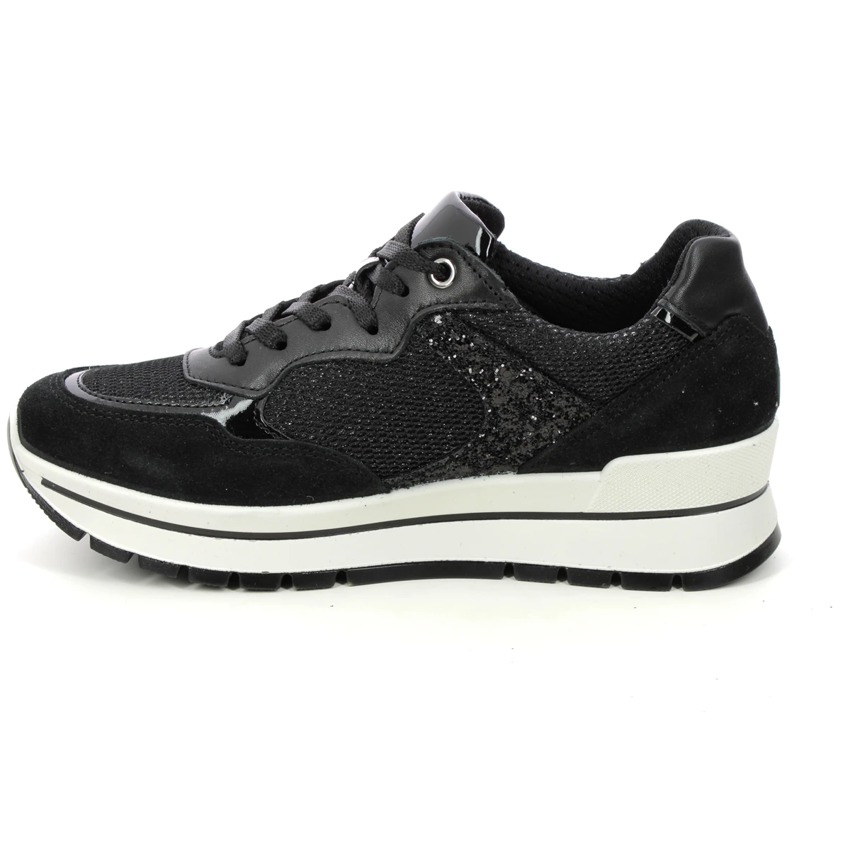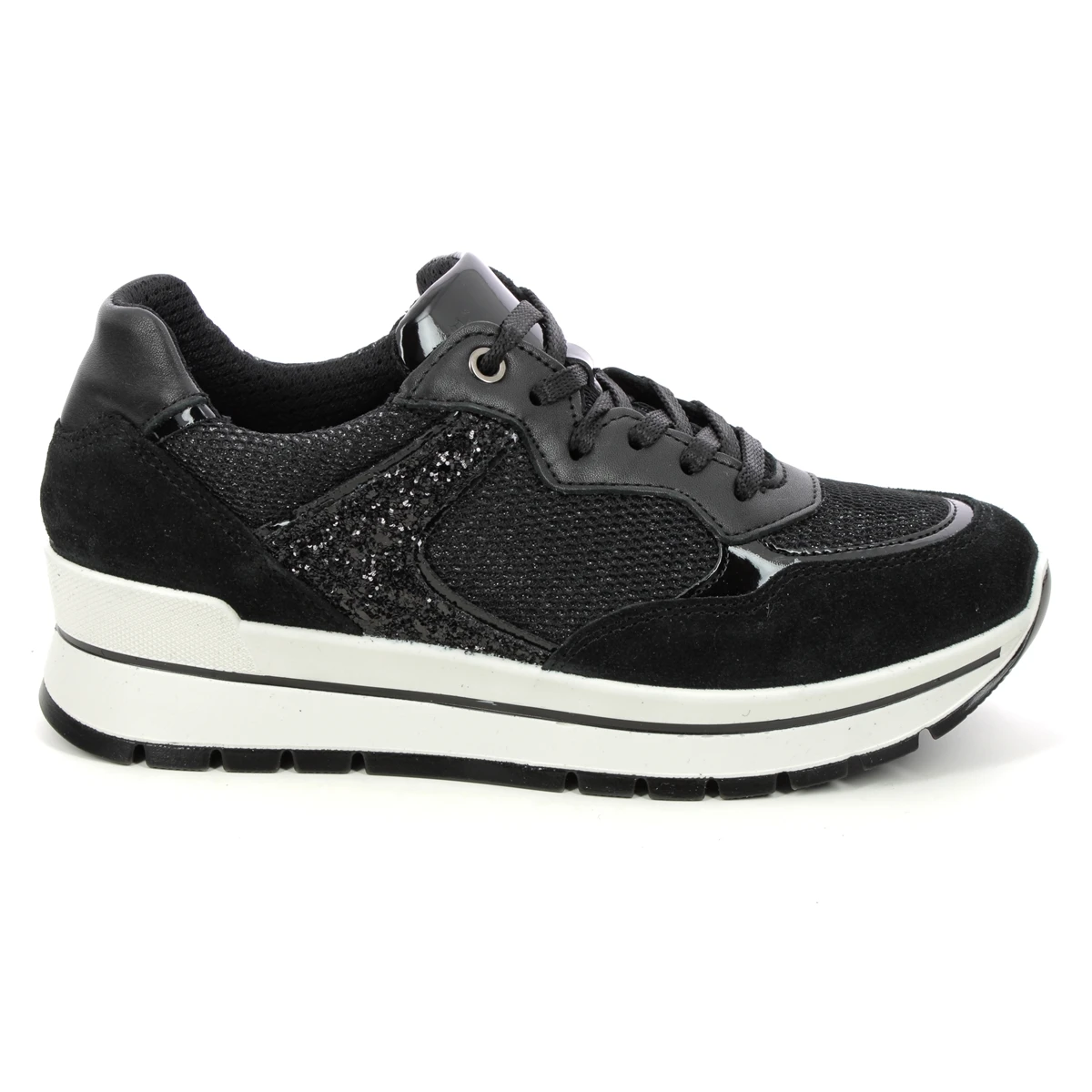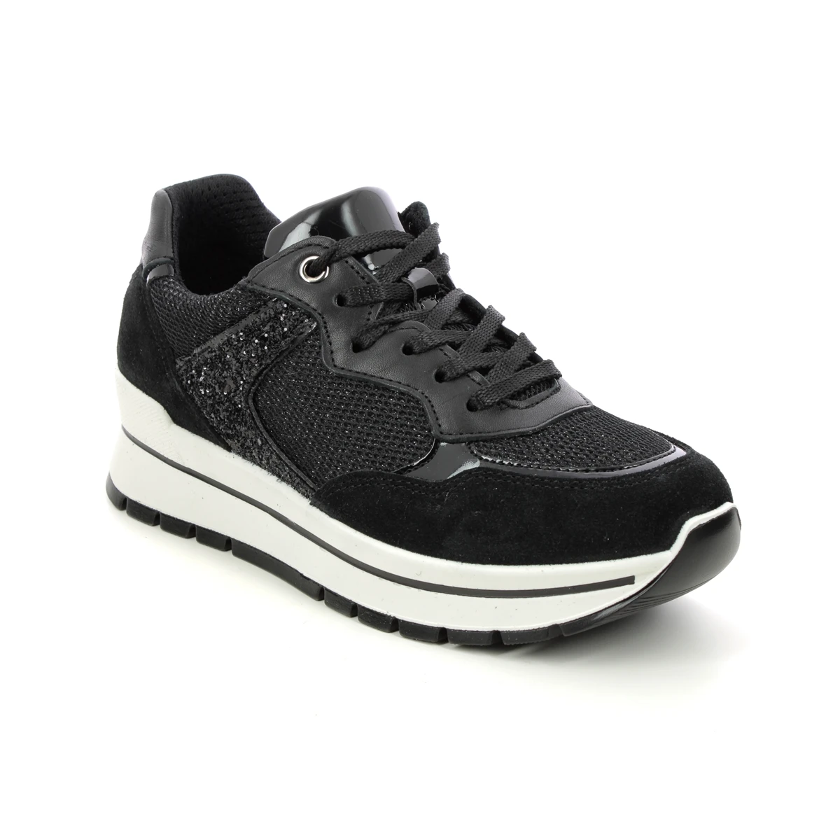 The Imac Anika Flatform women’s black trainers are stylish and fun. These women’s black sparkly trainers have a combination upper of soft suede, glittery panels and breathable mesh fabric. The laces offer a secure and adjustable fastening whilst the padded lining and removable footbed offer superb comfort for your feet. These platform trainers have a contrasting white sole unit with black grooved outsole for additional traction, measuring approximately 40mm at the heel.