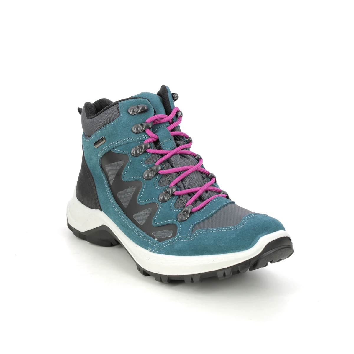 The Imac Geo Hi Tex women’s turquoise walking boots are waterproof and shock absorbent. These women’s hiking boots have a lovely pop of colour seen in the turquoise suede leather upper with bright pink adjustable laces. The padded lining and collar offers exceptional comfort during wear whilst the removable insole allows additional width if required. These women’s waterproof boots have a cleated outsole for excellent traction underfoot.