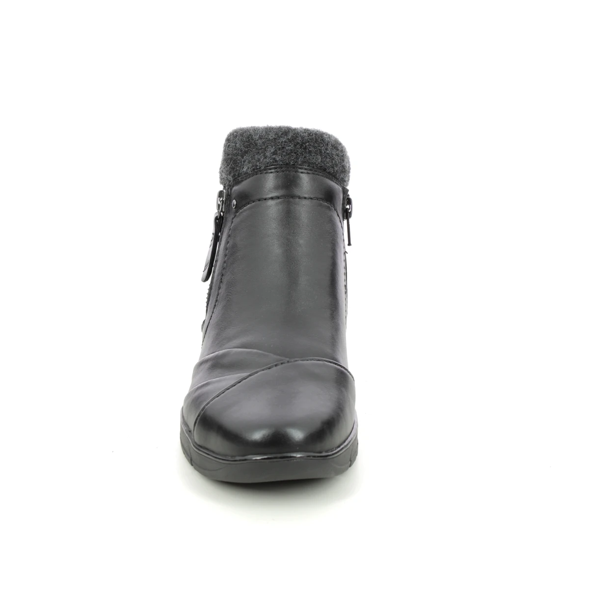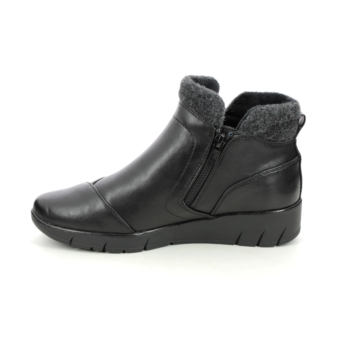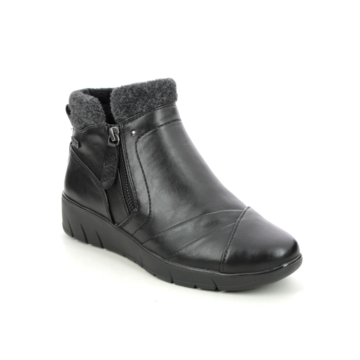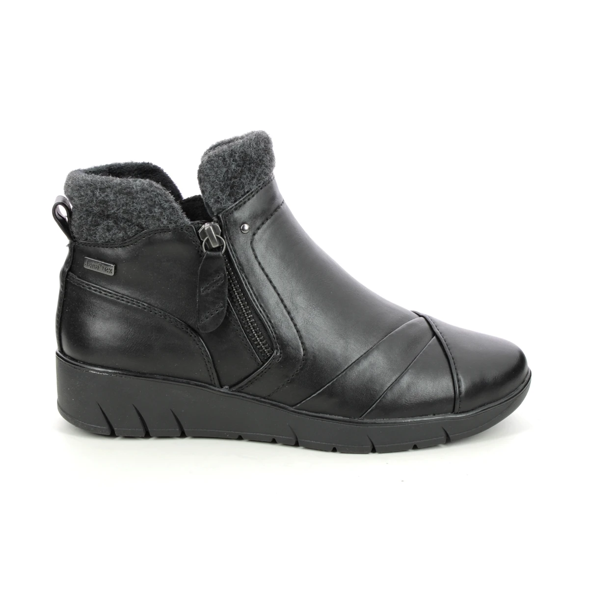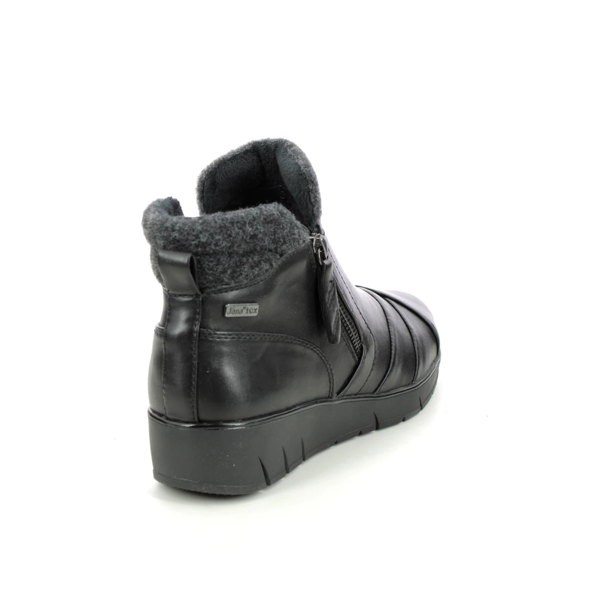 The Jana Boczip Wide Tex womens black ankle boots are wide fitting and waterproof. These womens waterproof boots have a cosy fleece cuff and soft textile lining that feels fantastic against your feet. These wide fit boots in black sit low on the ankle measuring just 11cm at the shaft making them suitable for wearing with trousers. There is a double zip entry and the H fit design offers even more space.