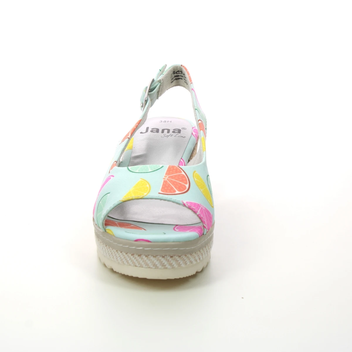 Jana Alicia Wide women’s blue wedge sandals are fun and refreshing. These women’s wide fit sandals have a light blue textile upper decorated with colourful citrus fruits, offering a fun print to your summer wardrobe. The peep toe and slingback buckle and strap continues the retro-inspired look, whilst the fruity pattern, cork wedge and woven midsole maintain the summery appearance. The platform wedge sole measures 60mm at the heel for extra height and support underfoot.