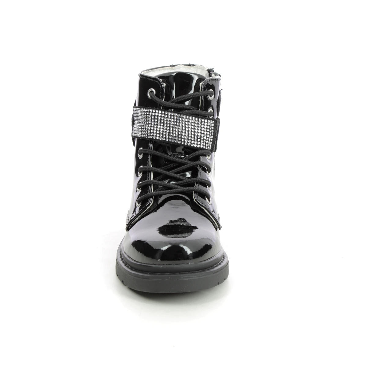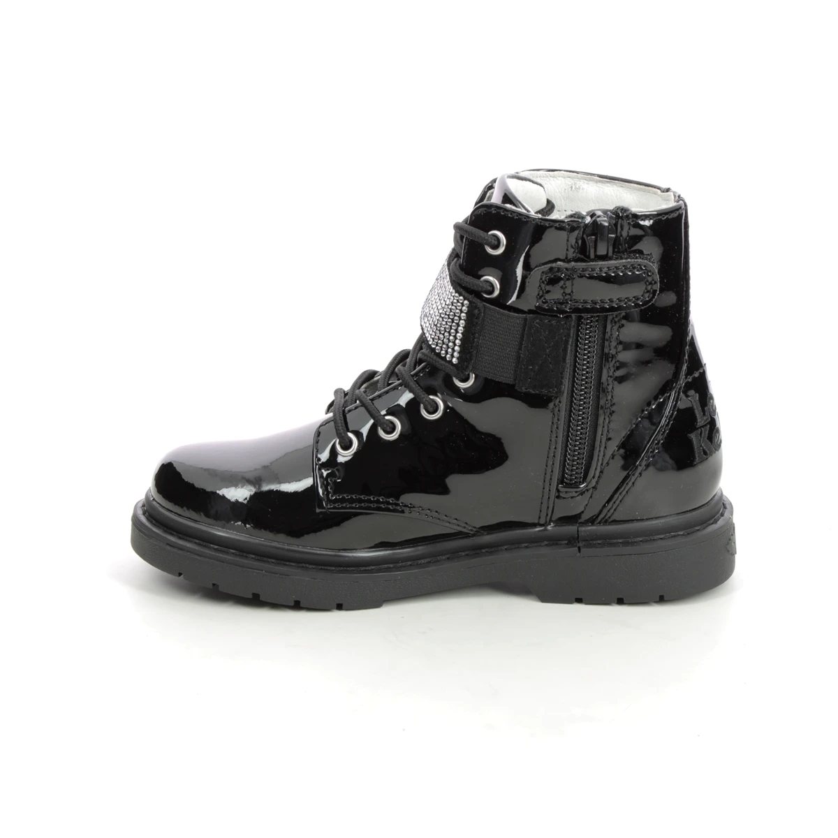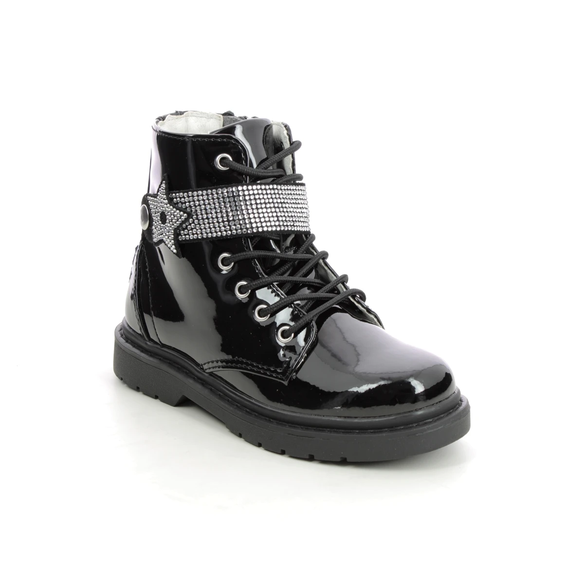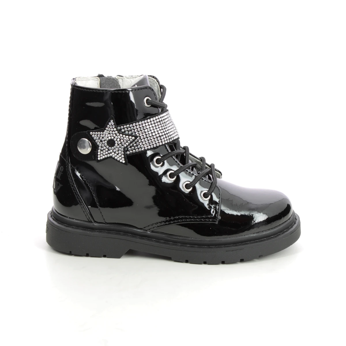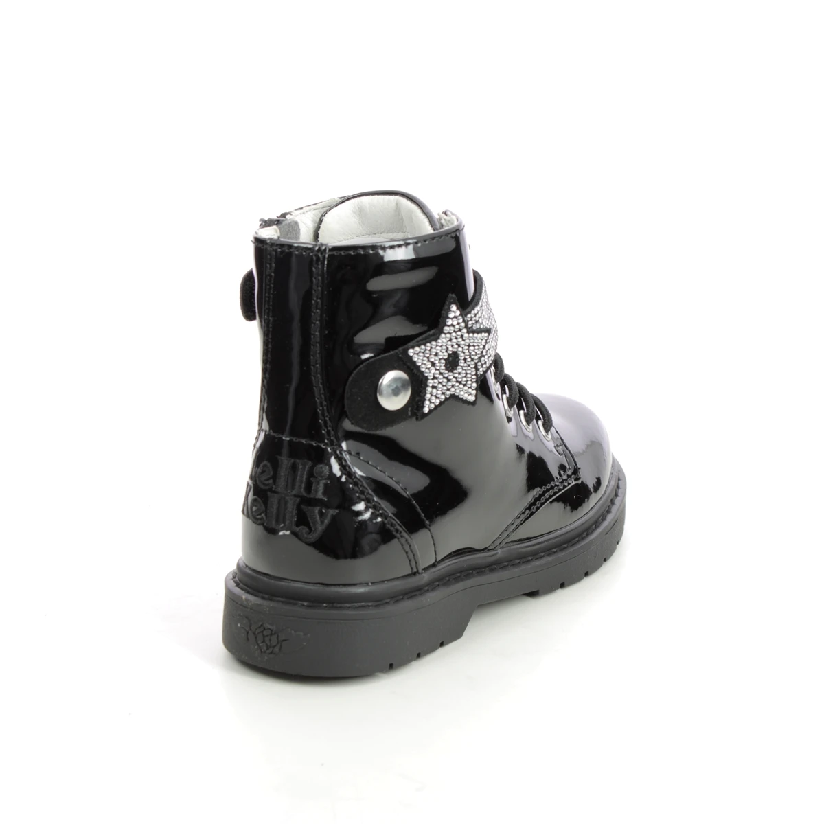 Lelli Kelly Stella Stellina girls black boots are stylish and snazzy. These girls boots have a shiny patent leather upper with a stylish studded strap in the shape of a shooting star. Laces offer a secure fastening whilst the padded footbed ensures super comfort.